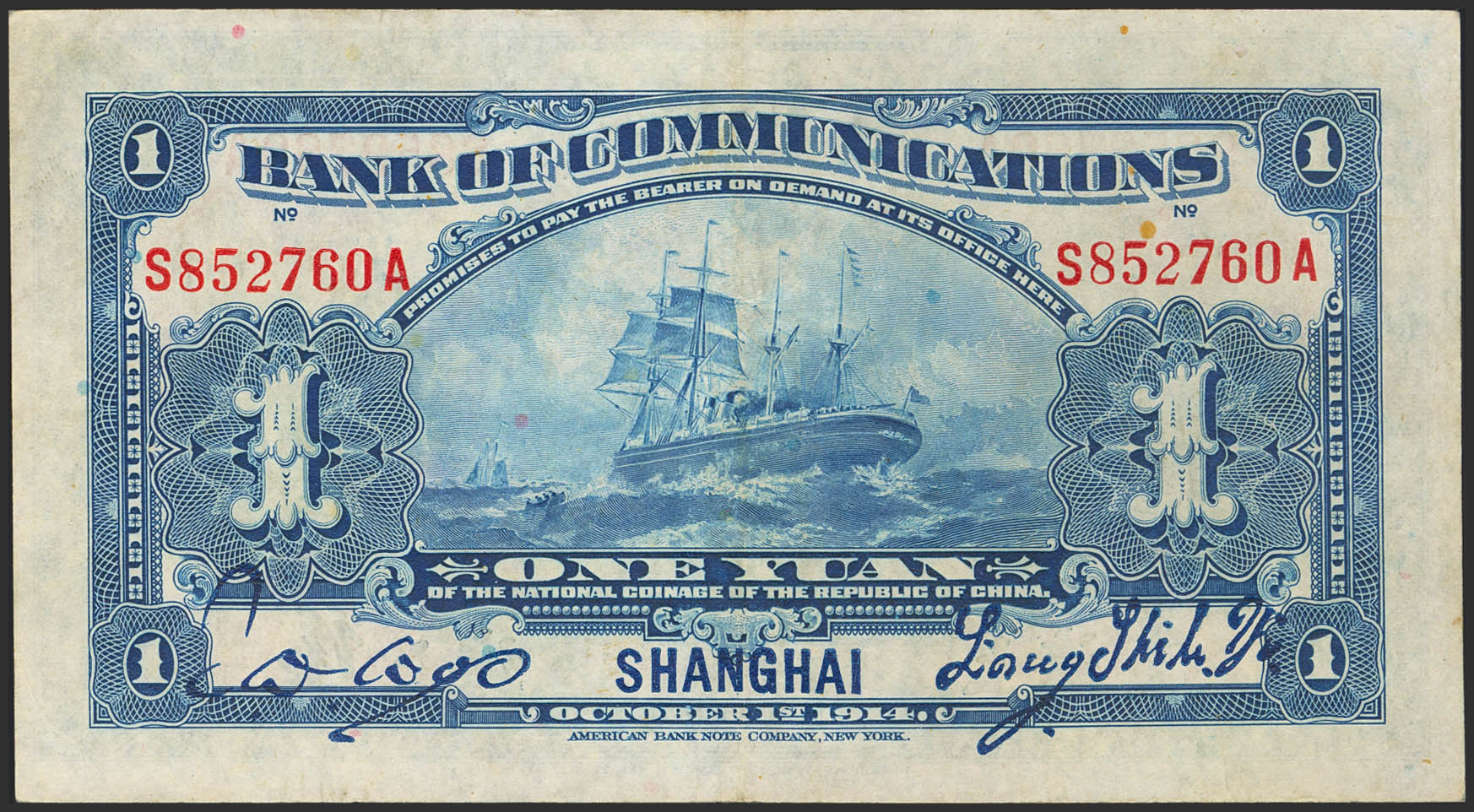 CHINA. 1 Yuan. 1 October 1914. Shanghai. Bank of Communications. (Pick: 116o). More than Extremely Fine.