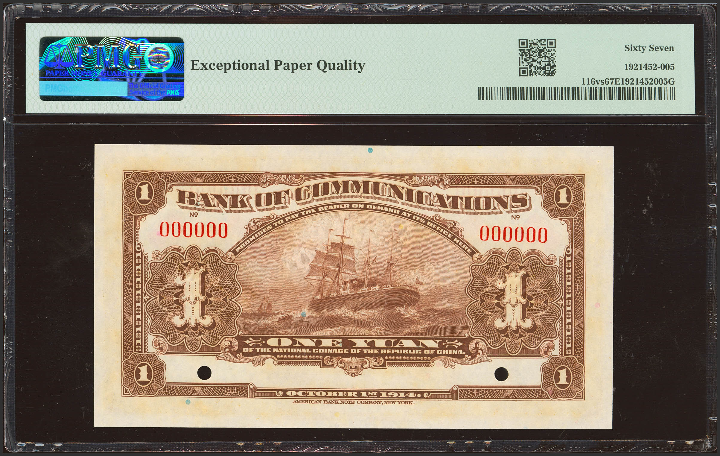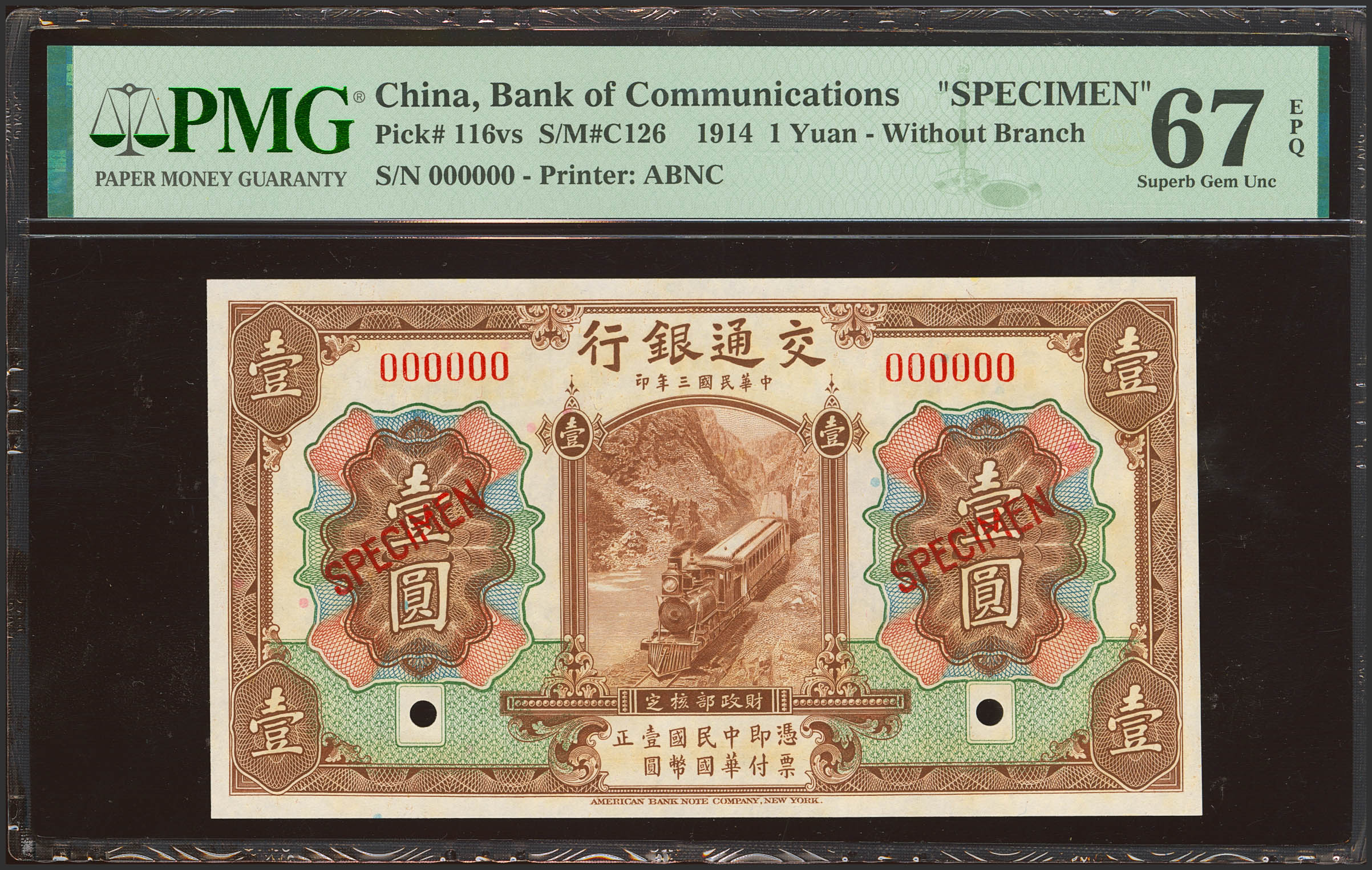 CHINA. 1 Yuan. 1 October 1914. Bank of Communications. Specimen. (Pick: 116s, SM: C126). PMG67EPQ (according to the PMG population report, it is the second highest qualified banknote as of 15 February 2025).