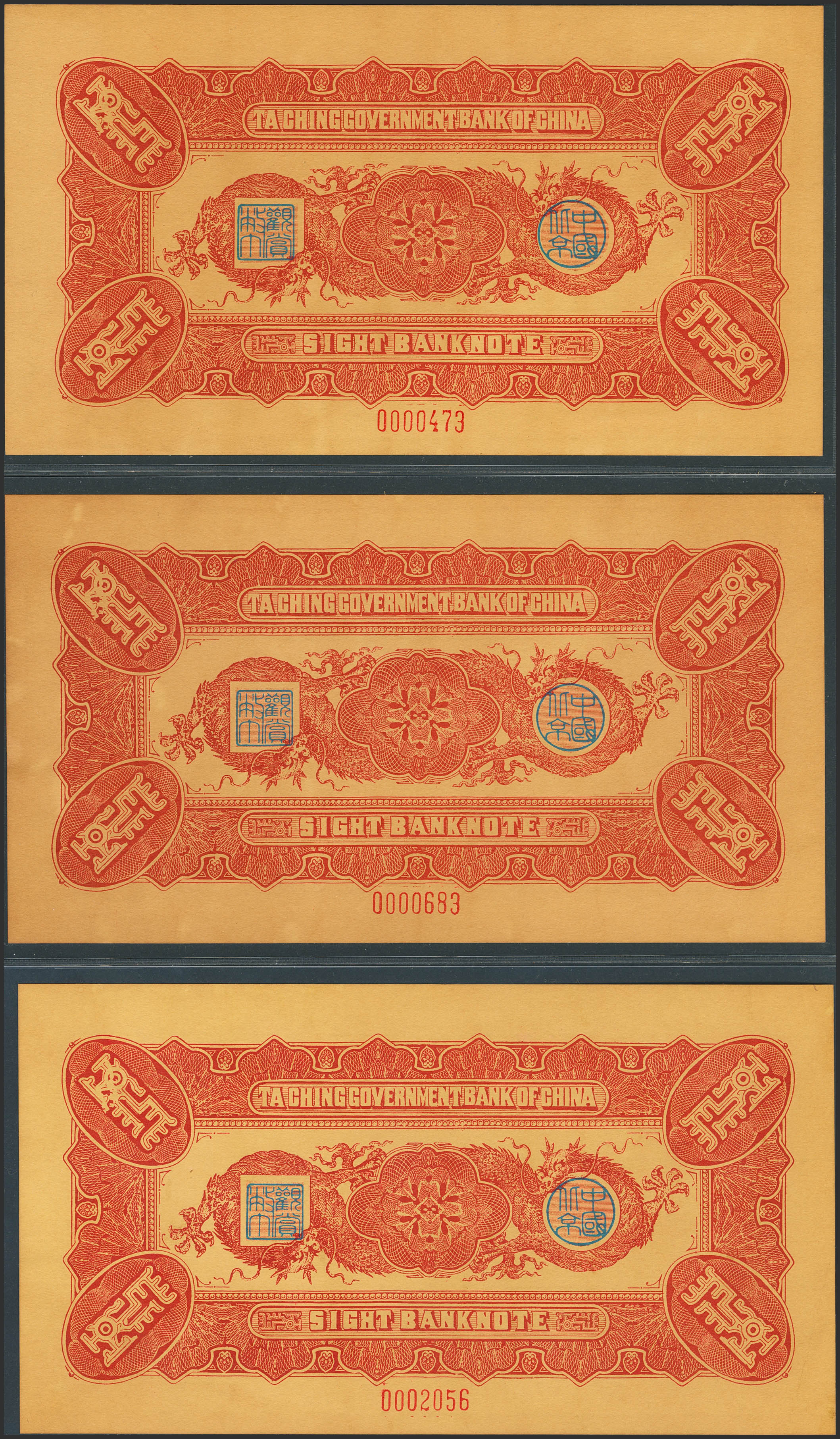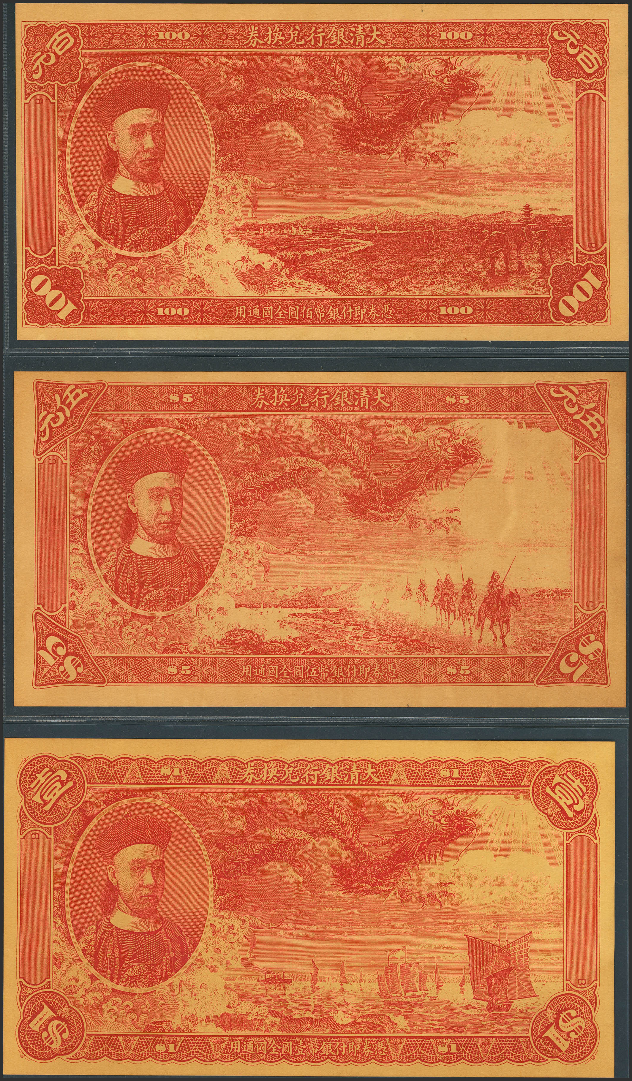 CHINA. Lot of 3 notes of 1, 5 and 100 Dollars. (1910ca). Ta Ching Government Bank Reproductions. (Pick: A79x). Less than Uncirculated.