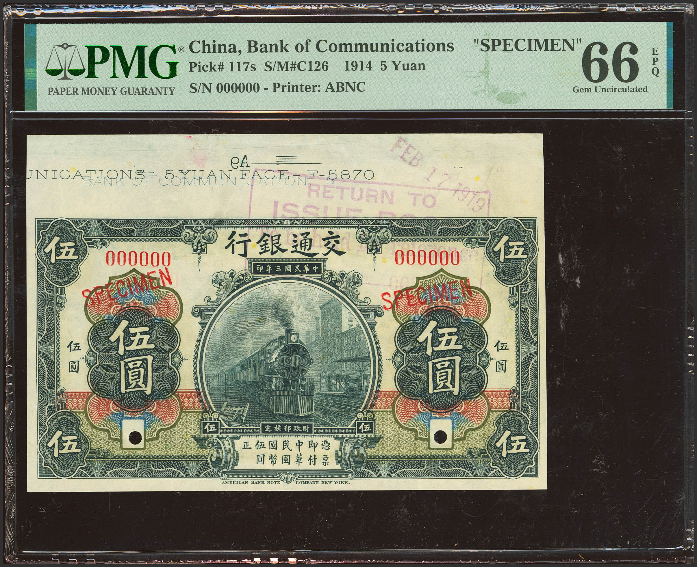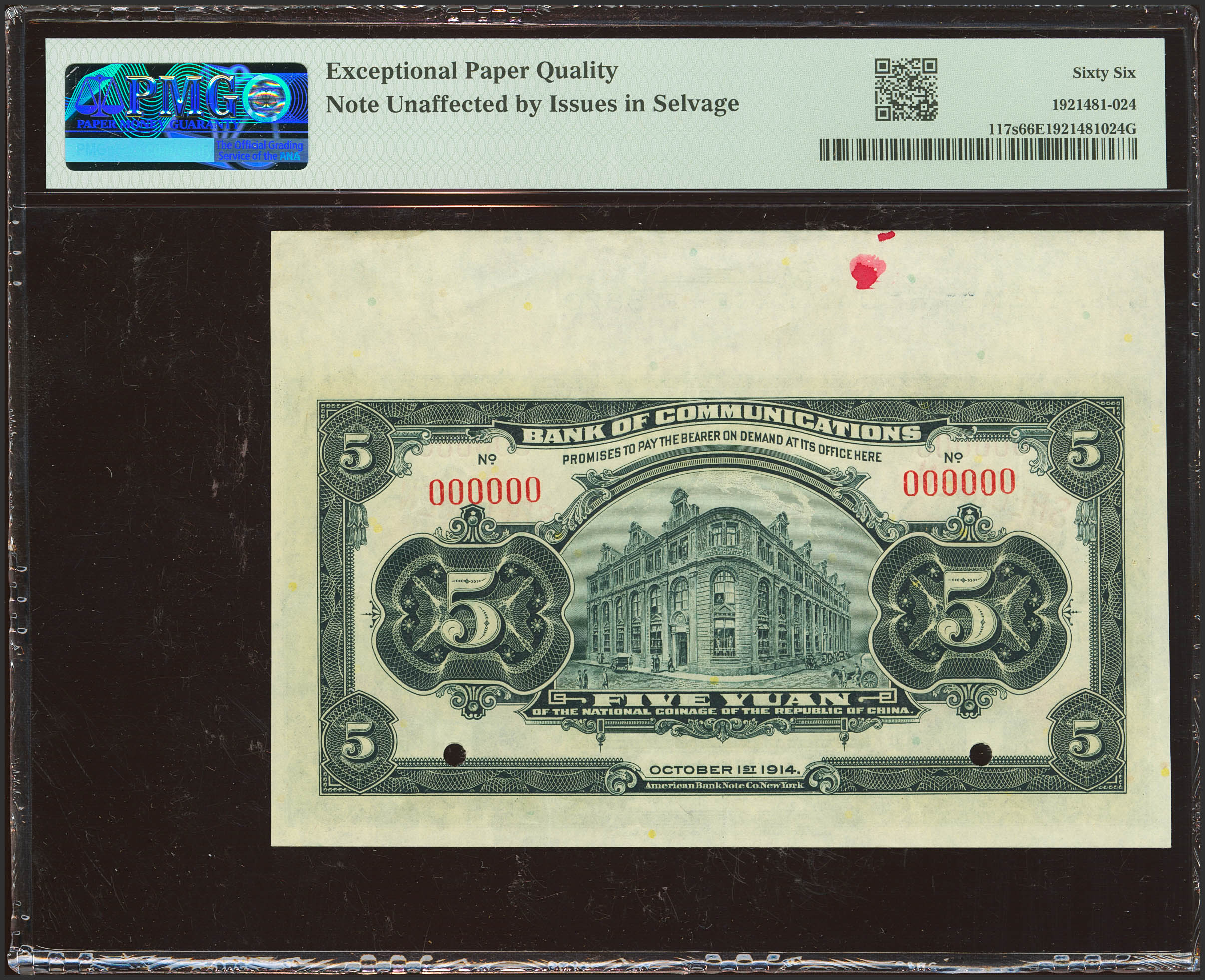 CHINA. 5 Yuan. 1 October 1914. Bank of Communication. Specimen. (Pick: 117s, SM: C126). PMG66EPQ (note unaffected by issues in selvage).