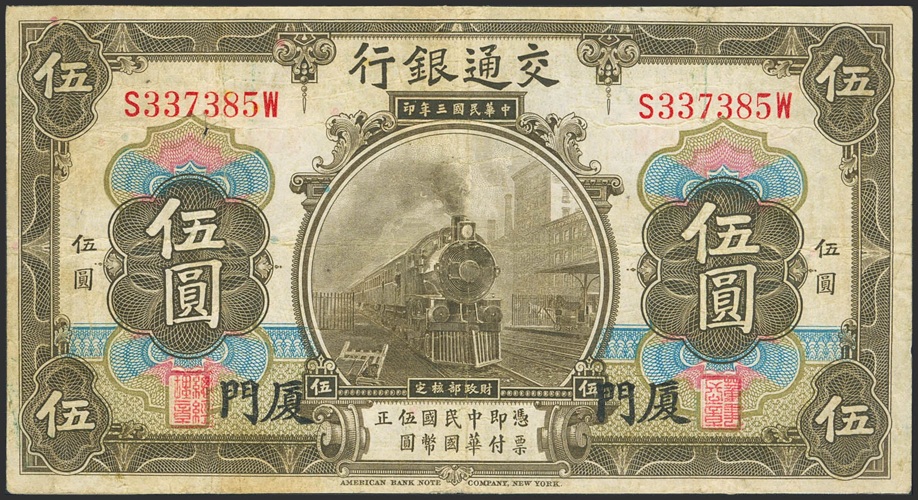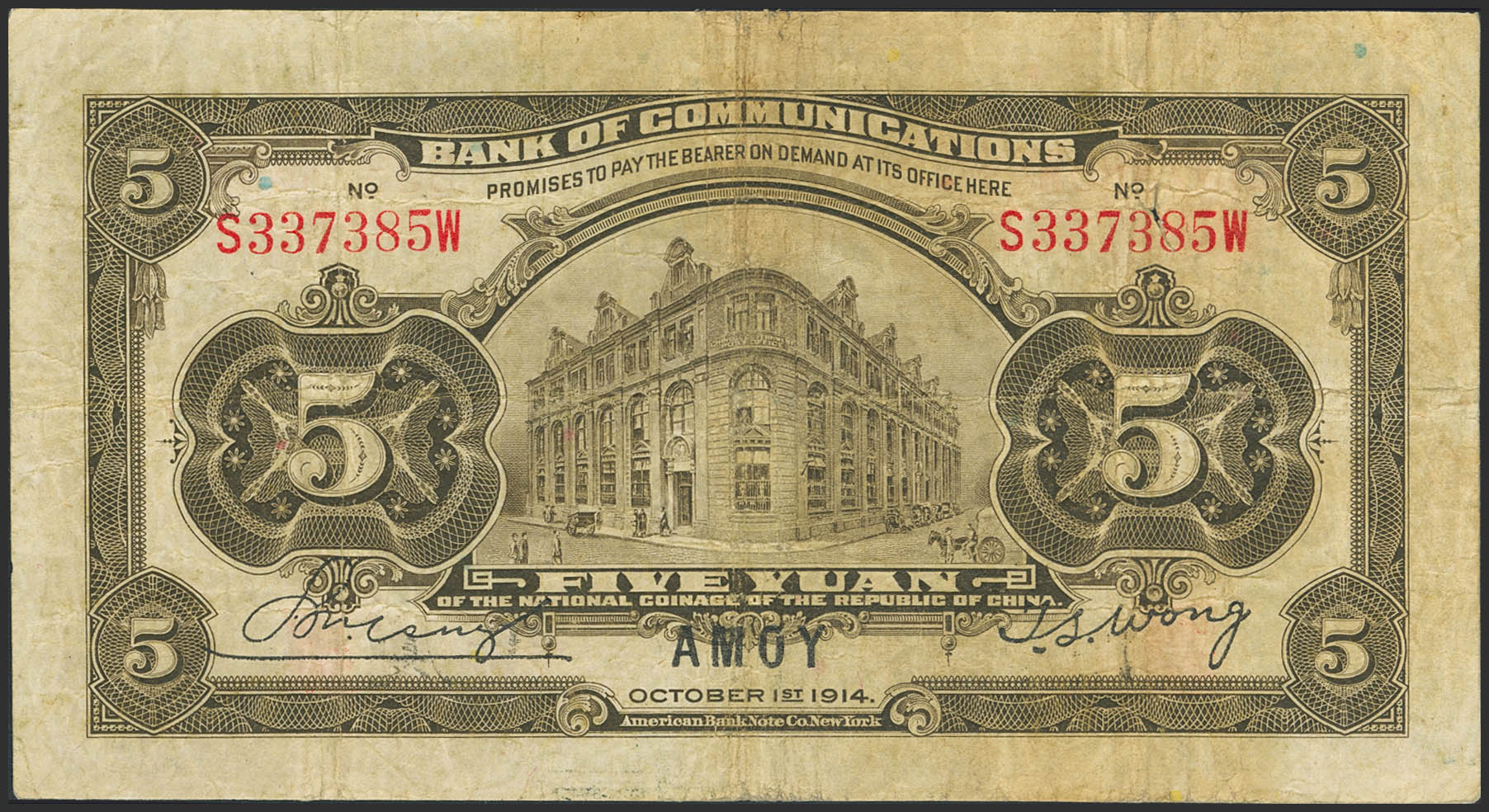 CHINA. 5 Yuan. 1 October 1914. Bank of Communications. Amoy. (Pick: 117a). Fine.