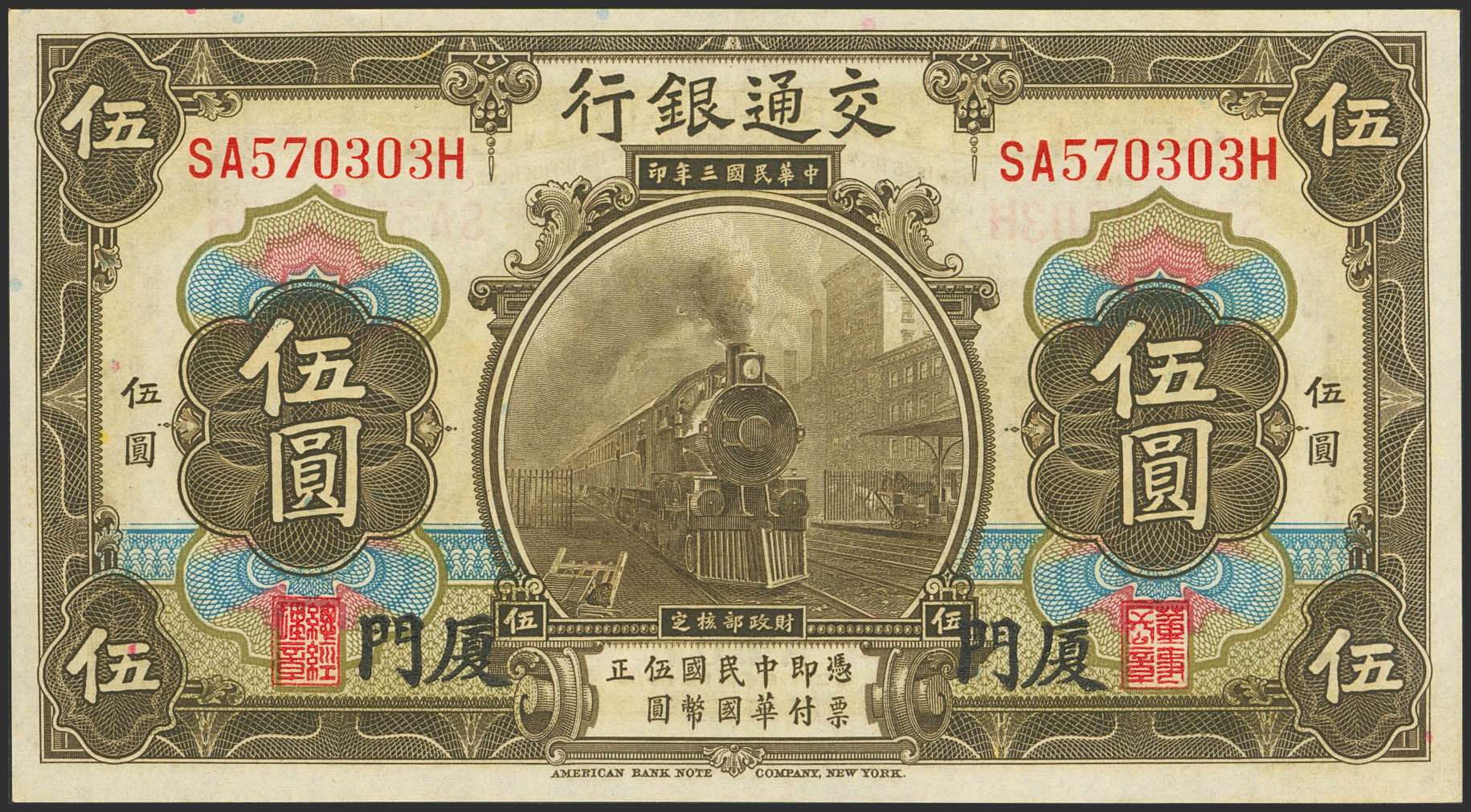 CHINA. 5 Yuan. 1 October 1914. Bank of Communications. Amoy. (Pick: 117a). Almost Uncirculated.