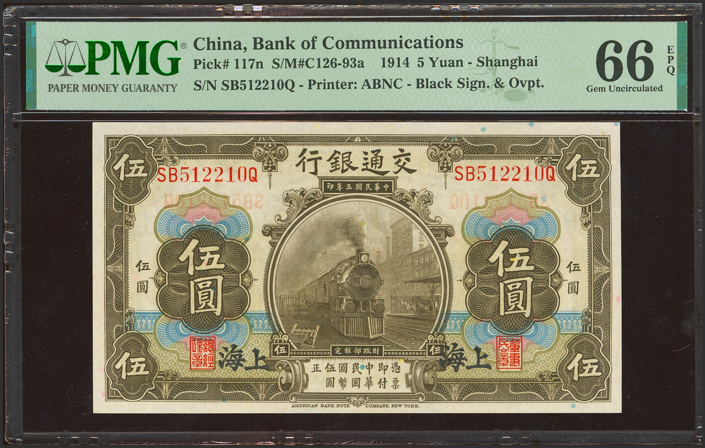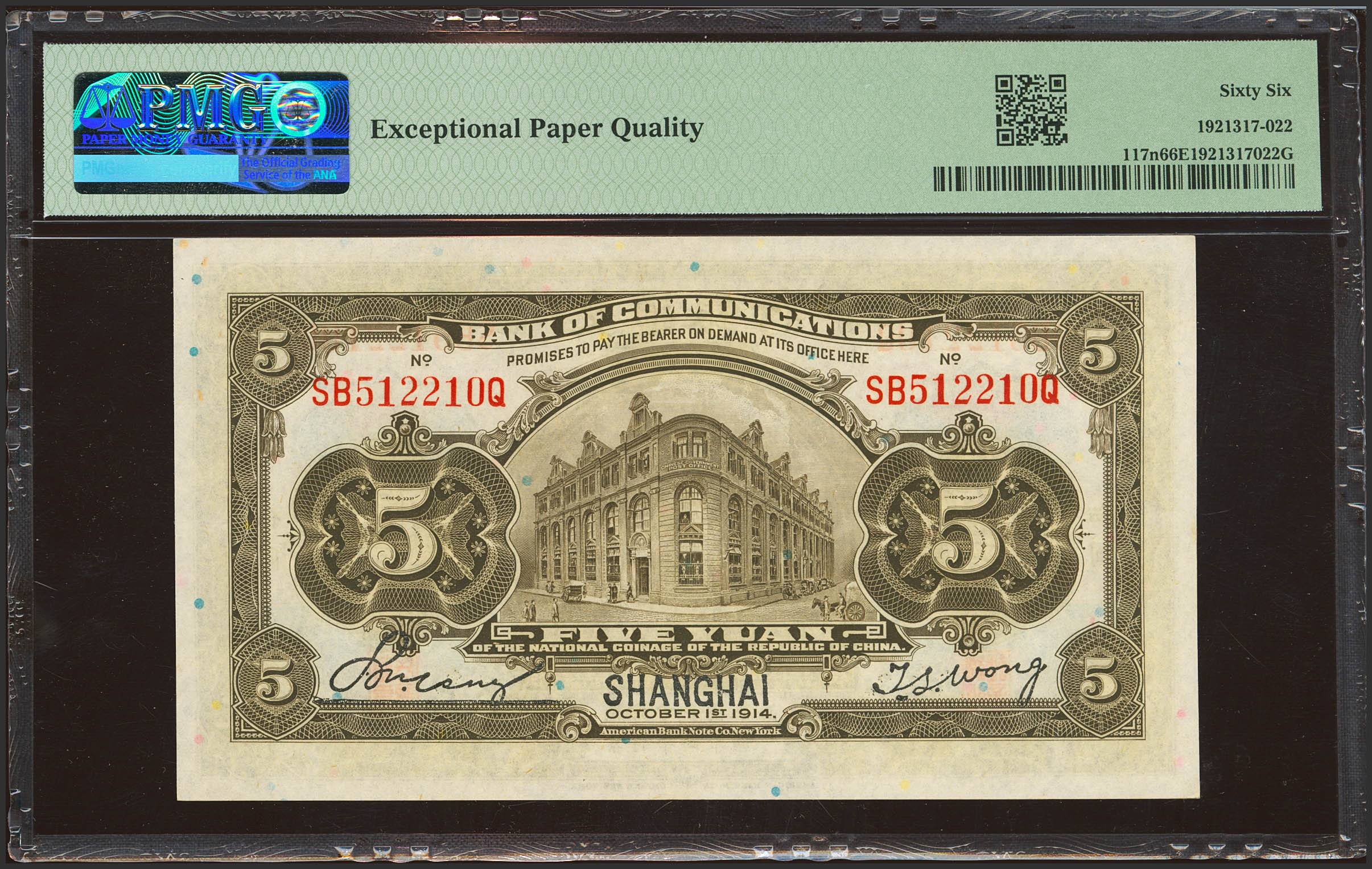 CHINA. 5 Yuan. 1 October 1914. Bank of Communications. Shanghai. (Pick: 117n, SM: C126-93a). PMG66EPQ.