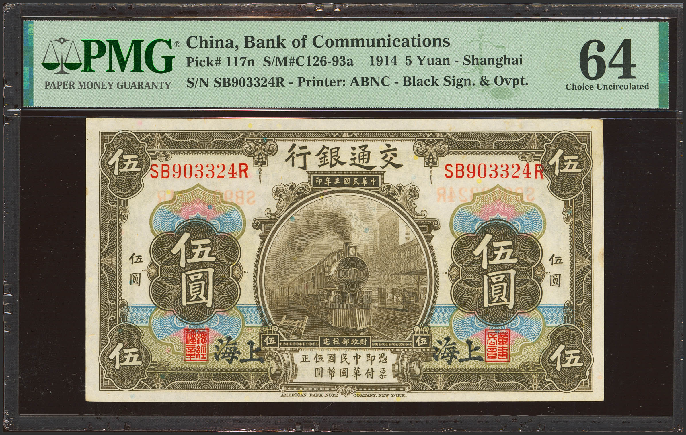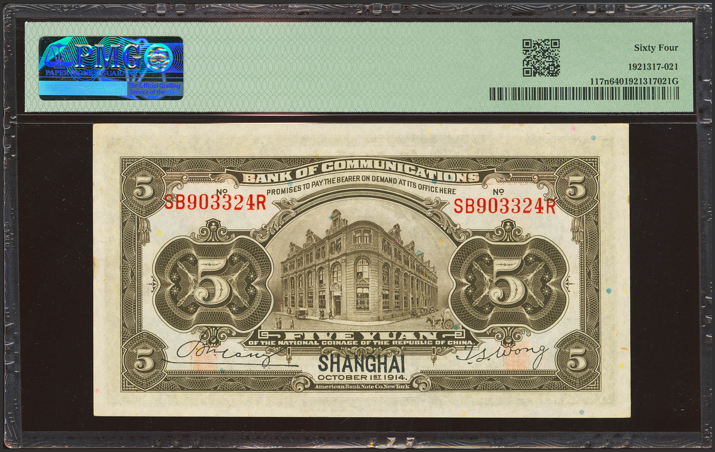 CHINA. 5 Yuan. 1 October 1914. Bank of Communications. Shanghai. (Pick: 117n, SM: C126-93a). PMG64.