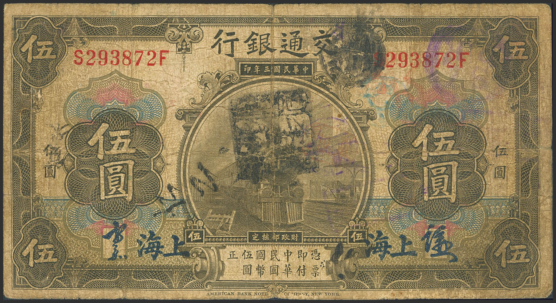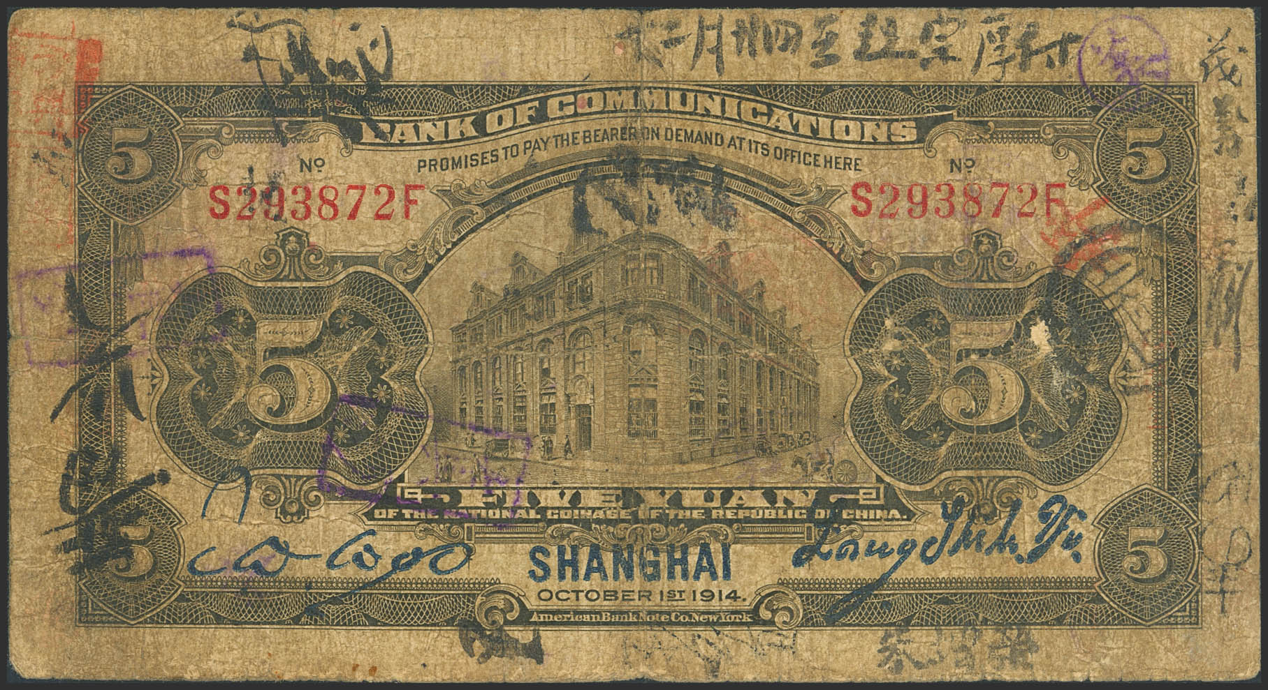 CHINA. 5 Yuan. 1 October 1914. Bank of Communications. Shanghai. (Pick: 117o). Very Good.