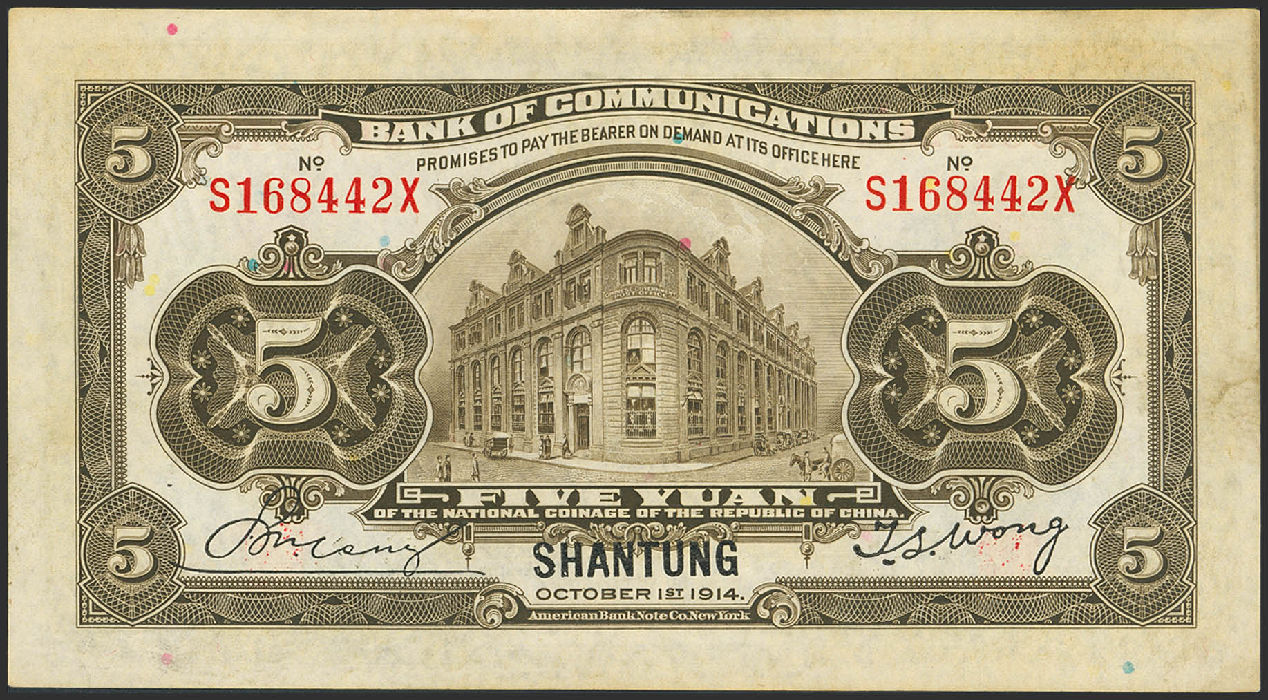 CHINA. 5 Yuan. 1 October 1914. Bank of Communications. Shantung. (Pick: 117p). Almost Uncirculated.
