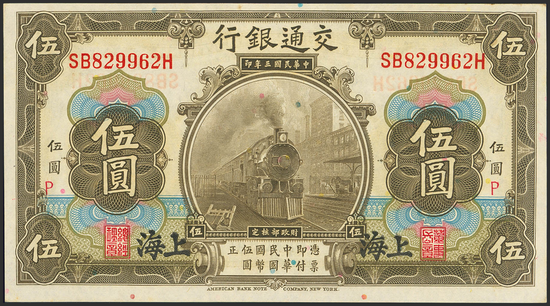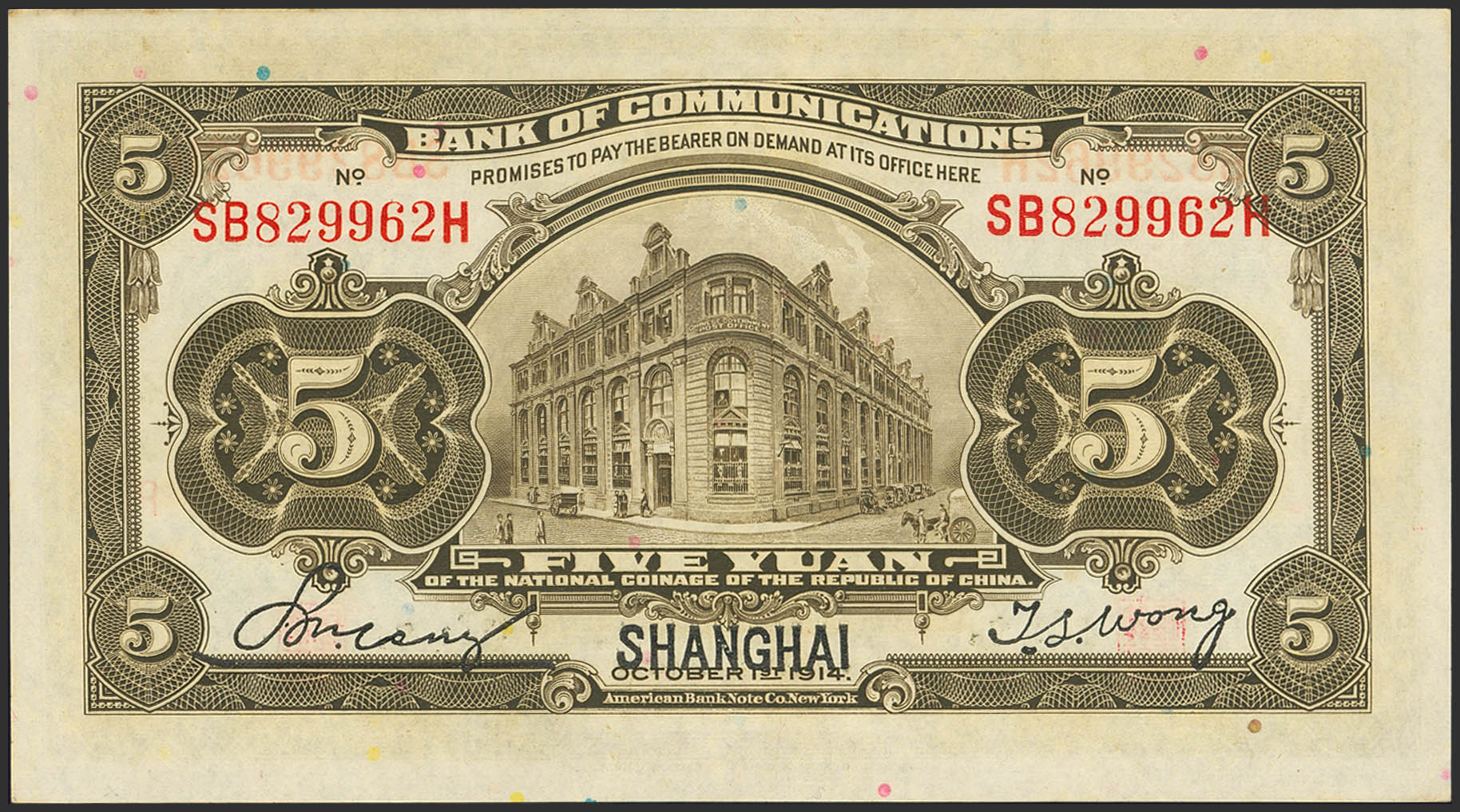 CHINA. 5 Yuan. 1 October 1914. Bank of Communications. Shanghai. Red control letter “P”. (Pick: 117x). Less than Uncirculated.
