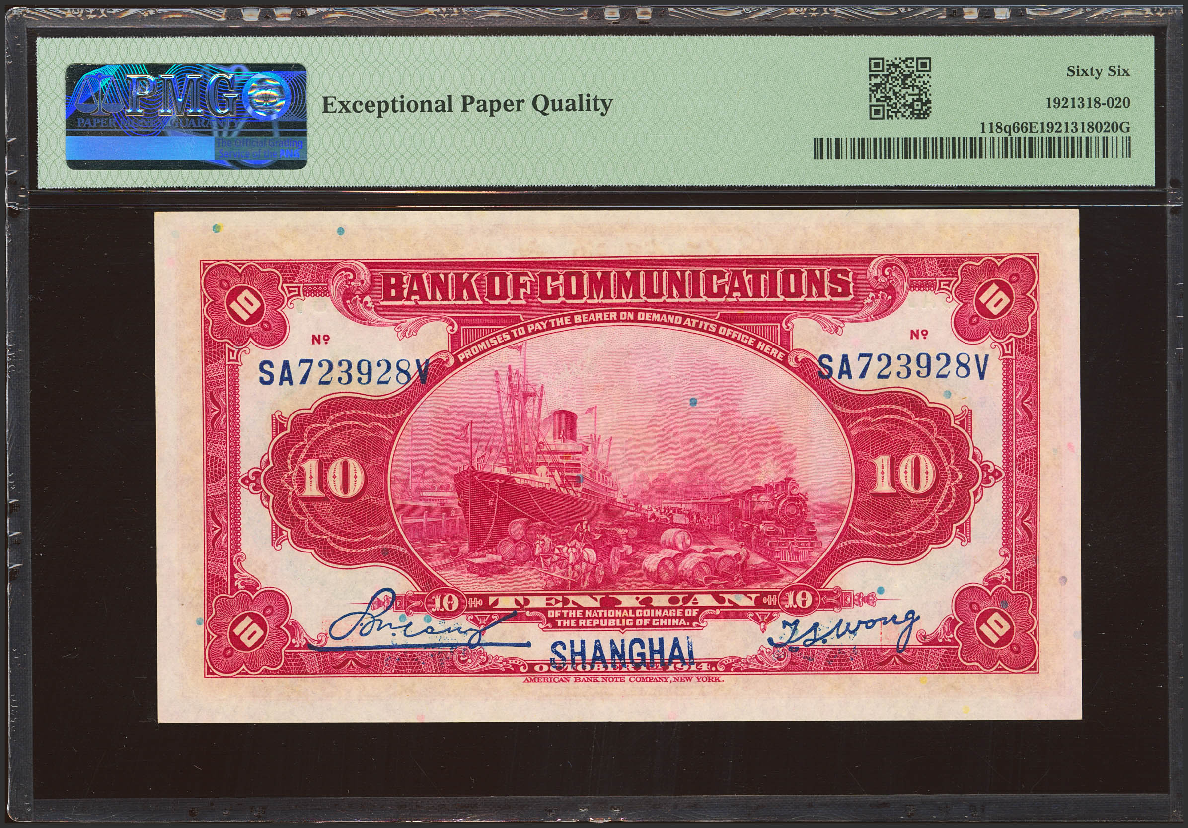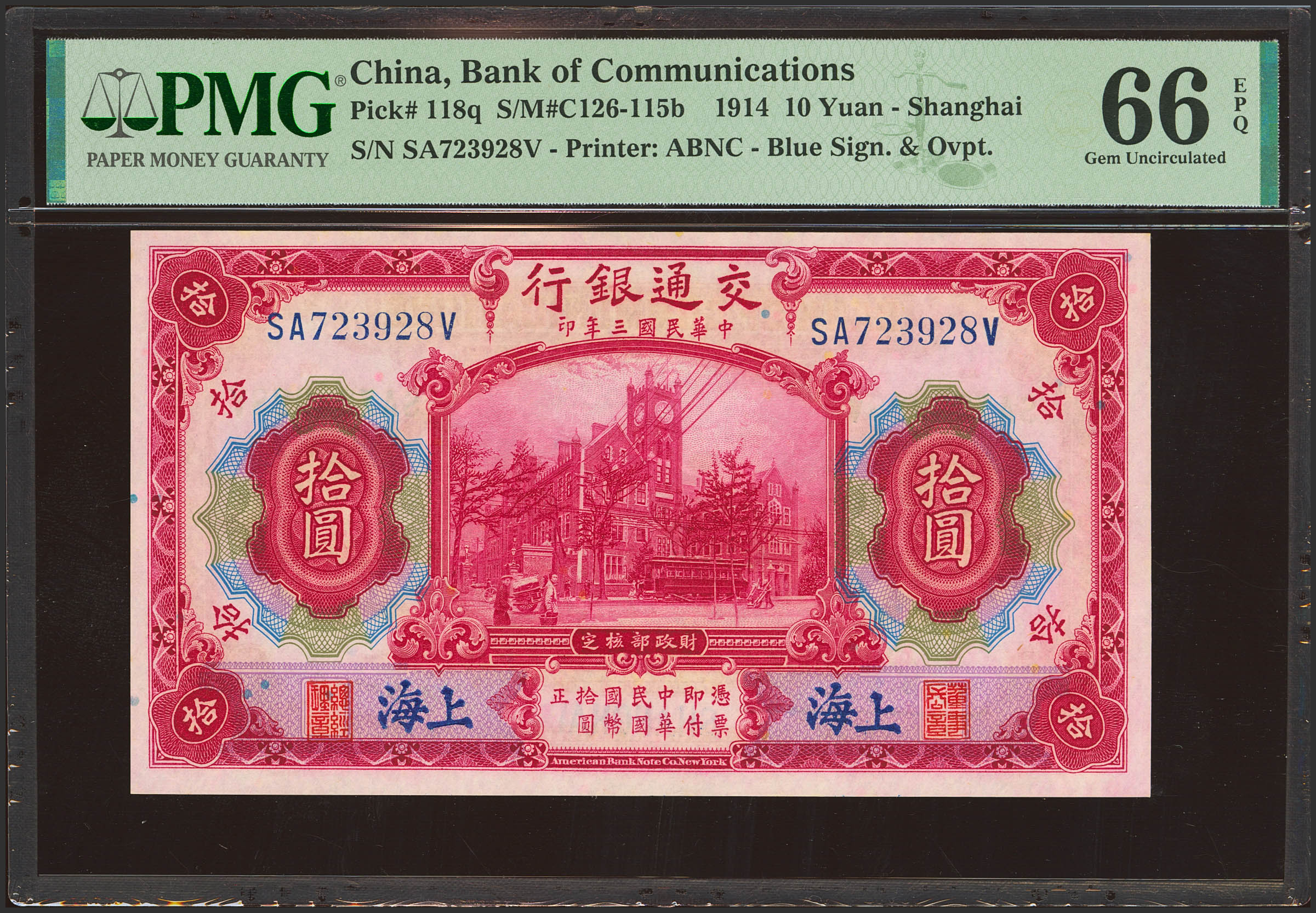 CHINA. 10 Yuan. 1 October 1914. Bank of Communication, Shanghai. (Pick: 118q). PMG66EPQ.