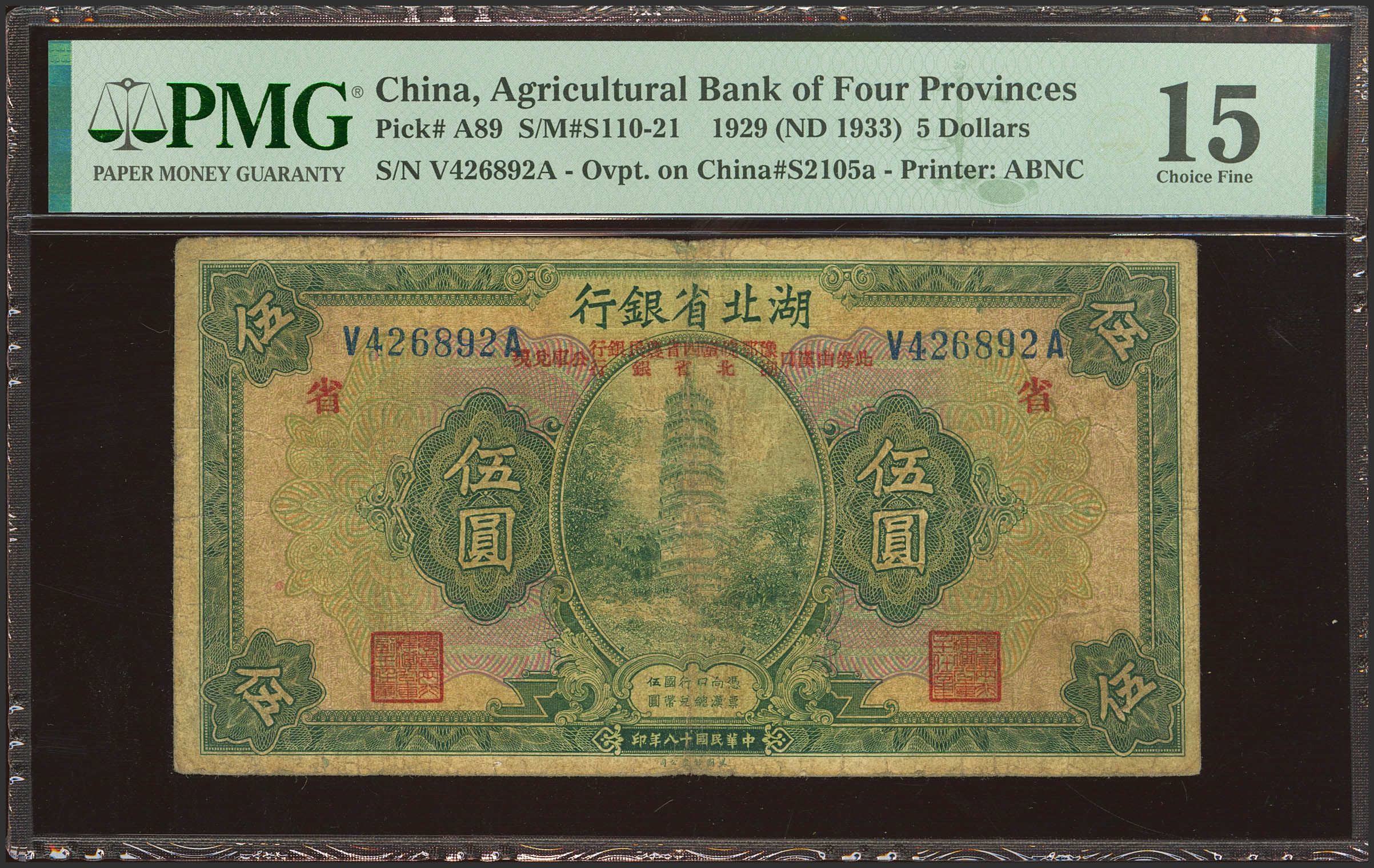CHINA. 5 Yuan. 1933. Agricultural Bank of the Four Provinces. (Pick: A89, SM: S110-21). PMG15.