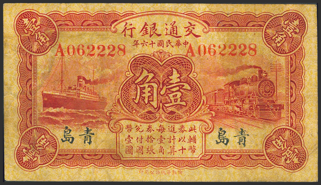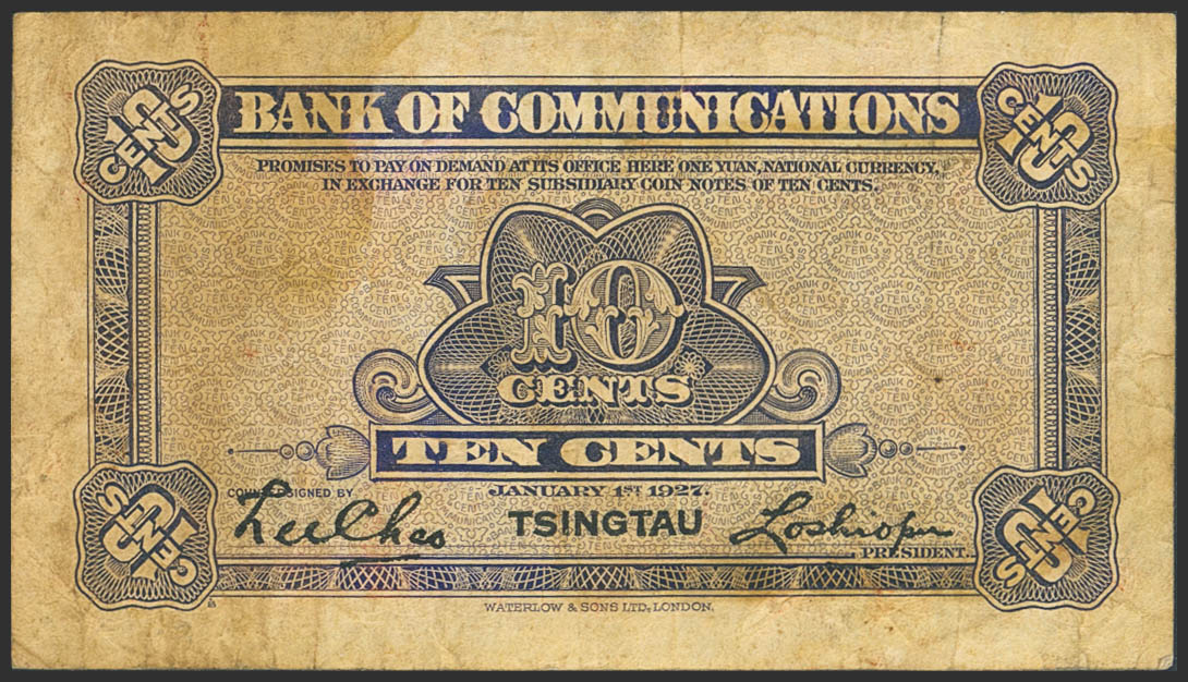 CHINA. 10 Cents. 1 January 1927. Bank of Communication. Tsingtau. (Pick: 142a). Fine.