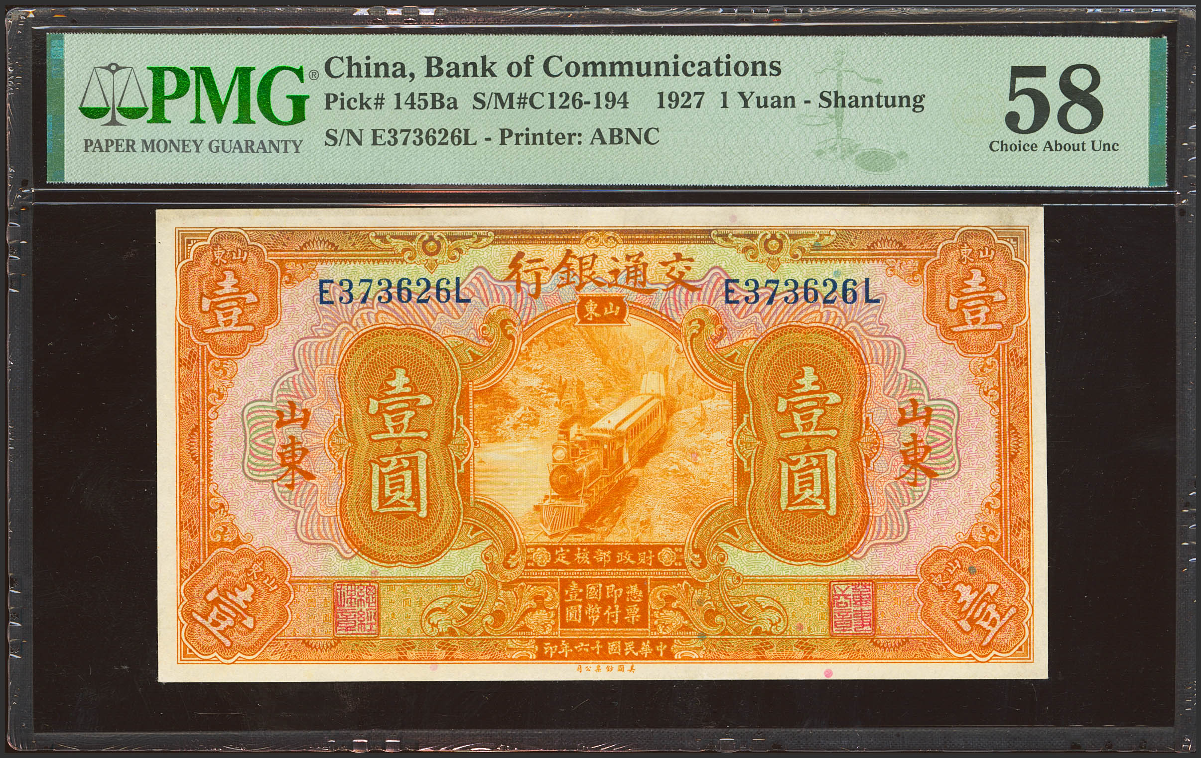CHINA. 1 Yuan. 1 November 1927. Shangtun. Bank of Communications. (Pick: 145Ba, SM: C126-194). PMG58 (stain).