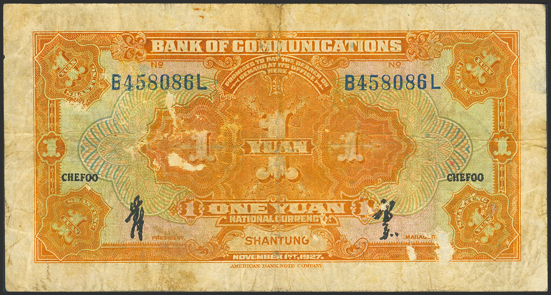 CHINA. 1 Yuan. 1 November 1927. Bank of Communications. Chefoo / Shantung. (Pick: 145Bb). Previously mounted. Fine.