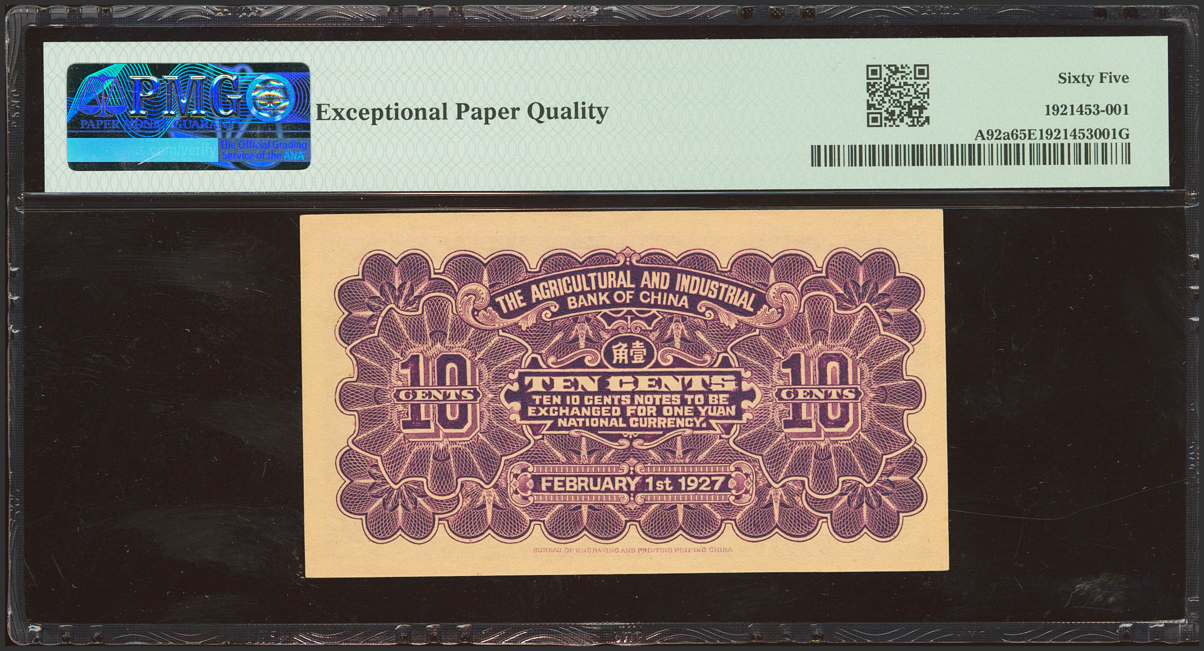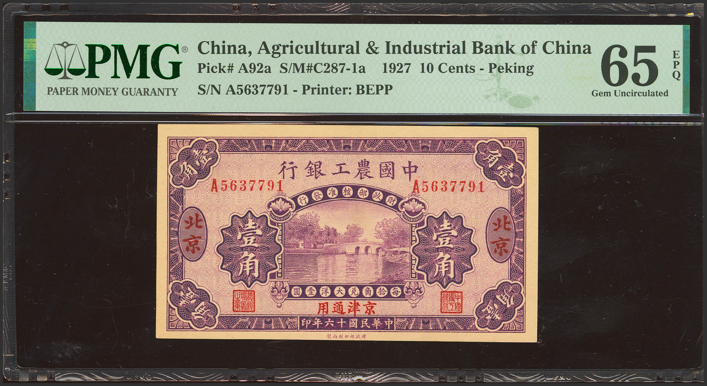 CHINA. 10 Cents. 1 February 1927. Agricultural and Industrial Bank of China. Peking. (Pick: A92a, SM: C287-1a). PMG65EPQ.