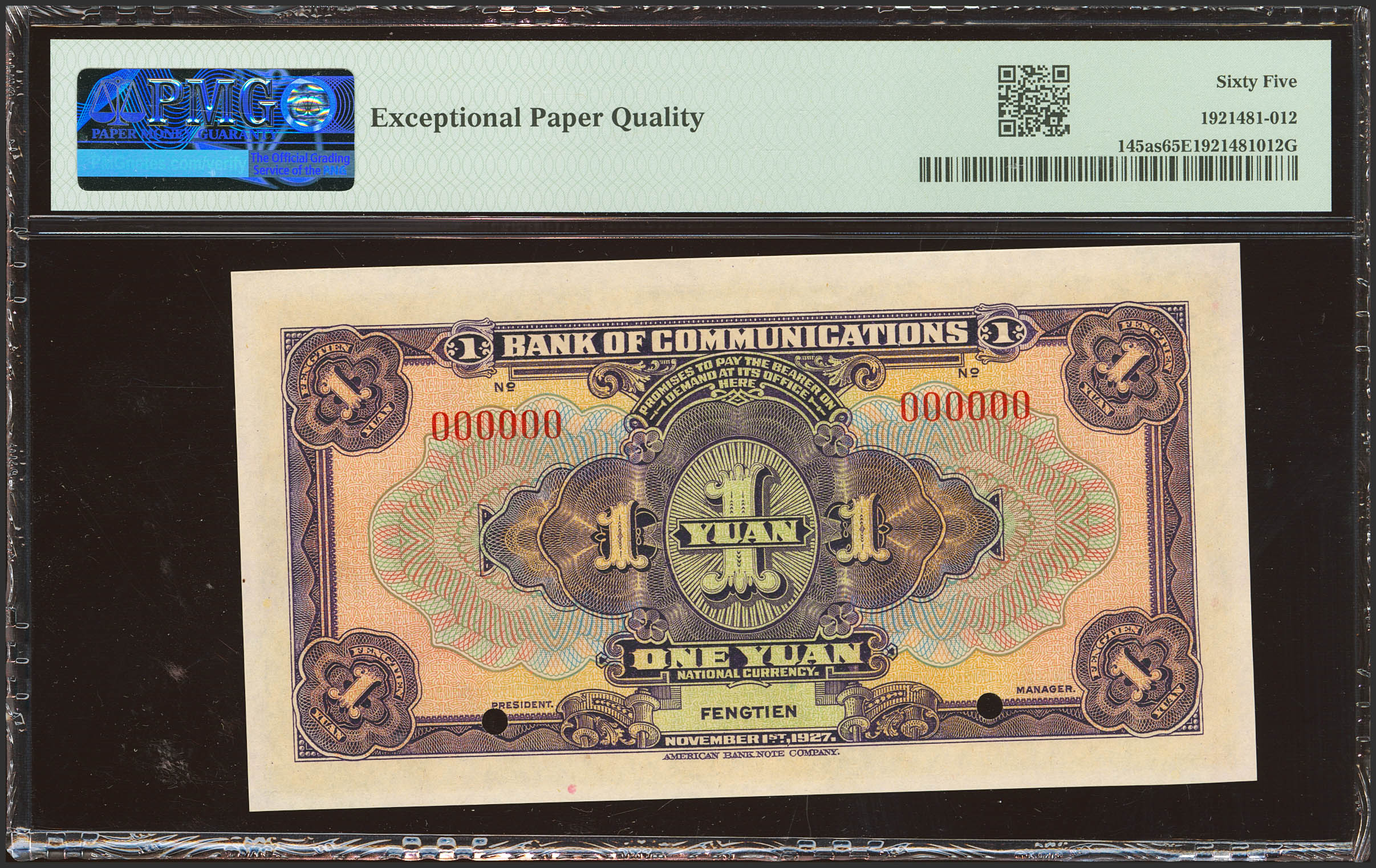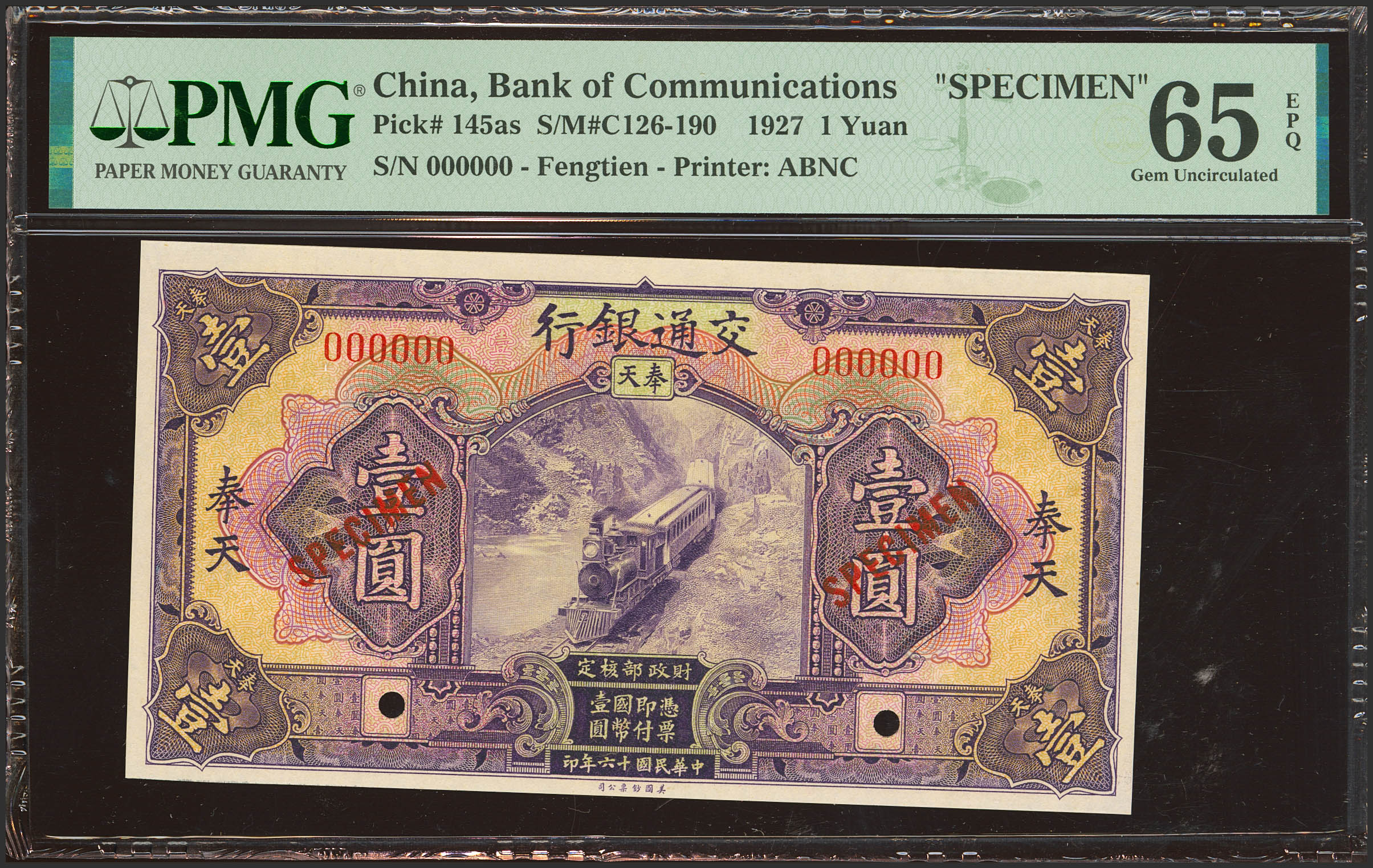 CHINA. 1 Yuan. 1 November 1927. Bank of Communications. Specimen. (Pick: 145as, SM: C126-190). PMG65EPQ.