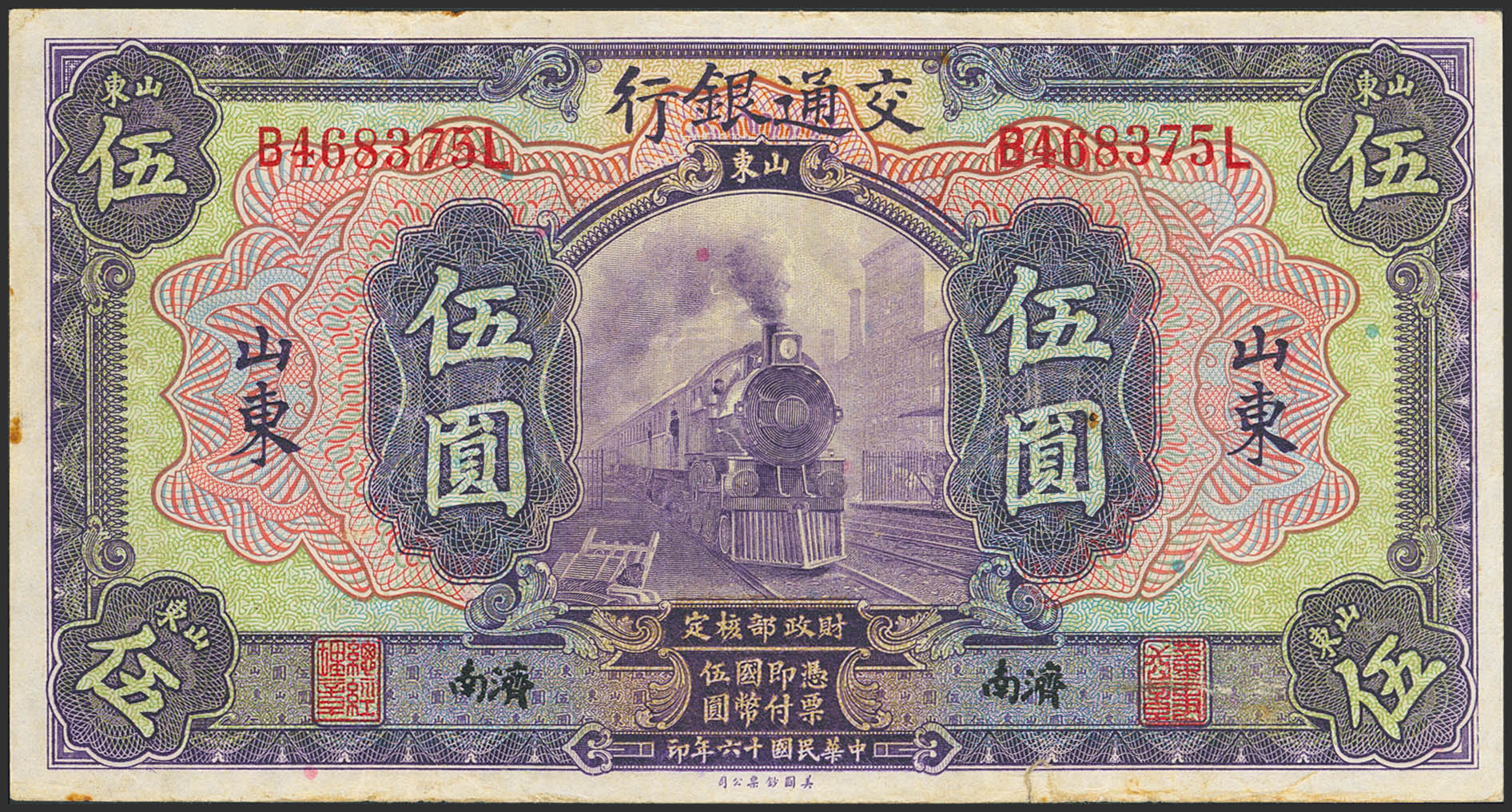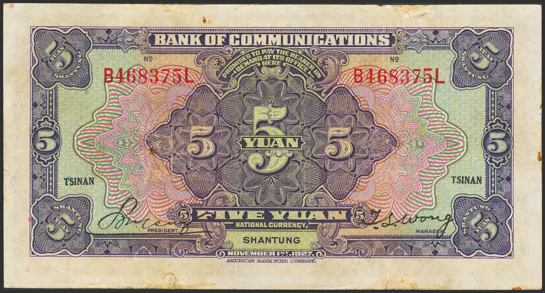 CHINA. 5 Yuan. 1 November 1927. Bank of Communication. Tsinan / Shantung. (Pick: 146Cd). Pinhole and tear. More than Very Fine.