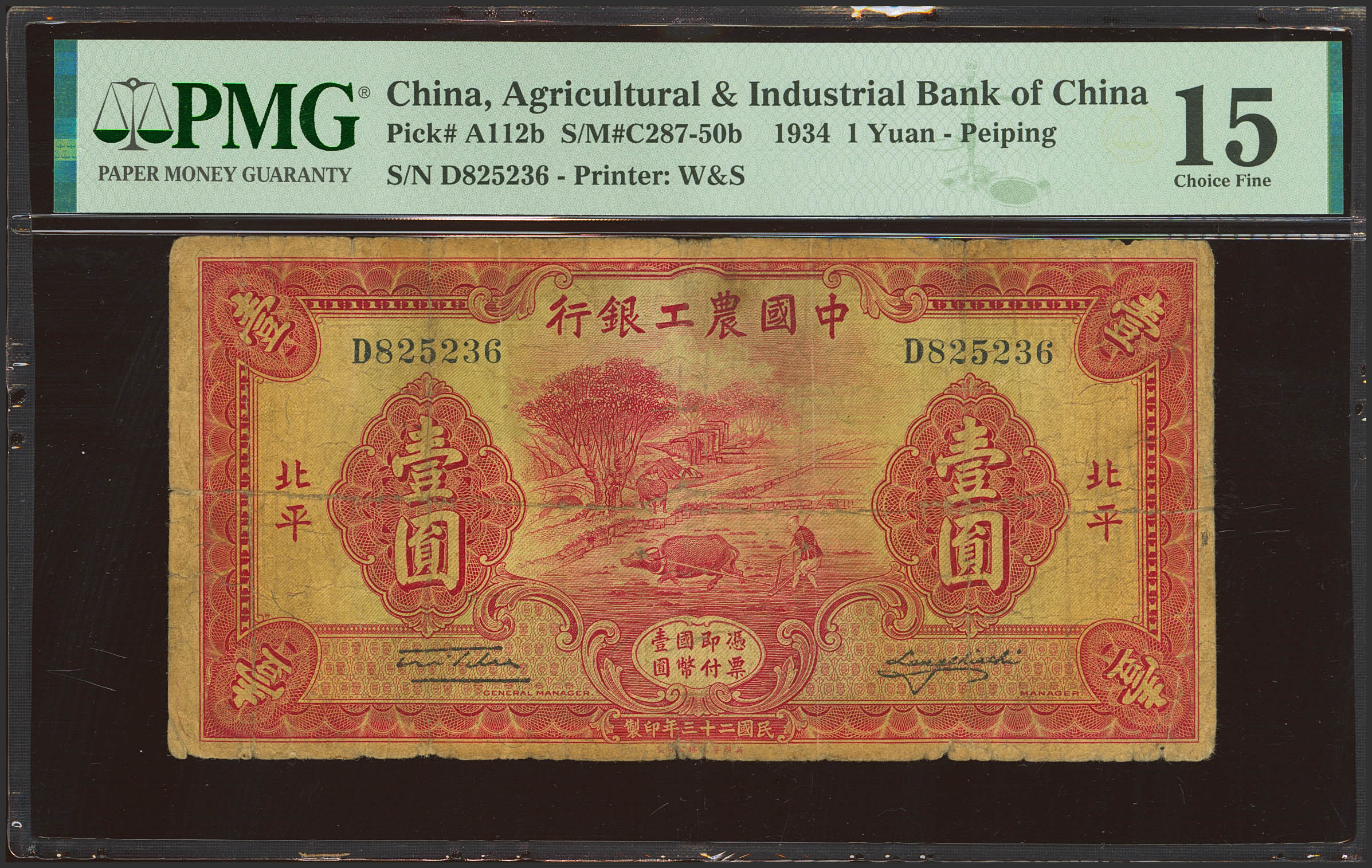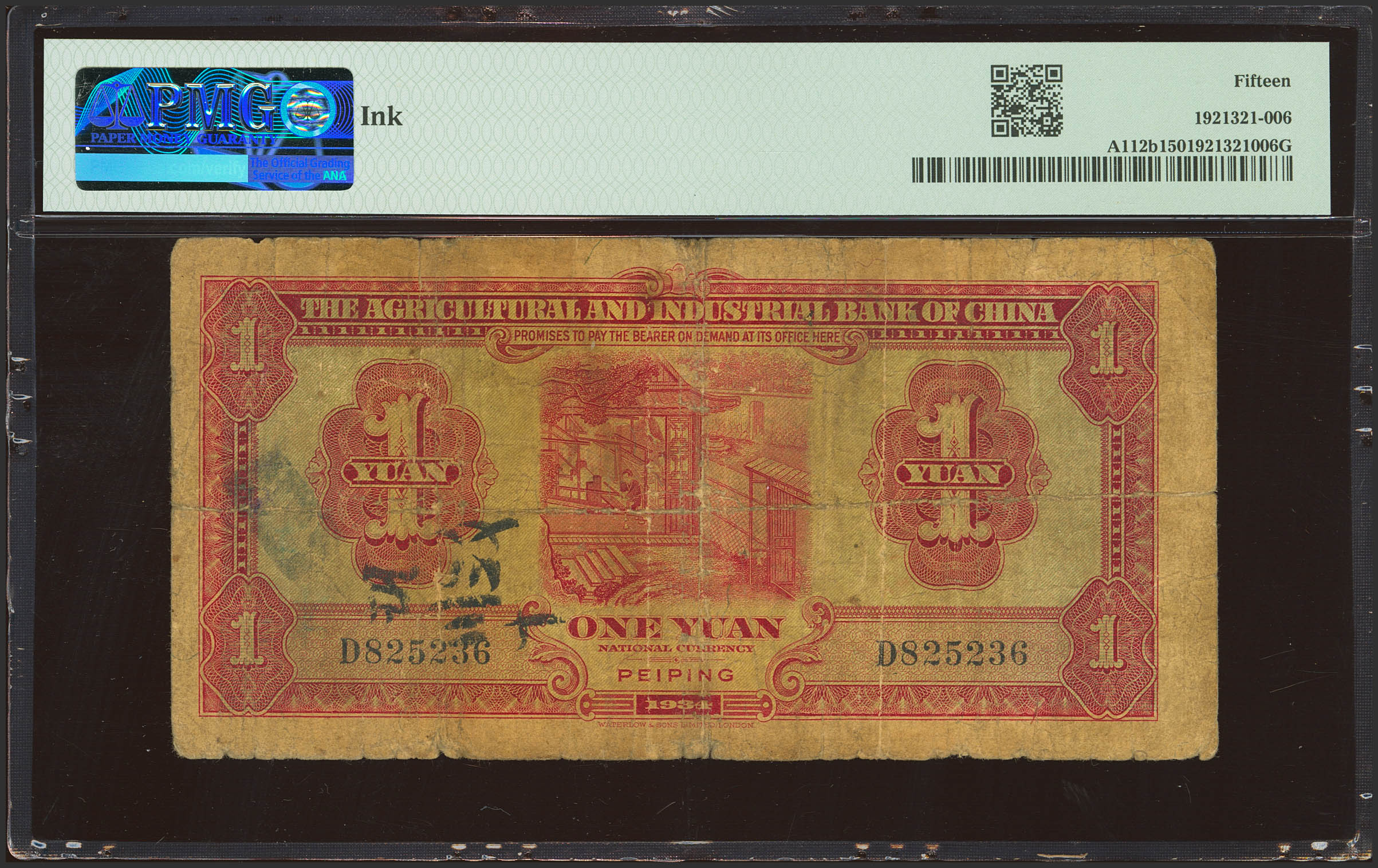CHINA. 1 Yuan. 1934. Agricultural and Industrial Bank of China. Peiping. (Pick: A112b, SM: C287-50b). PMG15 (ink).
