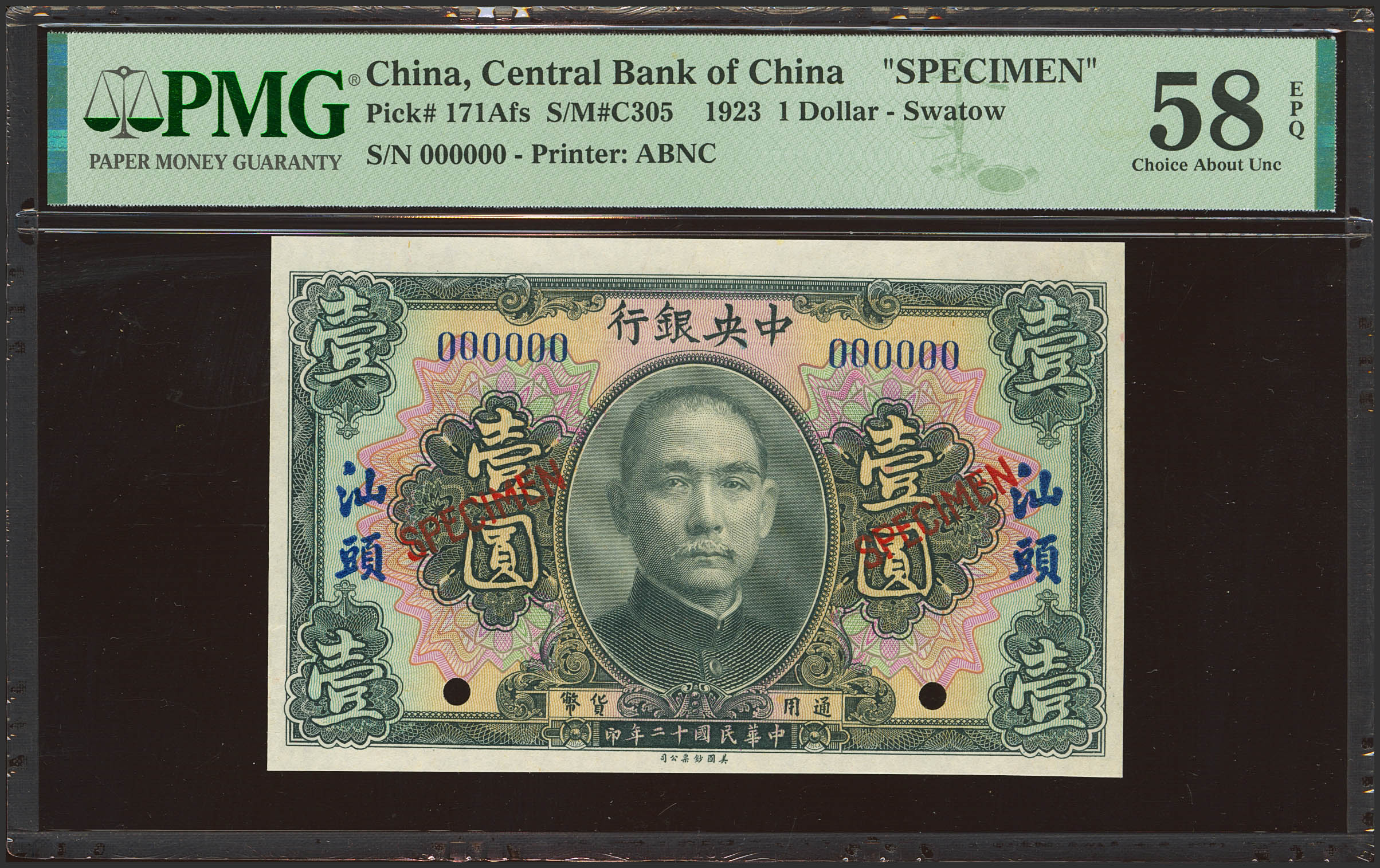 CHINA. 1 Dollar. 1923. Central Bank of China. Swatow. Specimen. (Pick: 171Afs, SM: C305). PMG58EPQ.