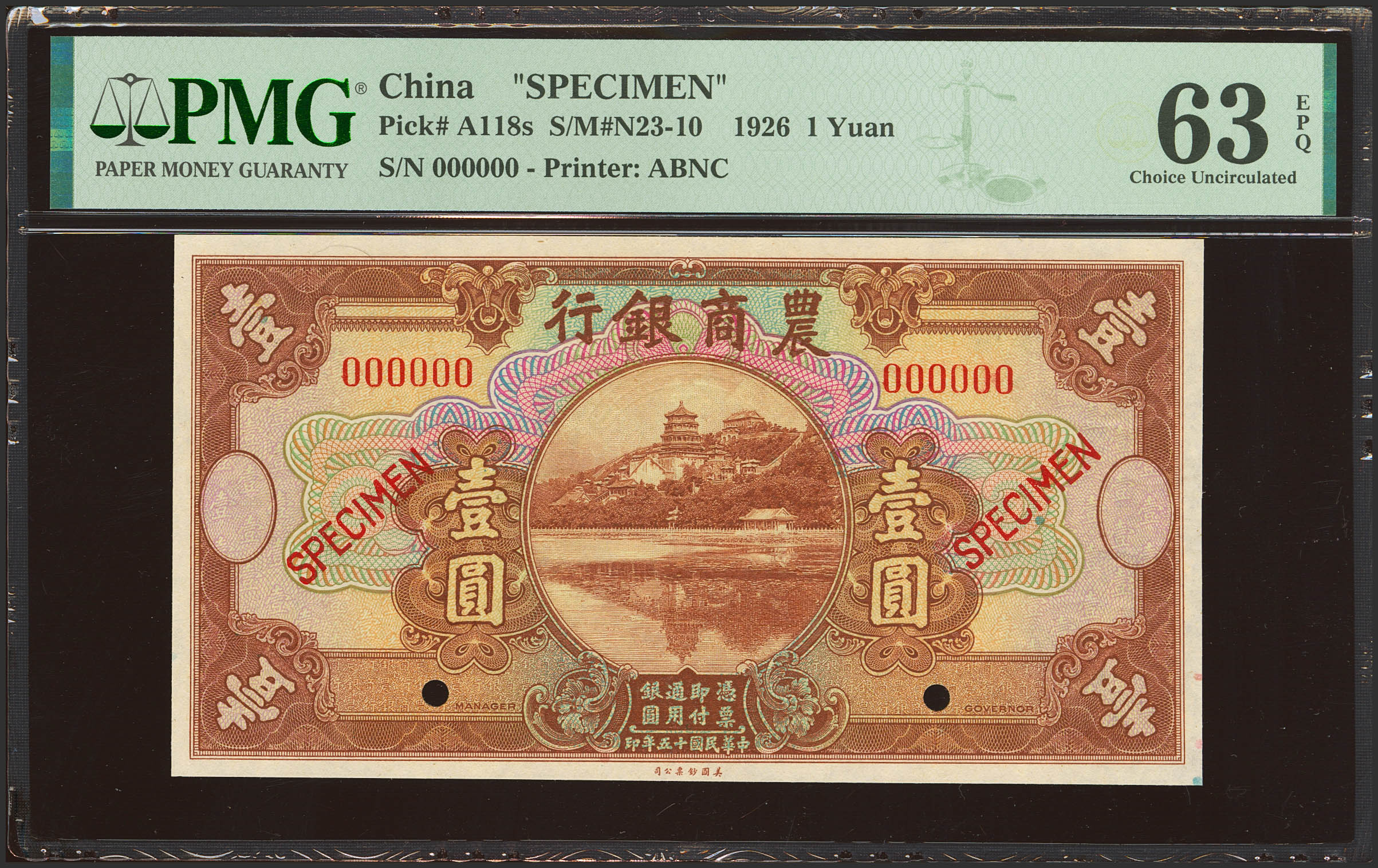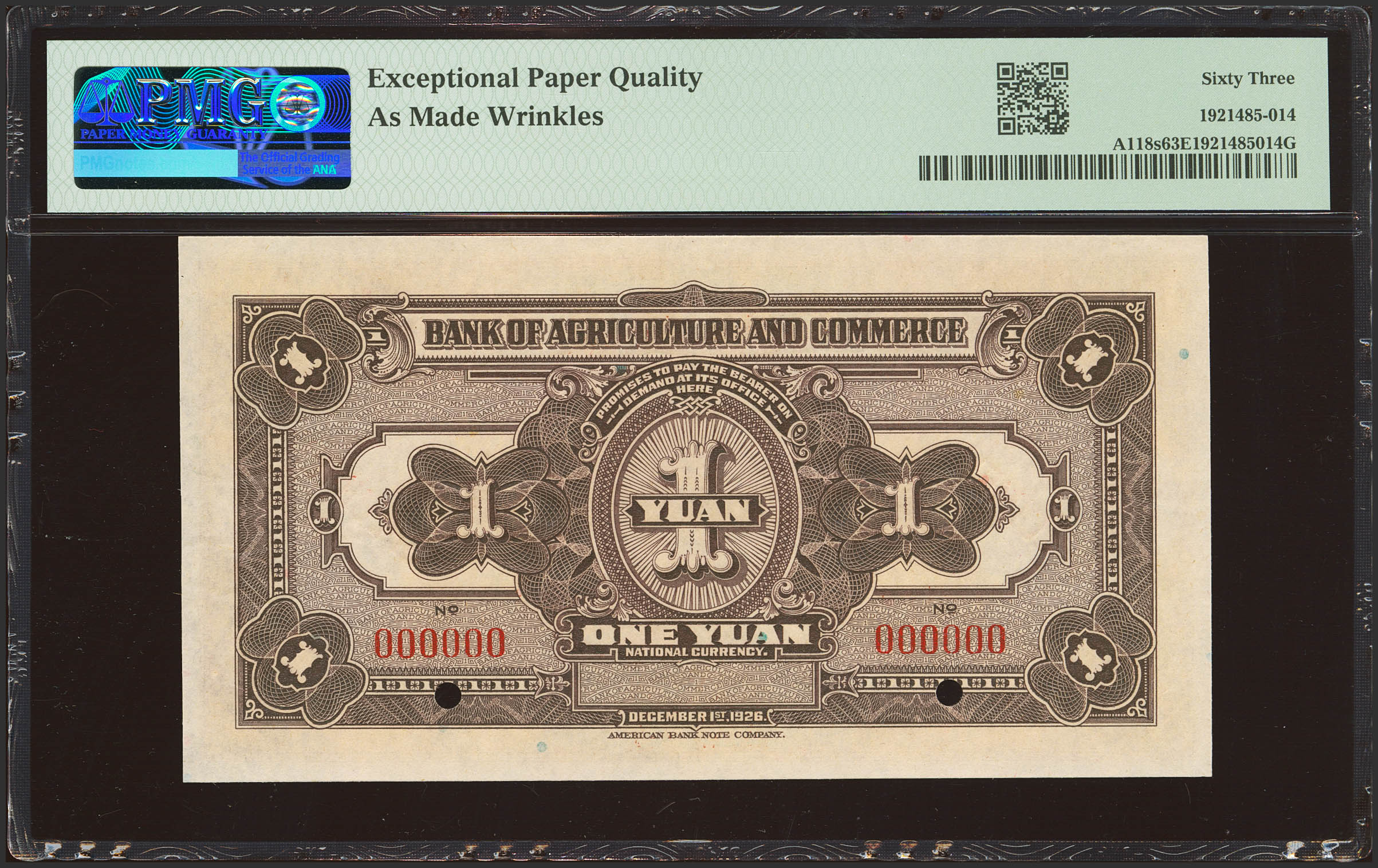 CHINA. 1 Yuan. 1 December 1926. Bank of Agriculture and Commerce. Specimen. (Pick: A118s, SM: N23-10). PMG63EPQ (as made wrinkles).