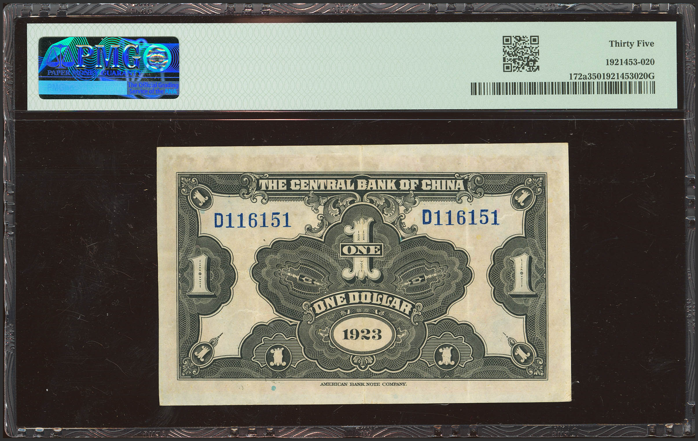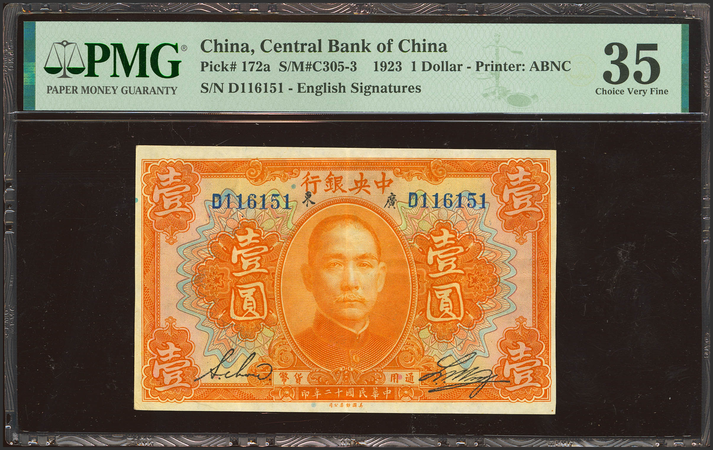 CHINA. 1 Dollar. 1923. Central Bank of China. (Pick: 172a SM: C305-3). PMG35 (according to the PMG population report, it is the Top Pop banknote as of 15 February 2025).