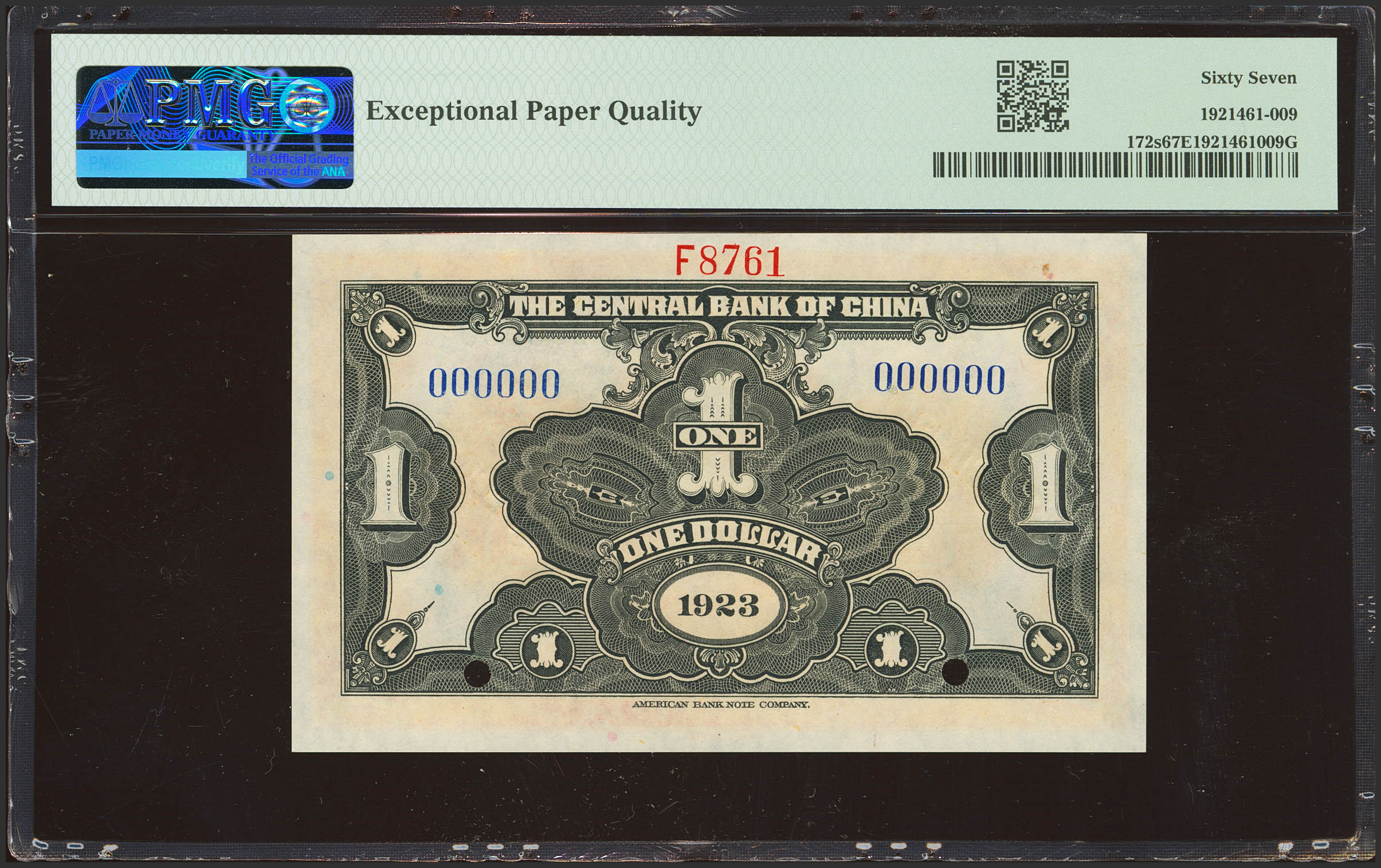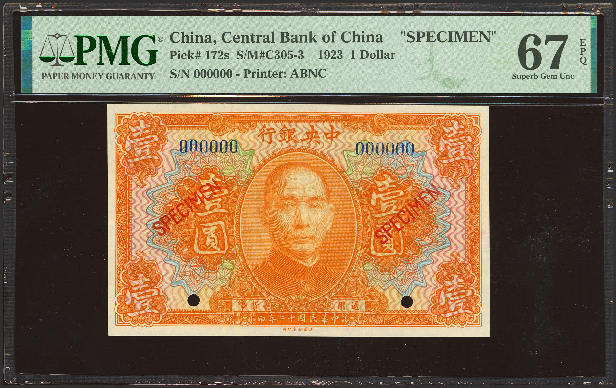 CHINA. 1 Dollar. 1923. Central Bank of China. Specimen. (Pick: 172s, SM: C305-3). PMG67EPQ (according to the PMG population report, it is the Top Pop banknote as of 15 February 2025).