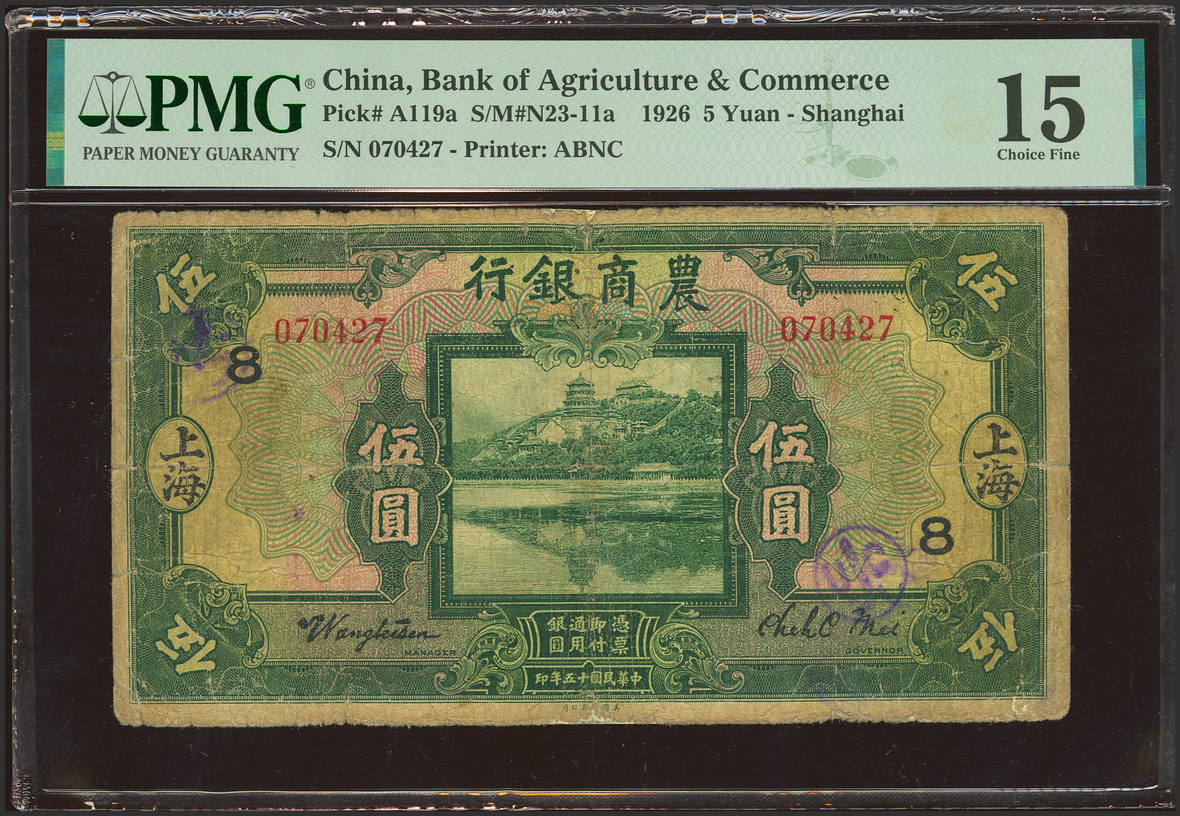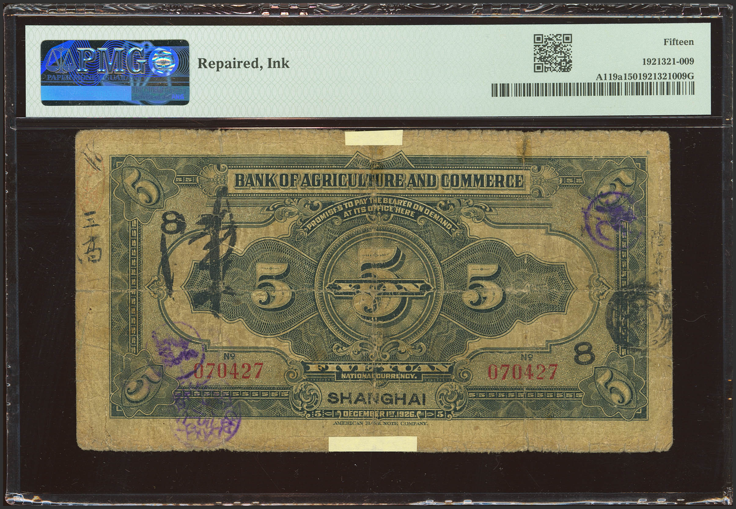 CHINA. 5 Yuan. 1 December 1926. Bank of Agriculture and Commerce. (Pick: A119a, SM: N23-11a). PMG15 (repaired, ink).