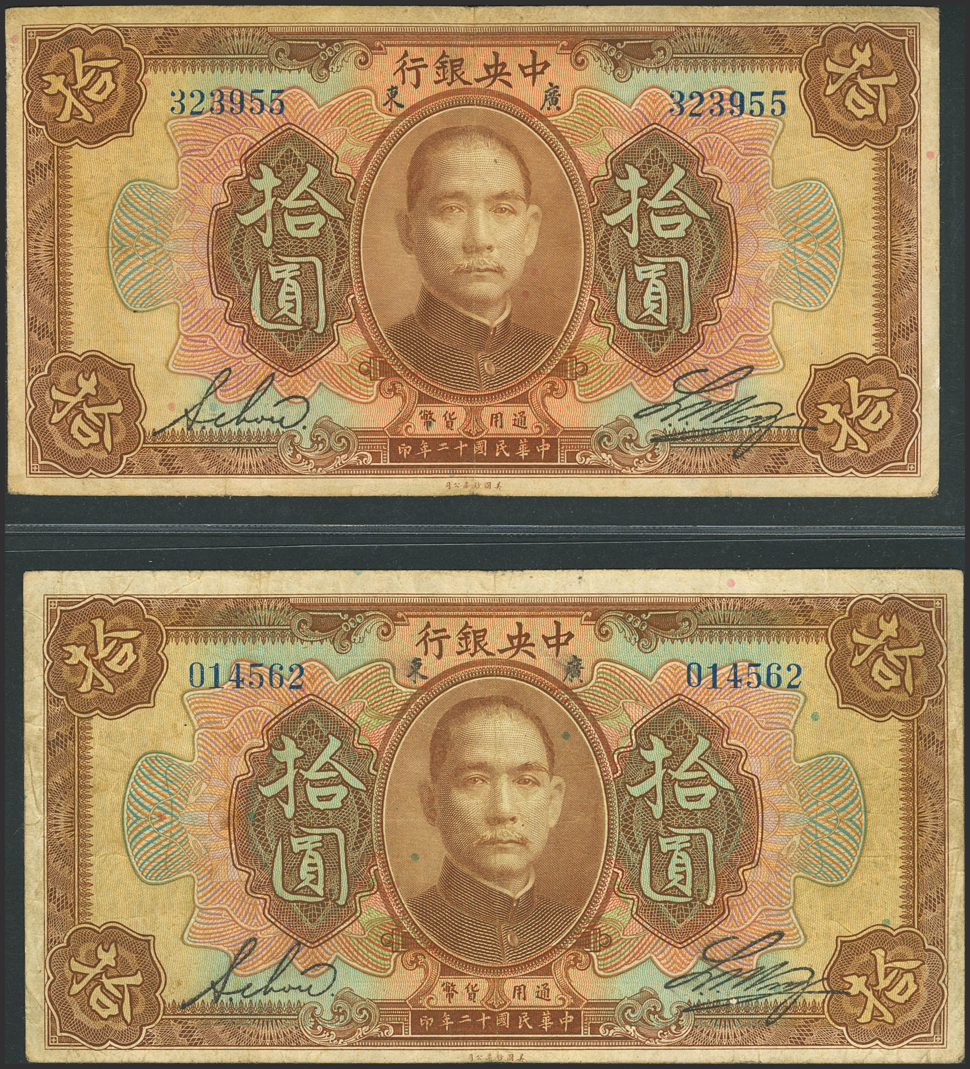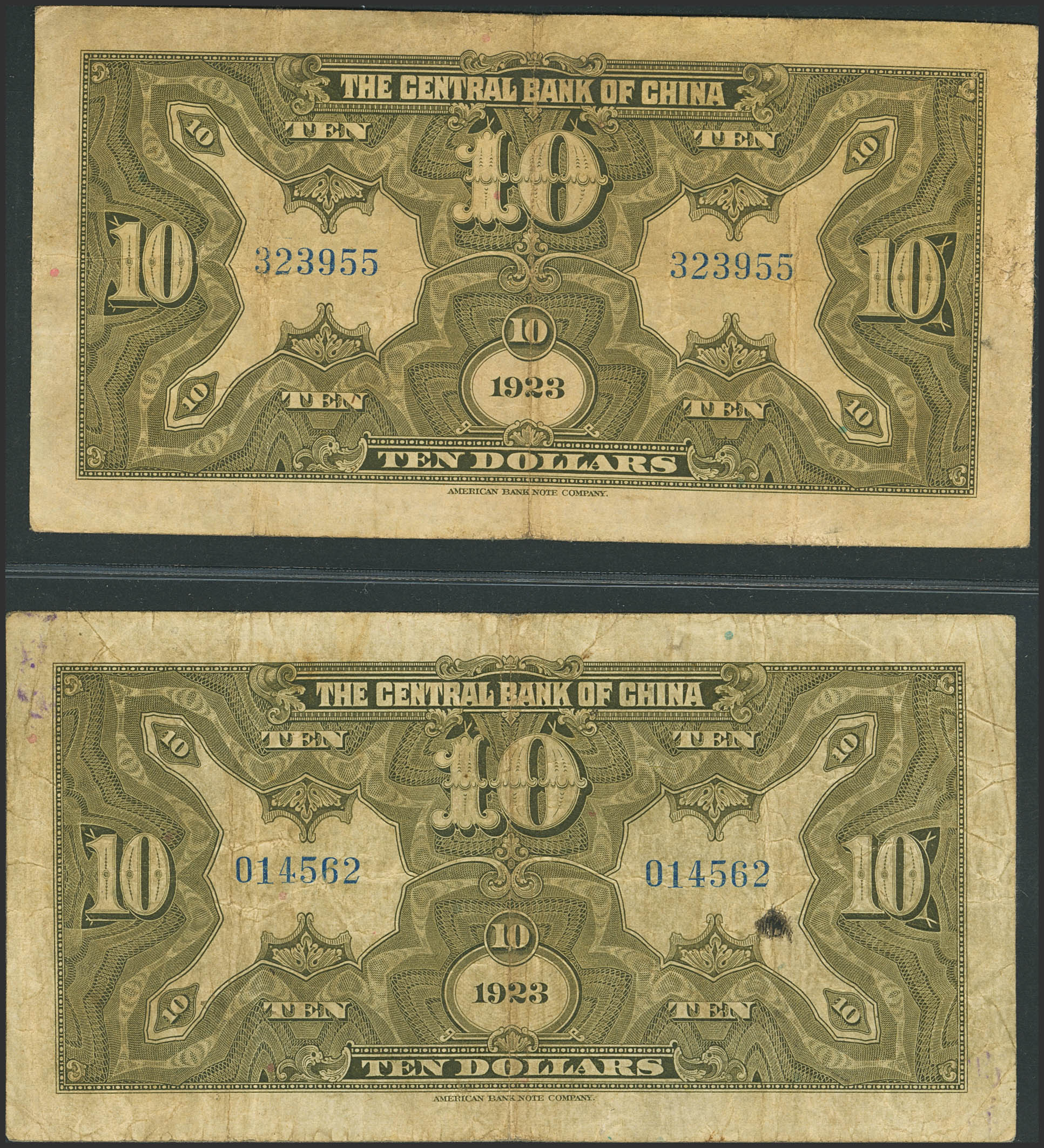 CHINA. Lot of 2 notes of 10 Dollars. 1923. Central Bank of China. (Pick: 176a). Very Fine.
