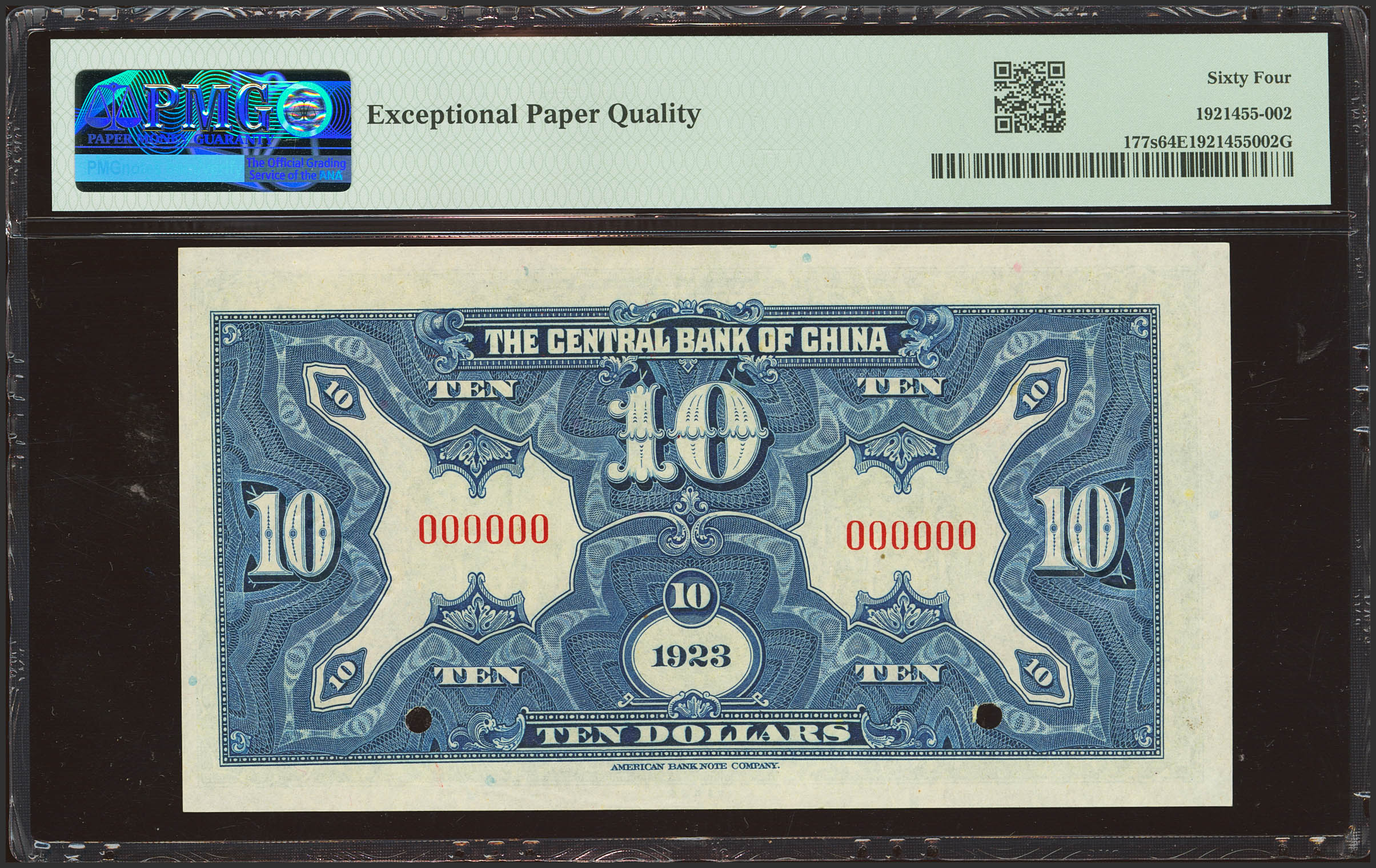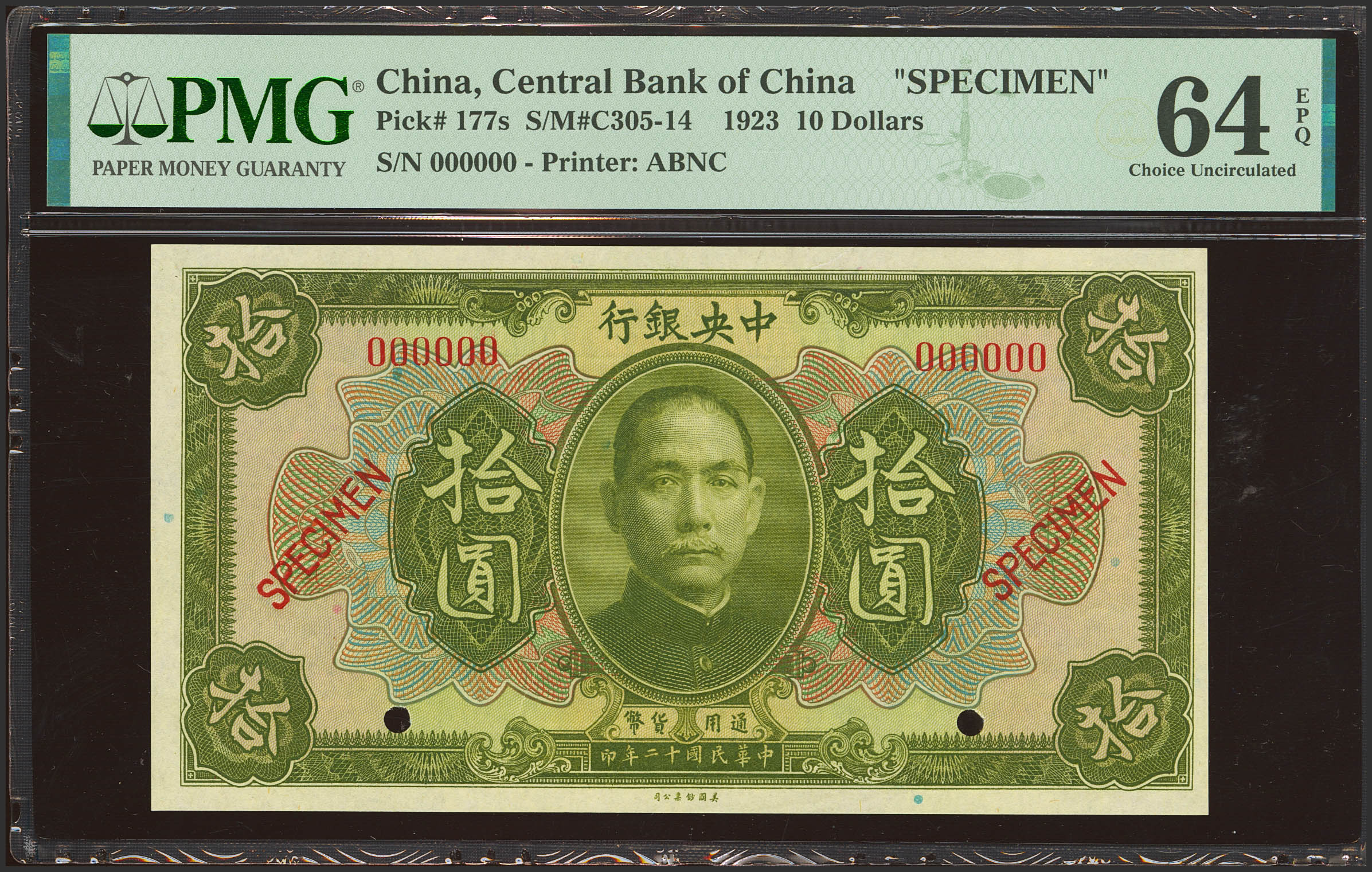 CHINA. 10 Dollars. 1923. Central Bank of China. Specimen. (Pick: 177s, SM: C305-14). PMG64EPQ.