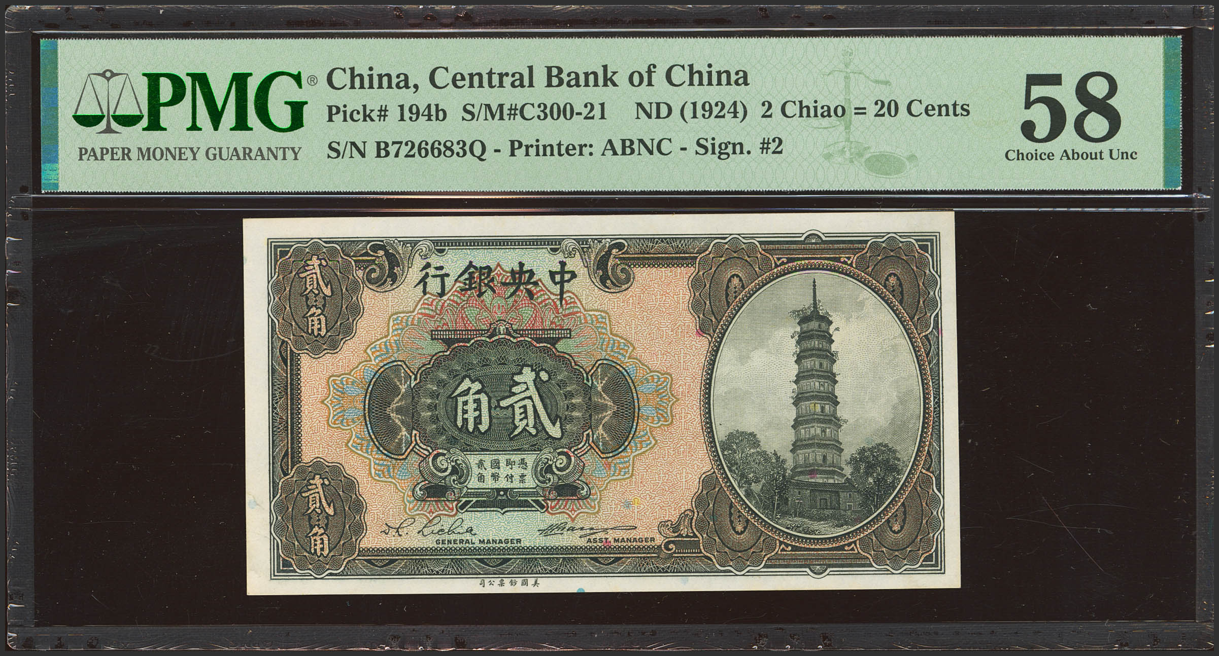 CHINA. 20 Cents. (1924ca). Central Bank of China. (Pick: 194b, SM: C300-21). PMG58.