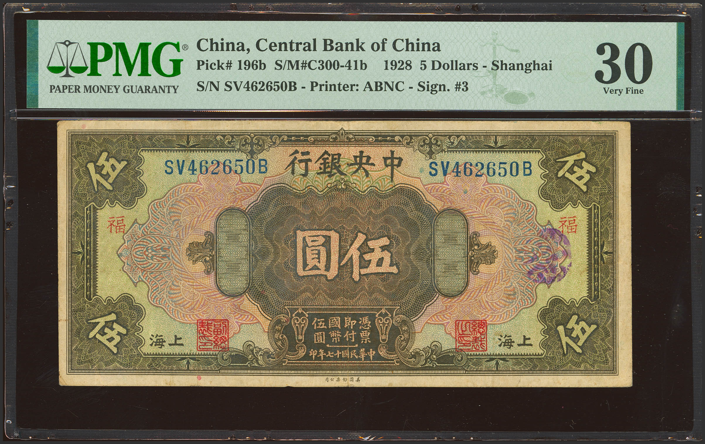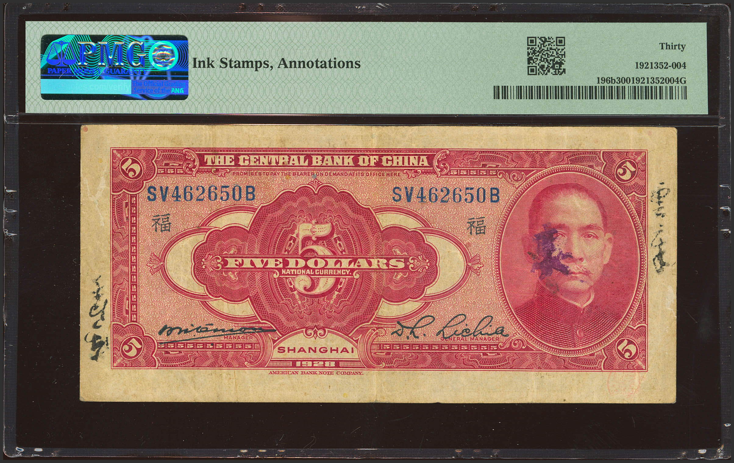 CHINA. 5 Dollars. 1928. Central Bank of China. (Pick: 196b, SM: C300-41b). PMG30 (ink stamps, annotations)