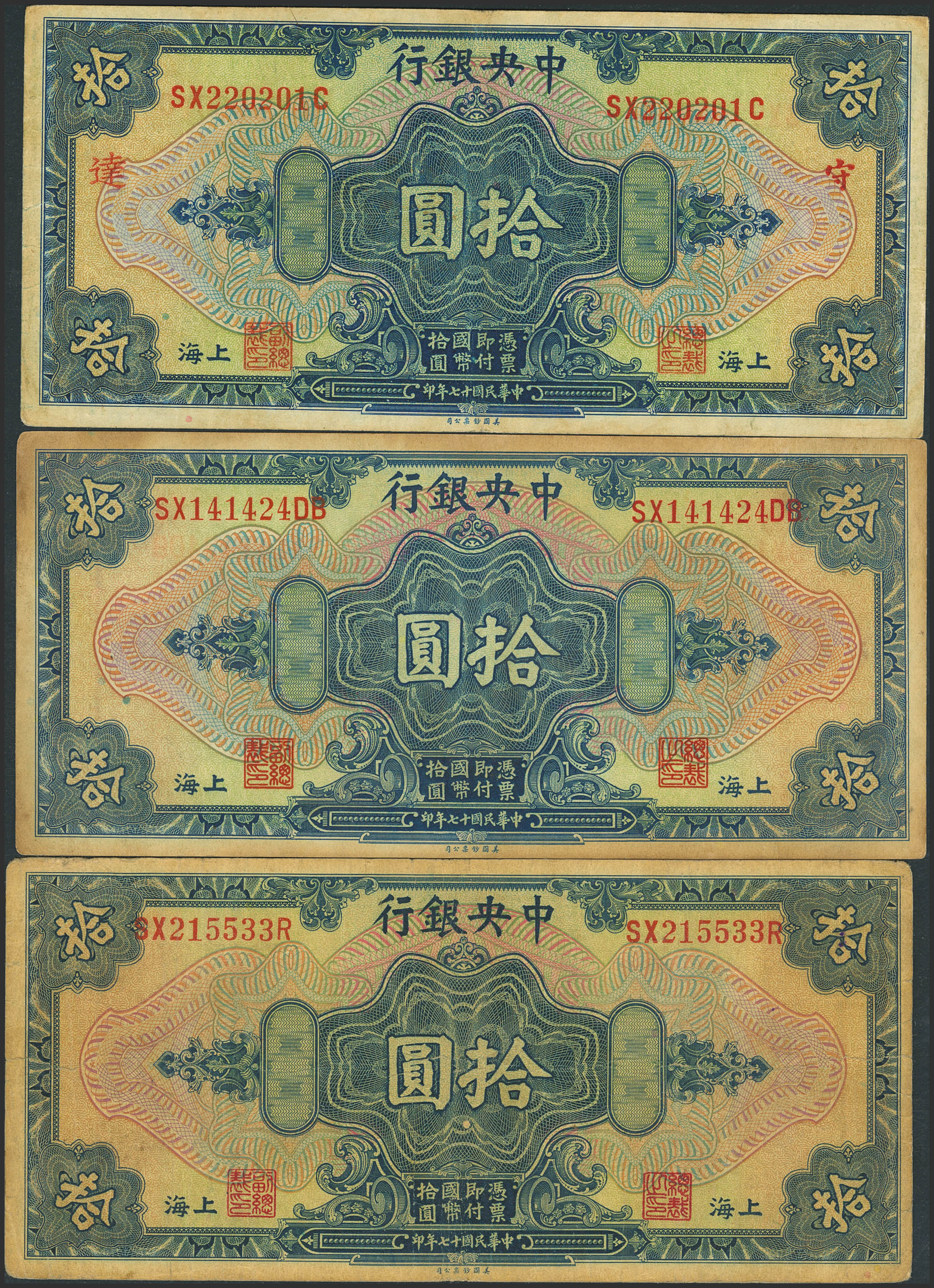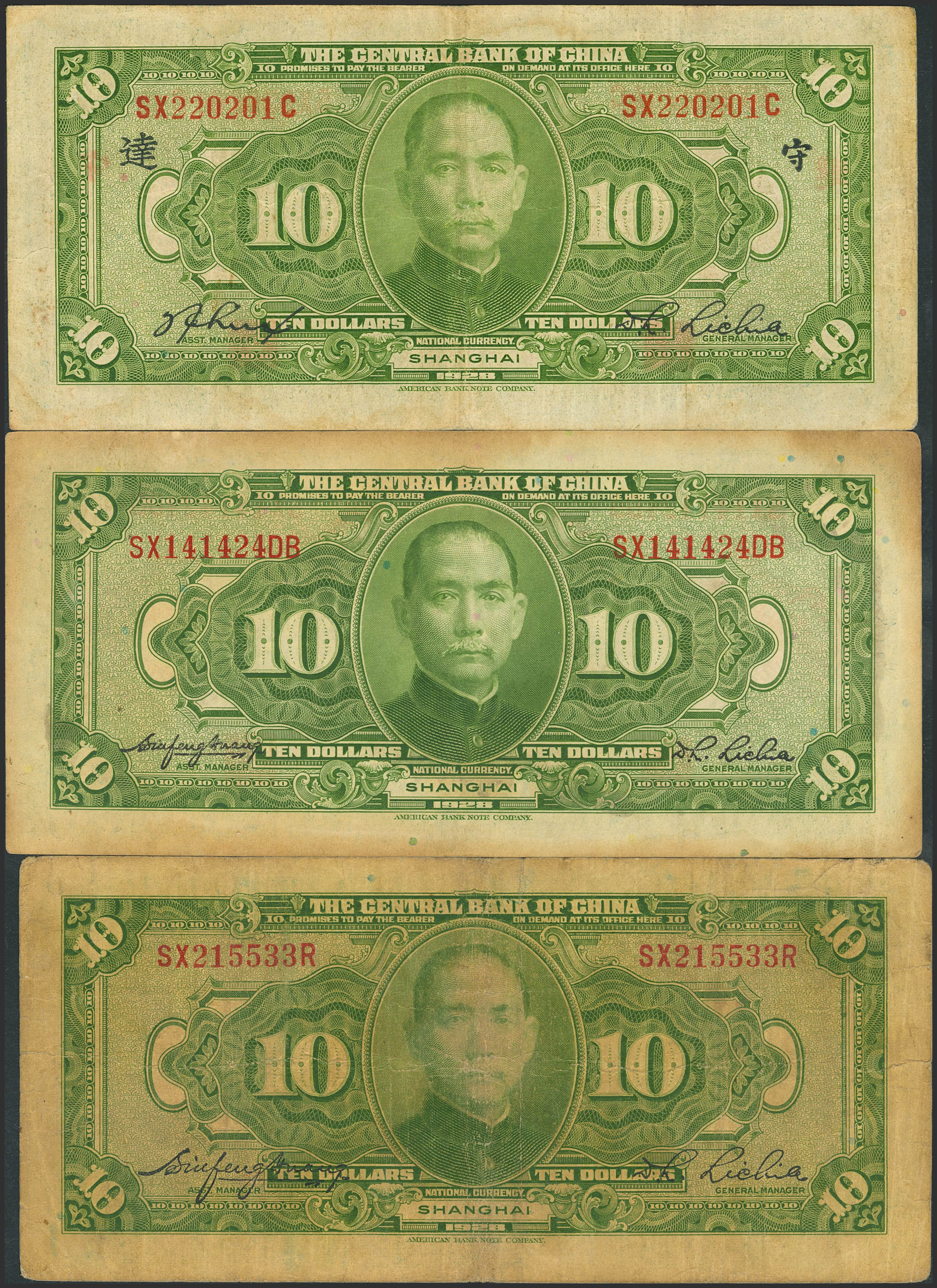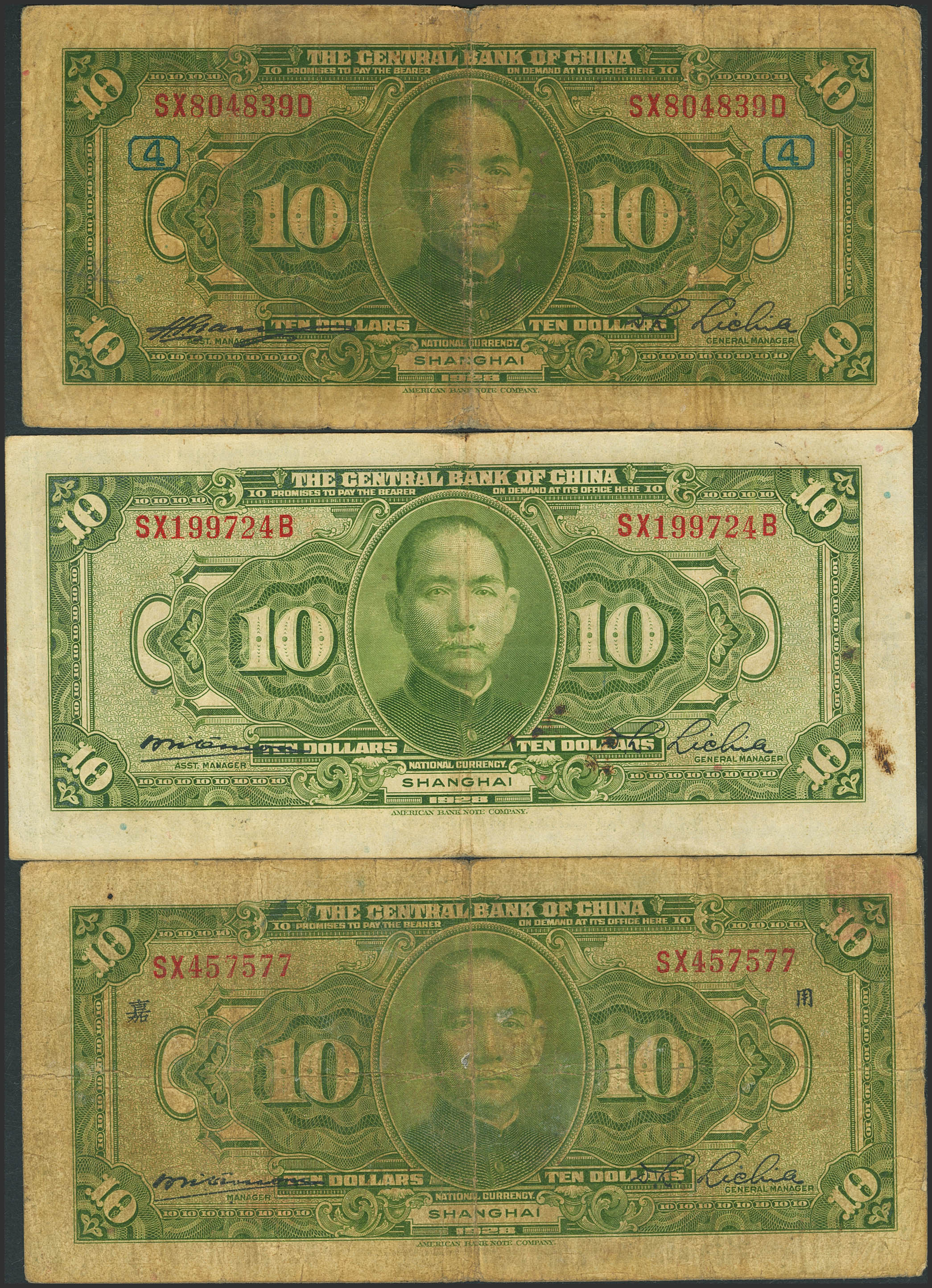 CHINA. Lot of 6 notes of 10 Dollars. 1928. Central Bank of China. (Pick: 197a(1), b(2), c(1), d(1), e(1)). Fine (5), Very Fine (1).