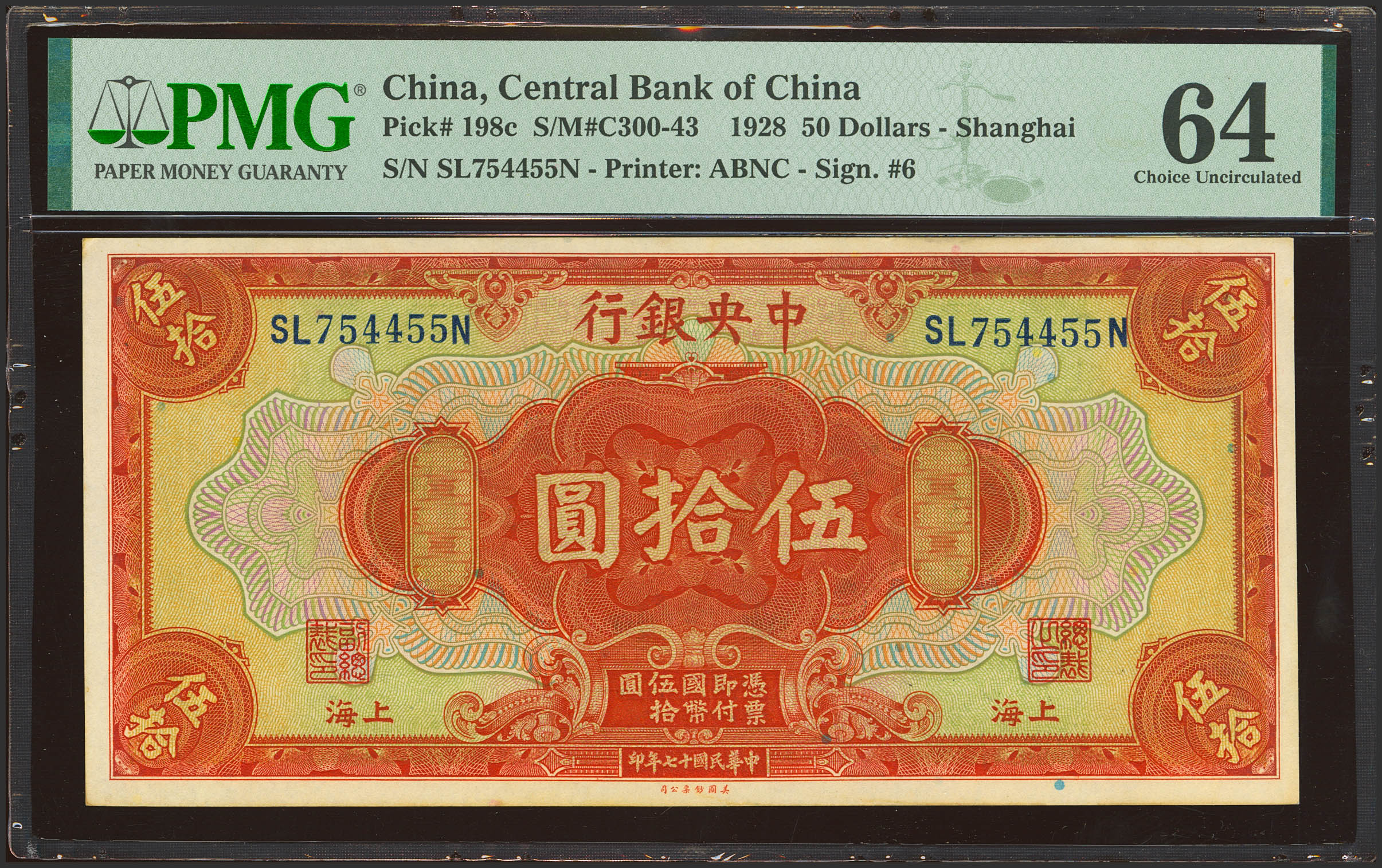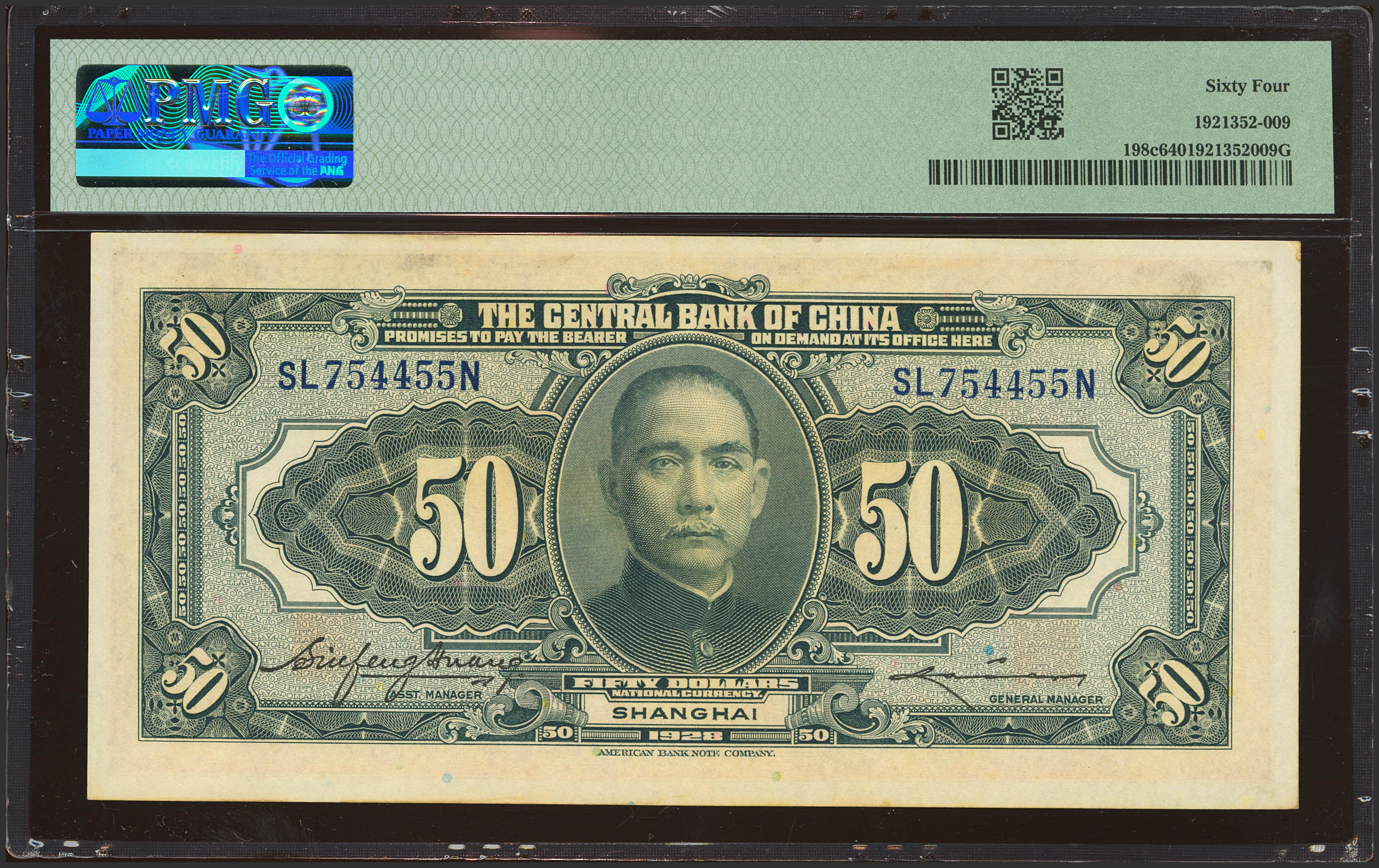 CHINA. 50 Dollars. 1928. Central Bank of China. (Pick: 198c, SM: C300-43). PMG64.