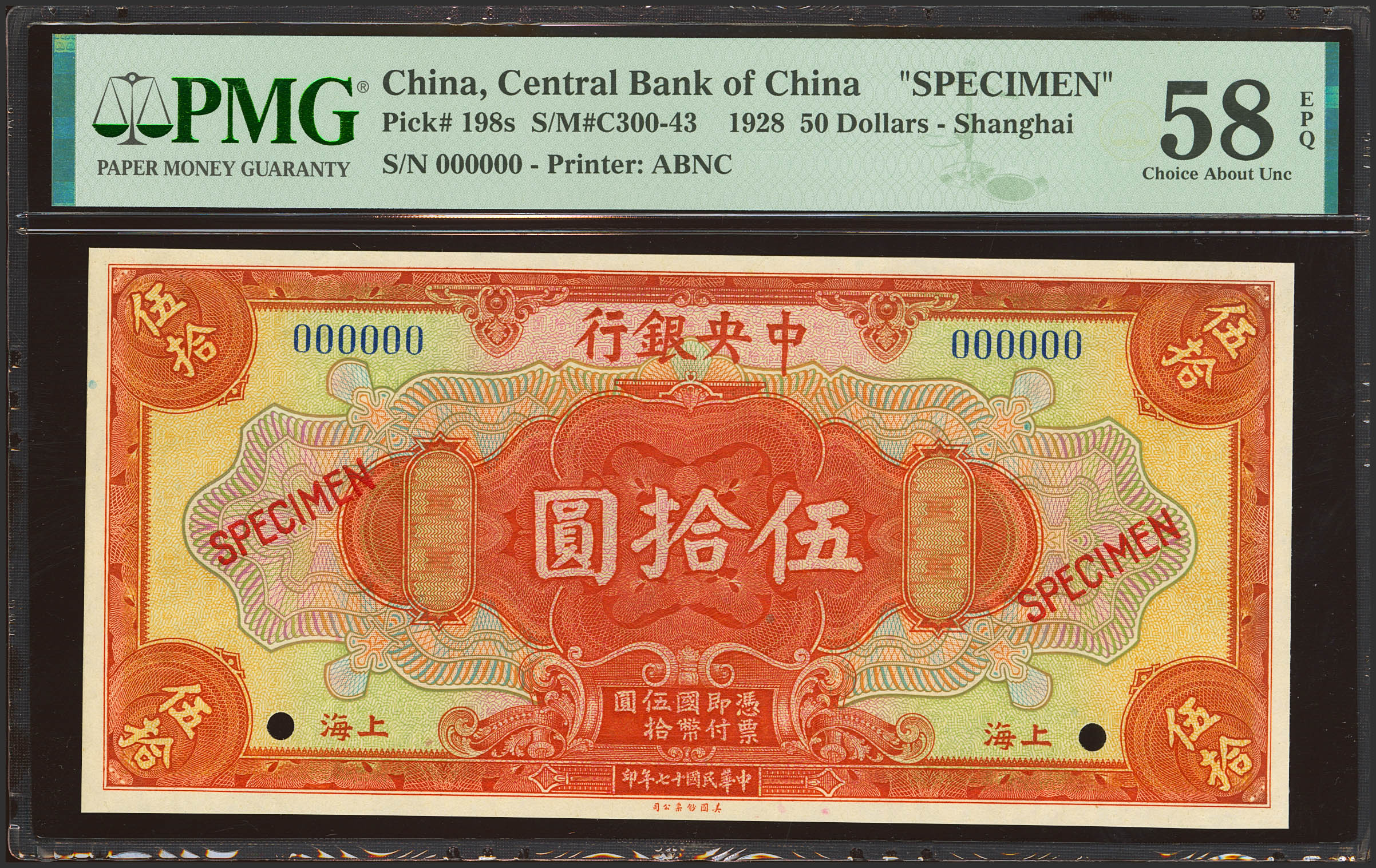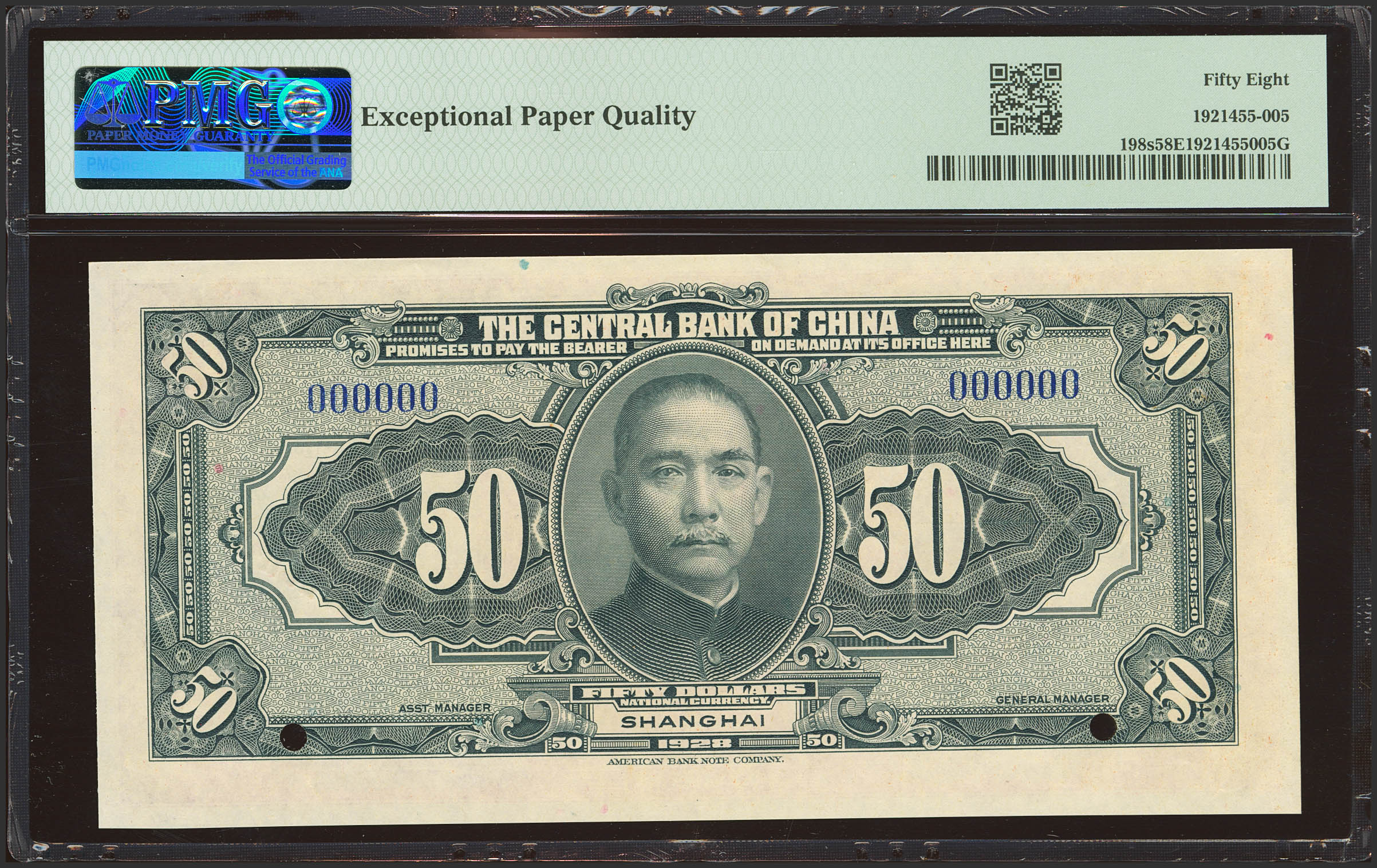 CHINA. 50 Dollars. 1928. Central Bank of China. Specimen. (Pick: 198s, SM: C300-43). PMG58EPQ.