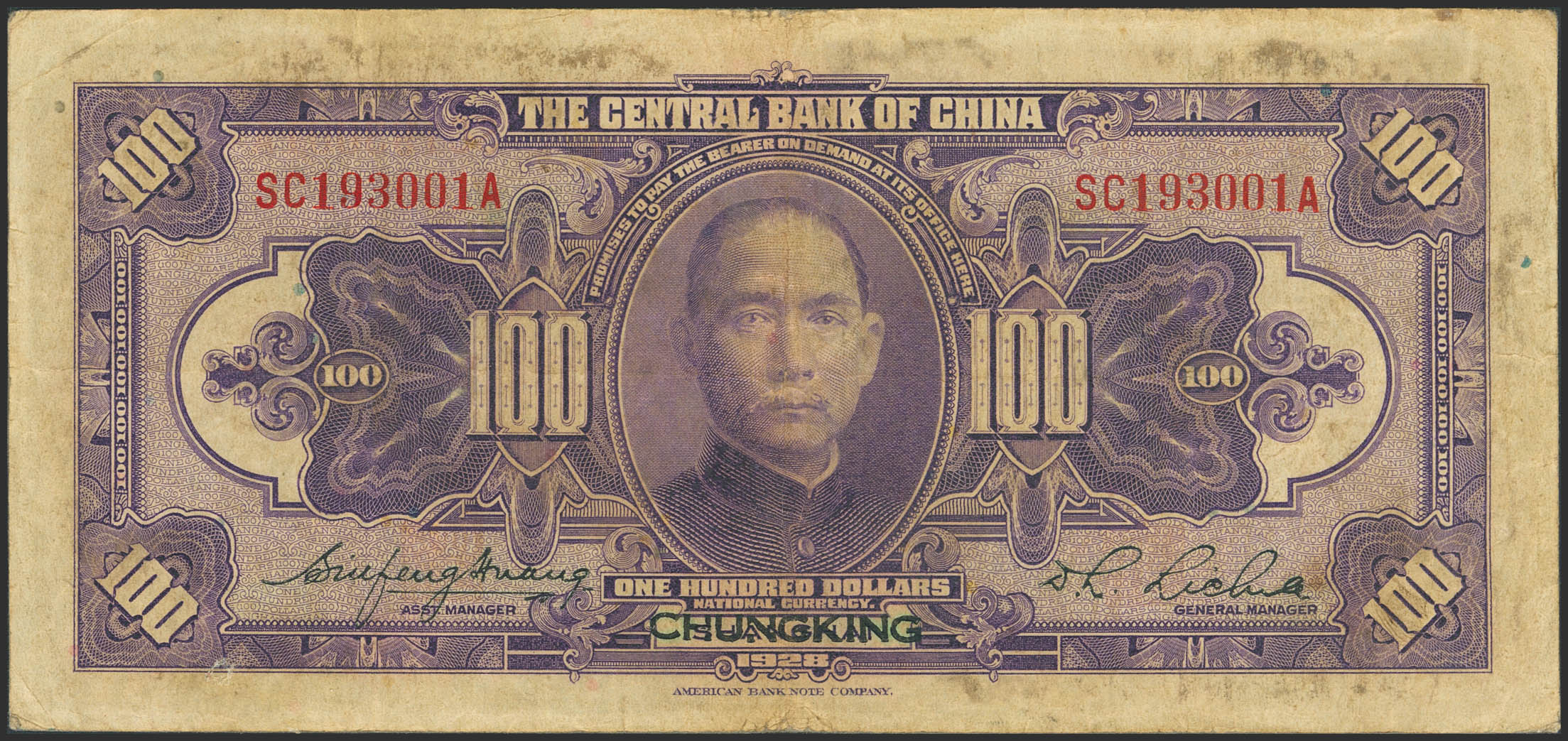 CHINA. 100 Dollars. 1928. Central Bank of China. Chungking. (Pick: 199c). Very Fine.
