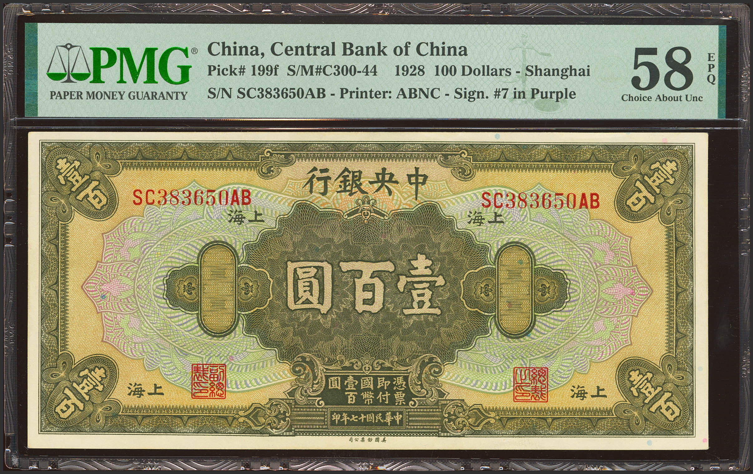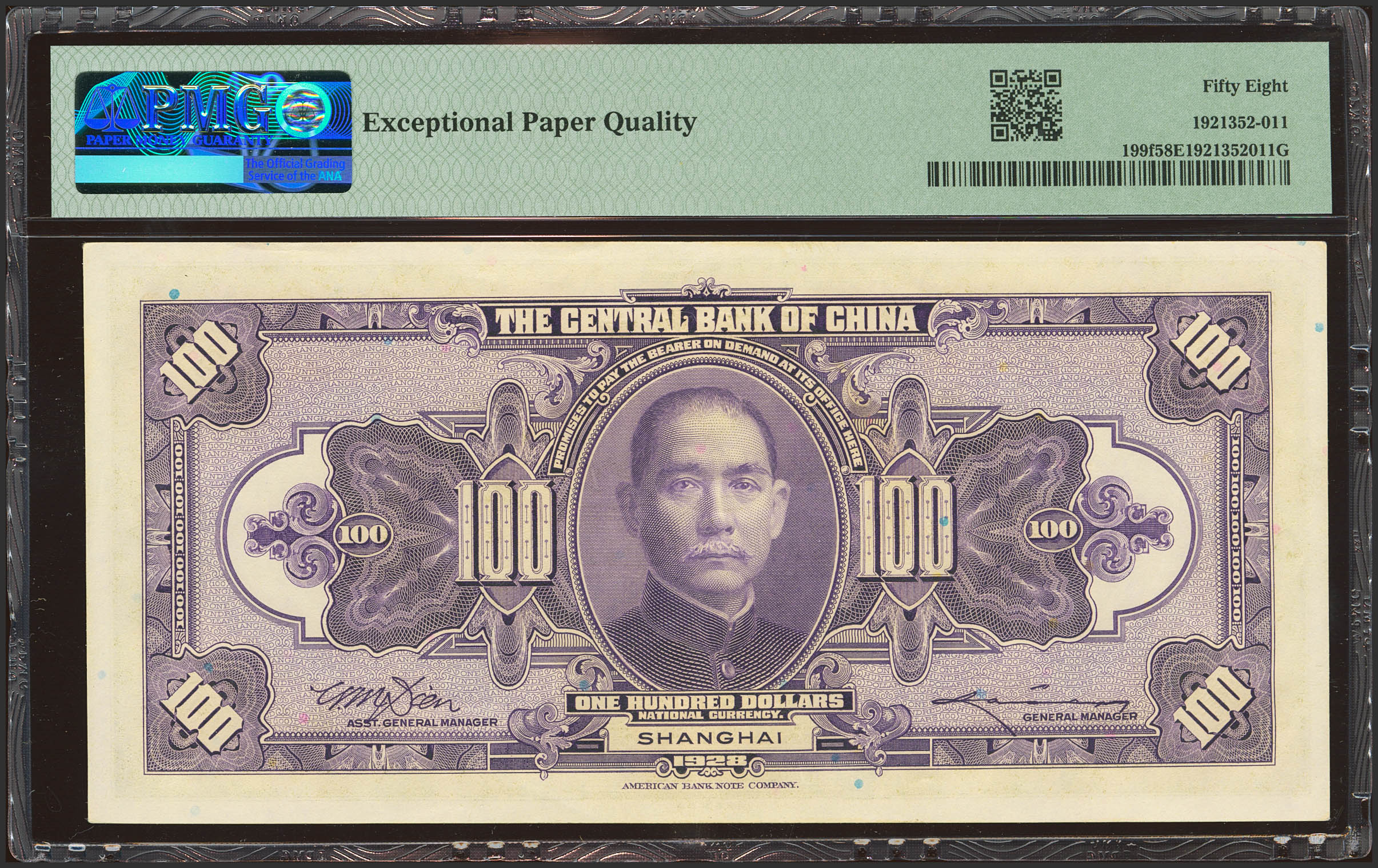 CHINA. 100 Dollars. 1928. Central Bank of China. Shanghai. (Pick: 199f, SM: C300-44). PMG58EPQ.