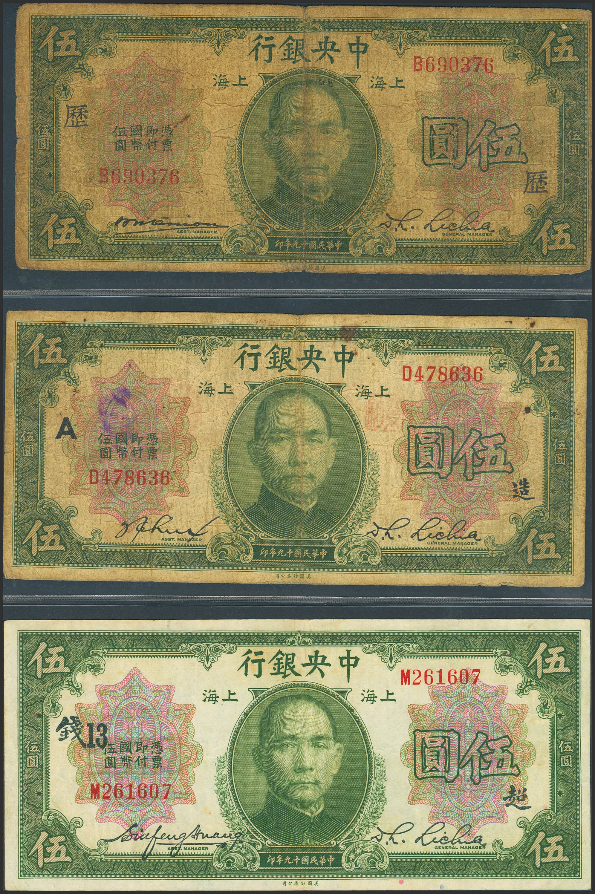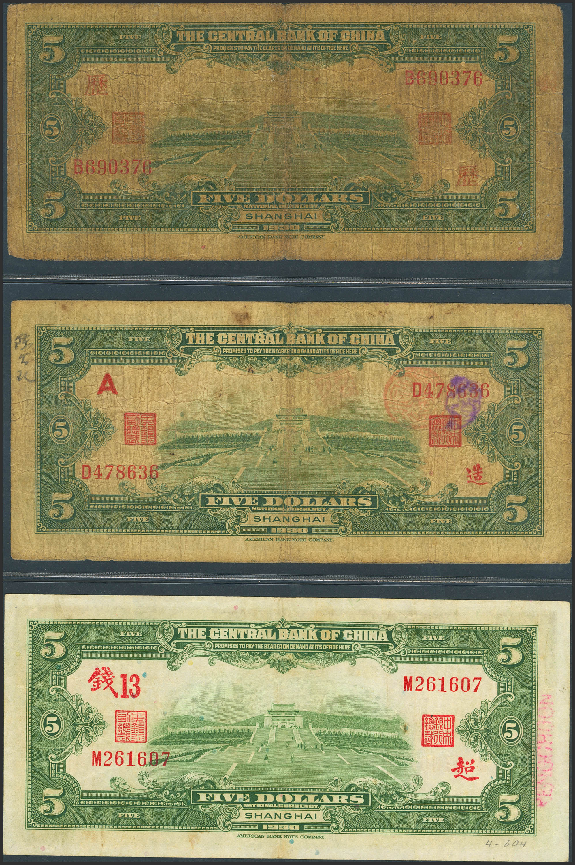 CHINA. Lot of 3 notes of 5 Dollars. 1930. Central Bank of China. (Pick: 200b(1), 200C(1), 200D(1)). Very Good (1), Fine (1), Extremely Fine (1).