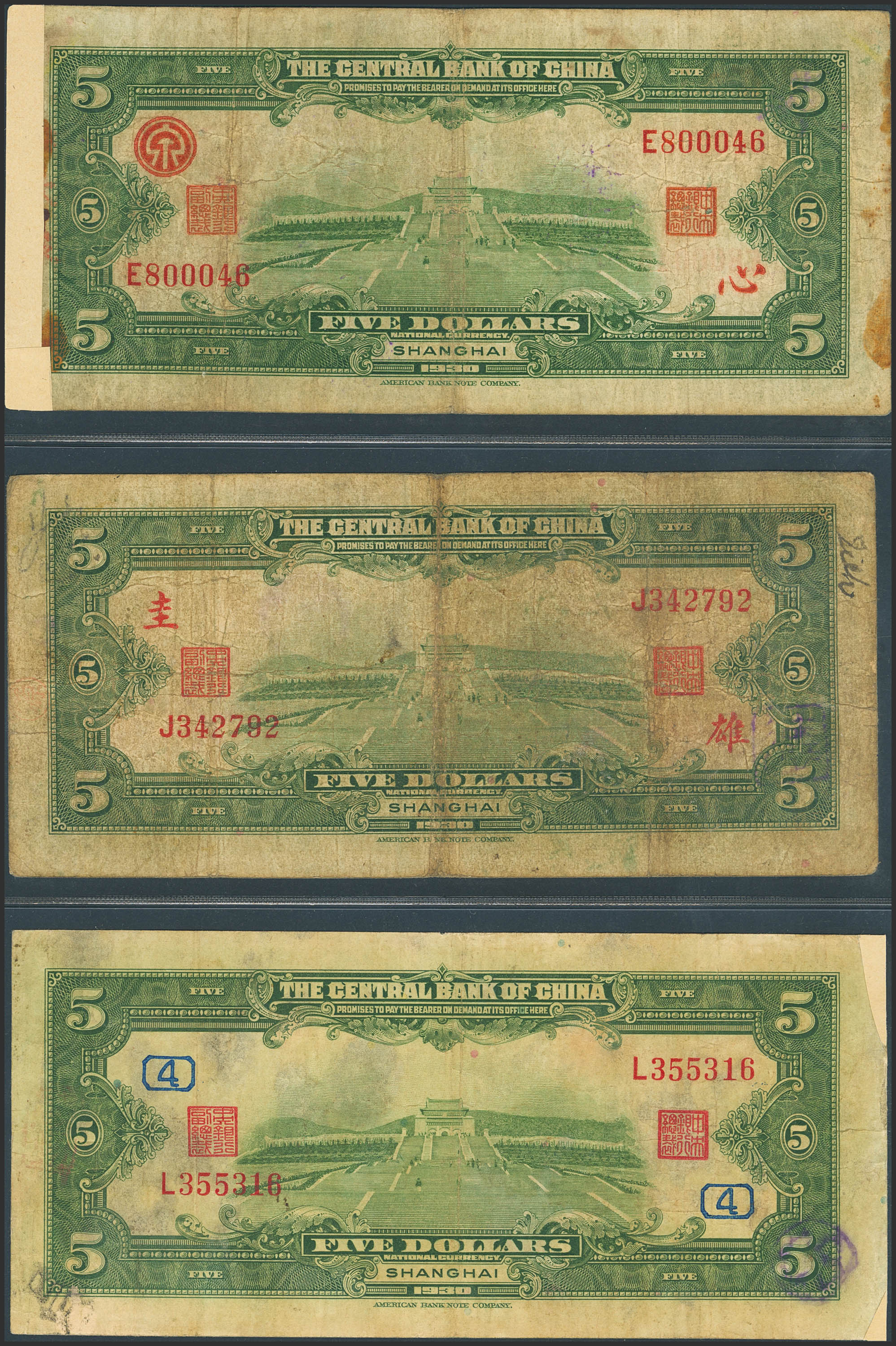 CHINA. Lot of 3 notes of 5 Dollars. 1930. Central Bank of China. (Pick: 200a). Paper affixed in areas where paper is missing. Fine.