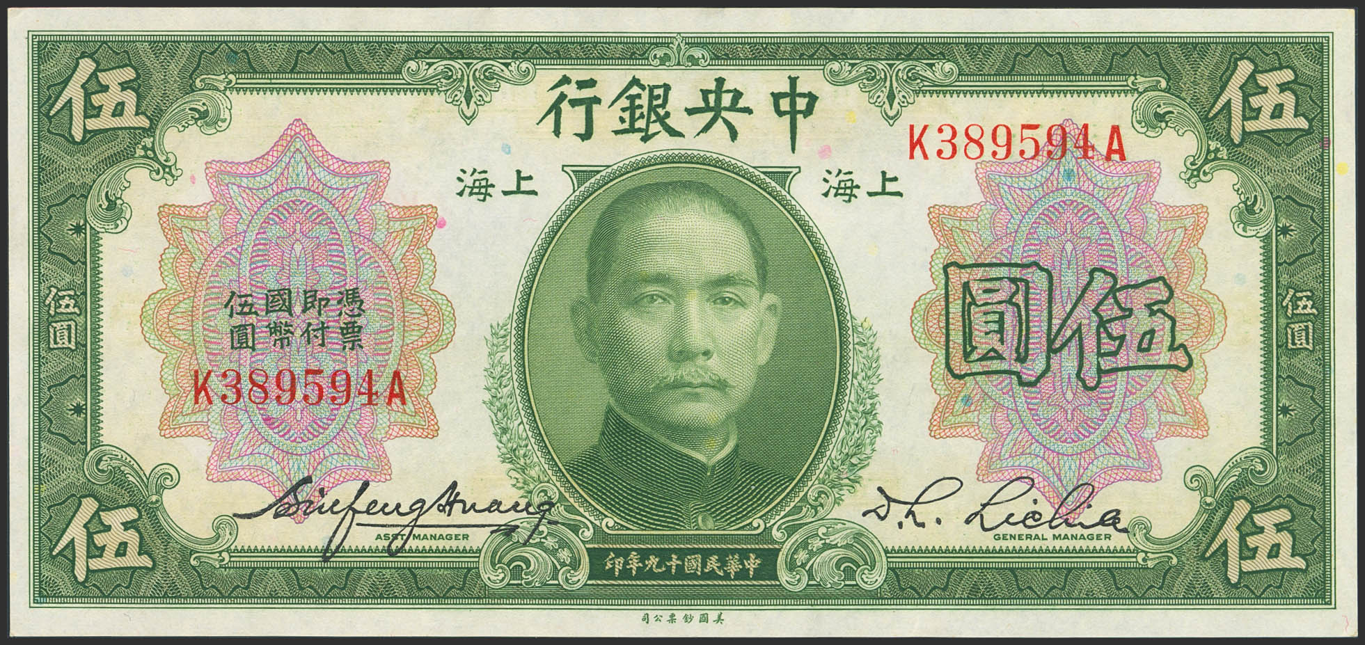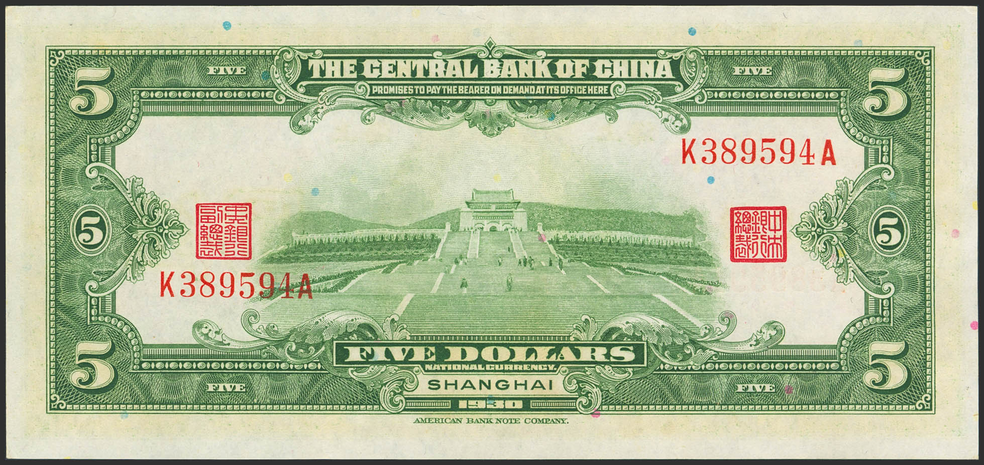CHINA. 5 Dollars. 1930. Central Bank of China. (Pick: 200d). Almost Uncirculated.