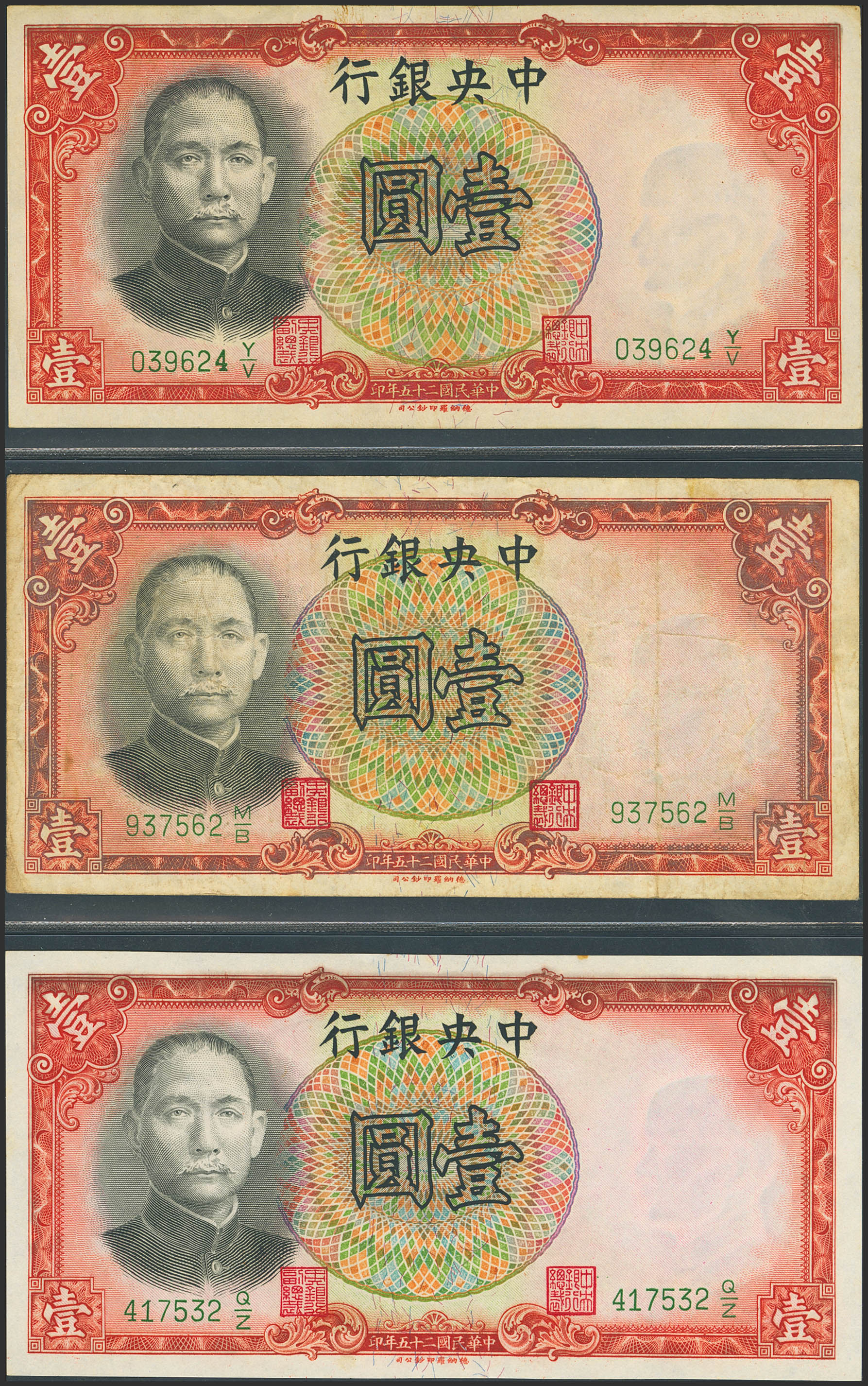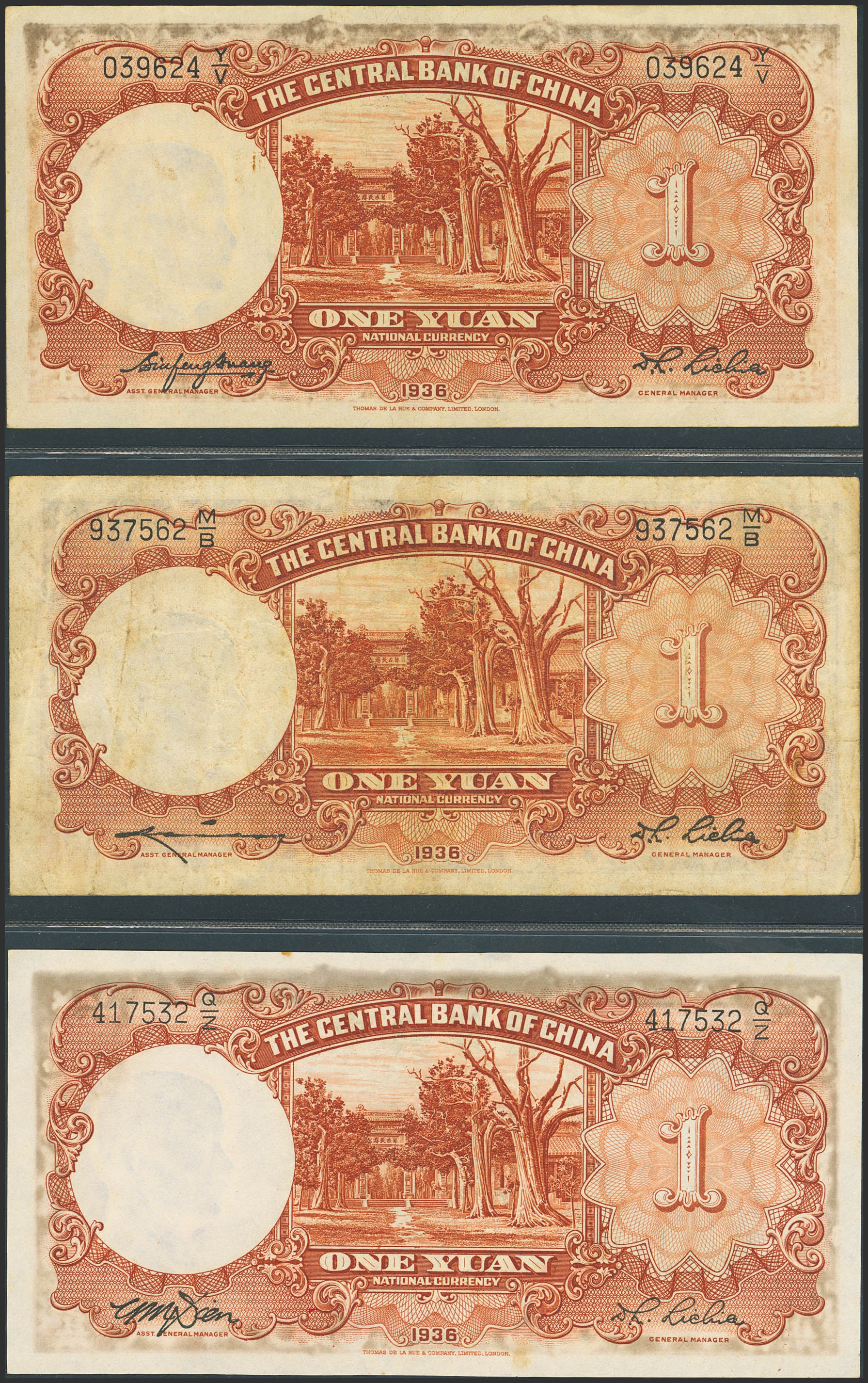 CHINA. Lot of 3 notes of 1 Yuan. 1936. Central Bank of China. All sub-references of the reference. (Pick: 212). Very Fine, Extremely Fine and Uncirculated.