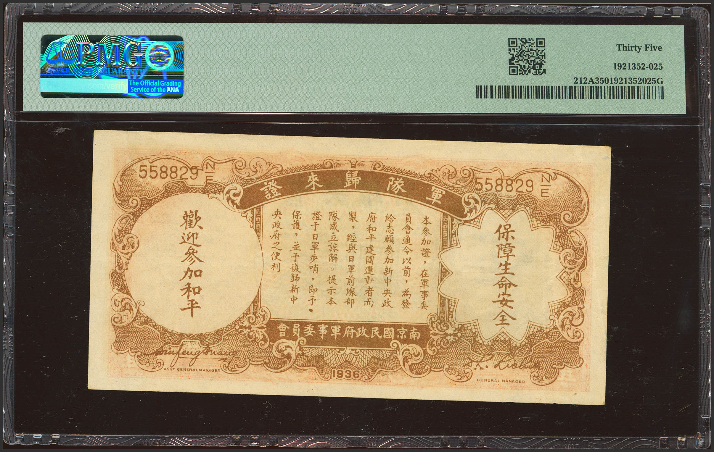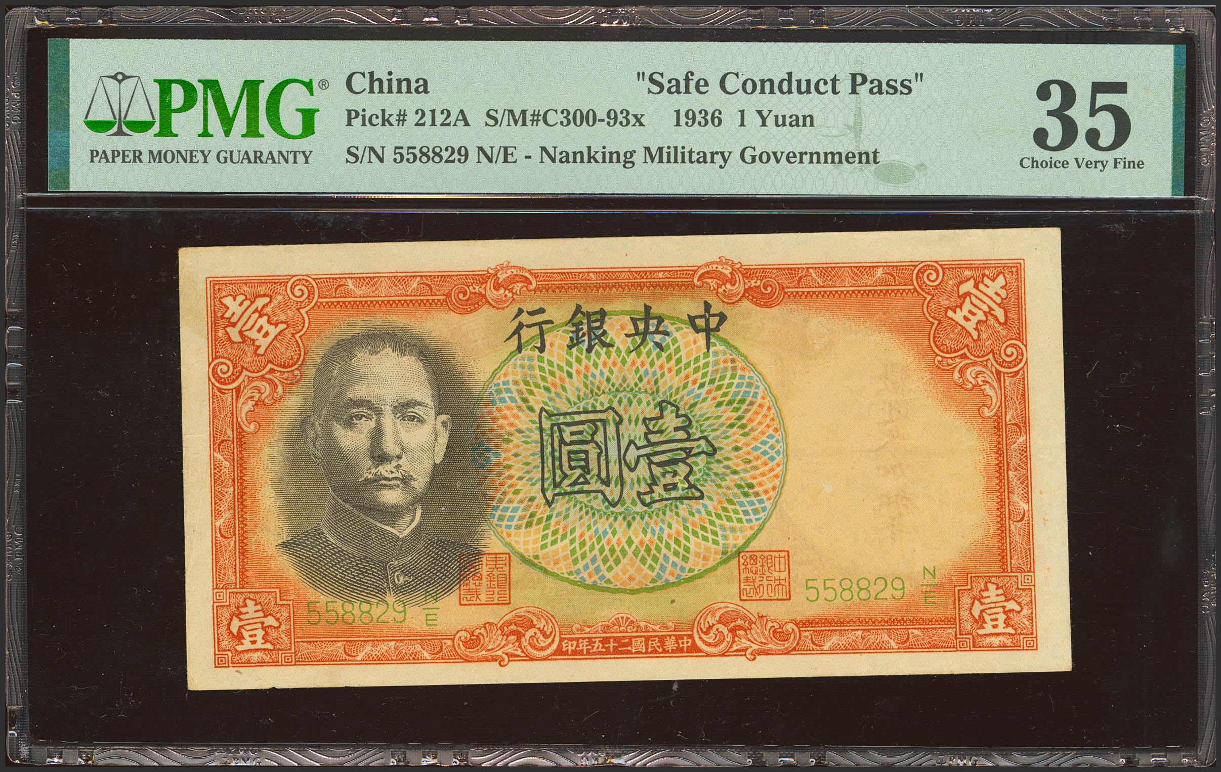 CHINA. 1 Yuan. 1936. Central Bank of China. Safe Contuct Pass. (Pick: 212A, SM: C300-93x). PMG35.