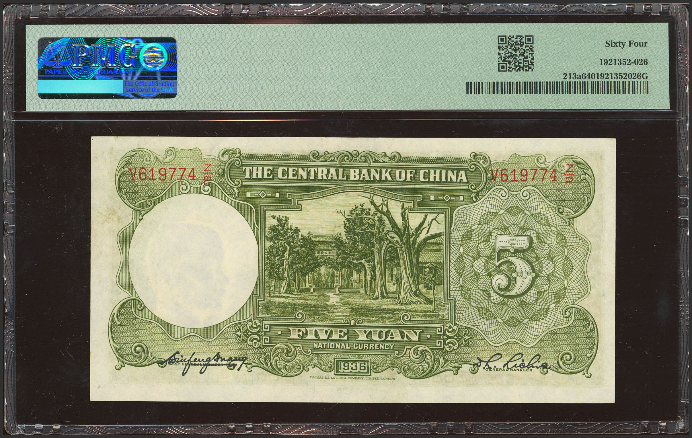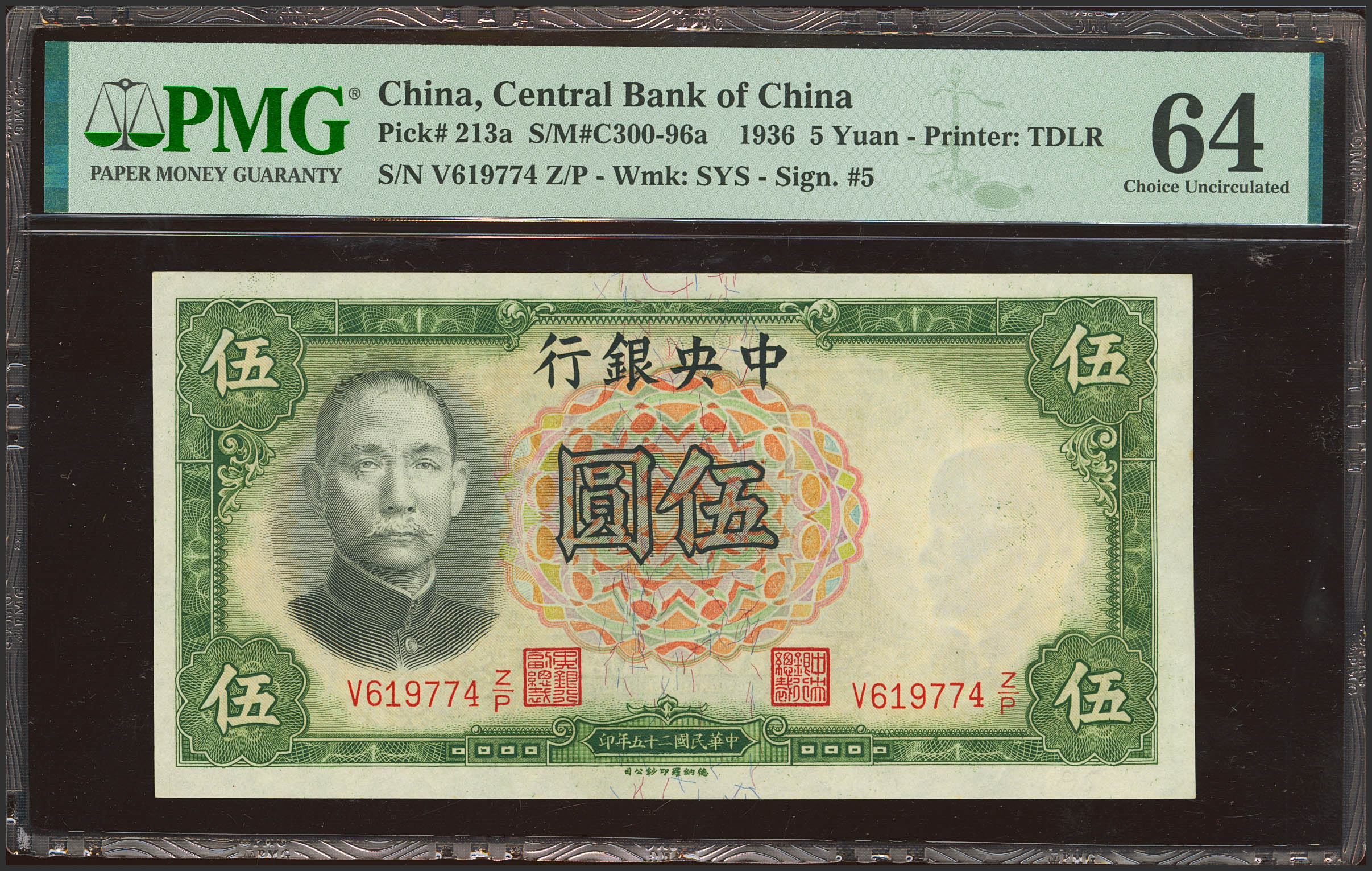 CHINA. 5 Yuan. 1936. Central Bank of China. (Pick: 213a, SM: C300-96a). PMG64.