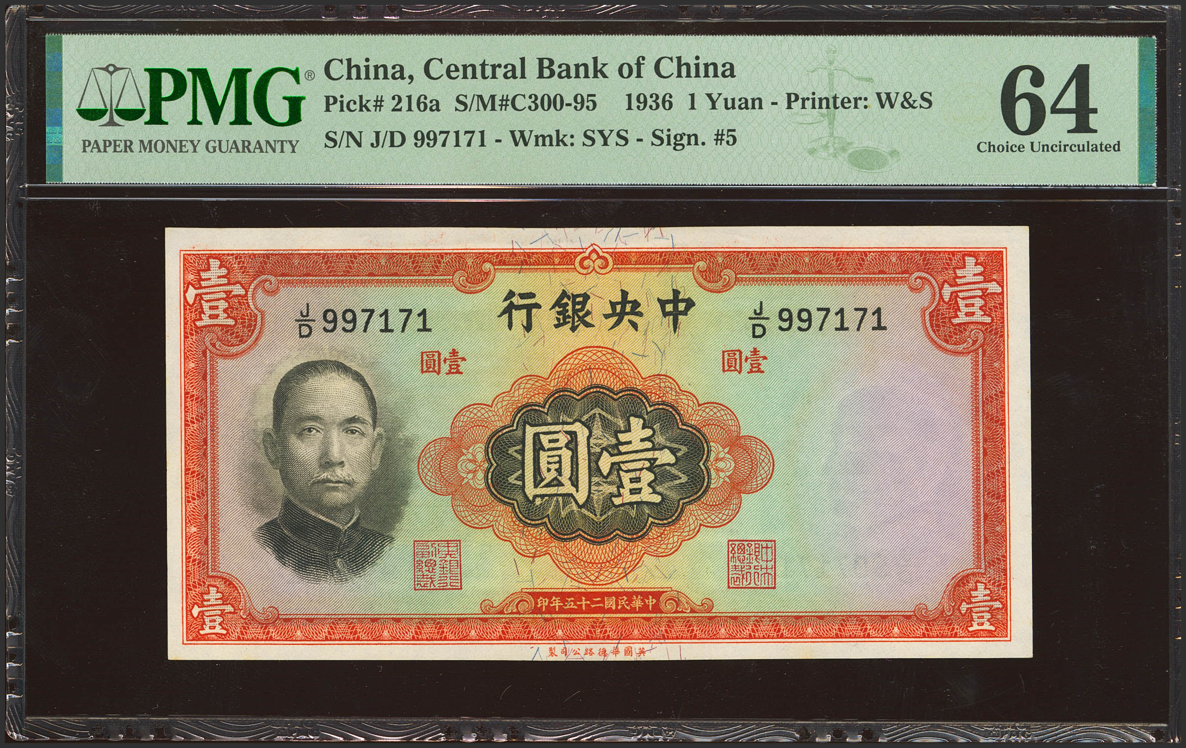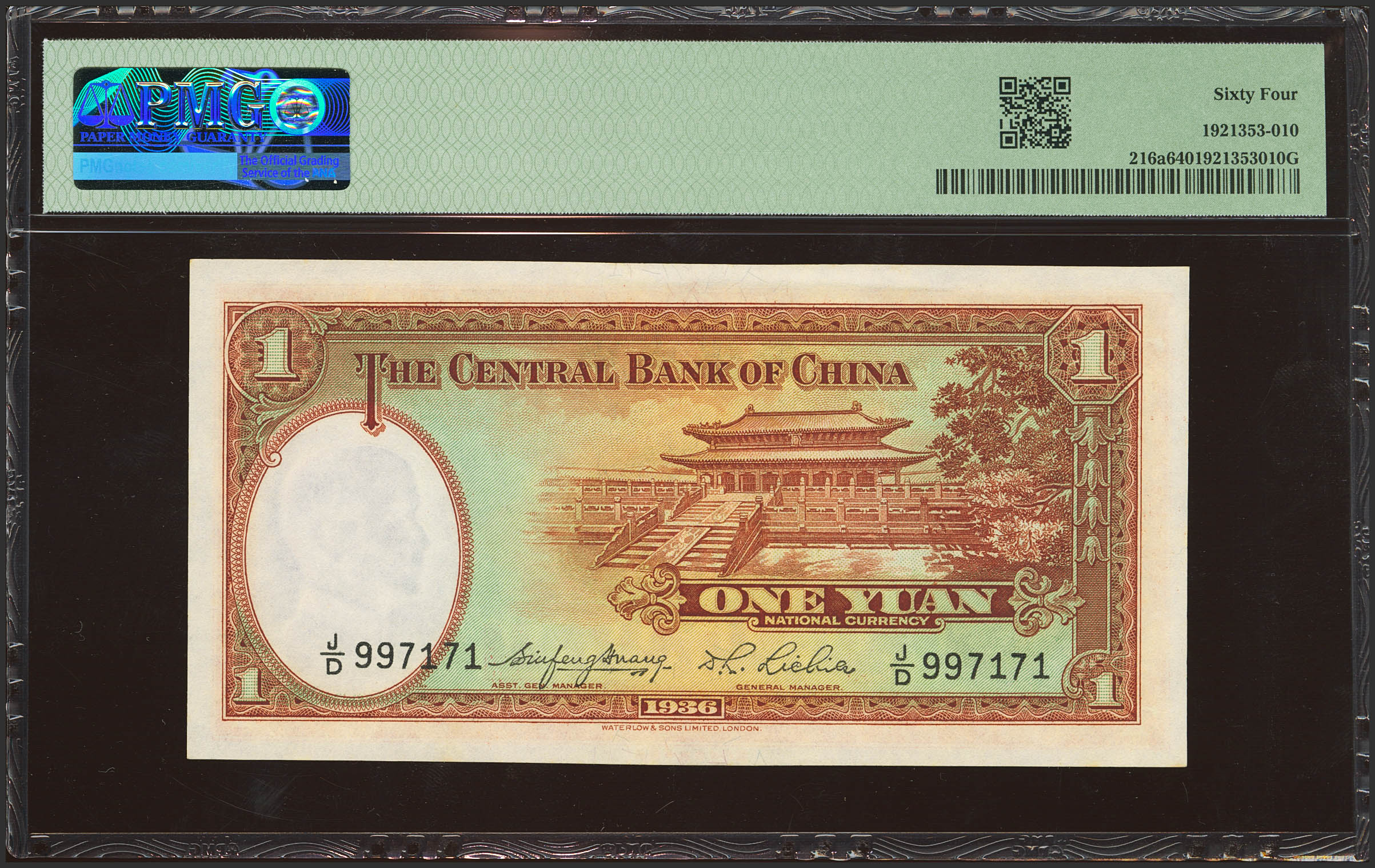 CHINA. 1 Yuan. 1936. Central Bank of China. (Pick: 216a, SM: 300-95). PMG64.