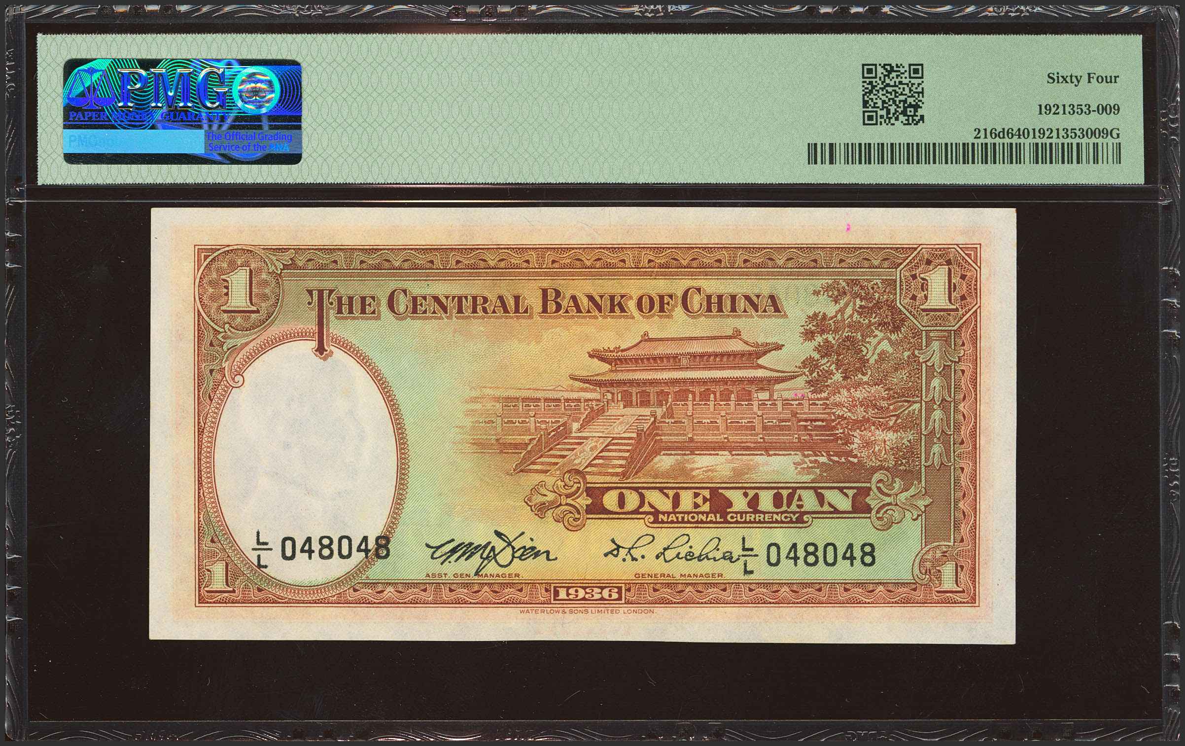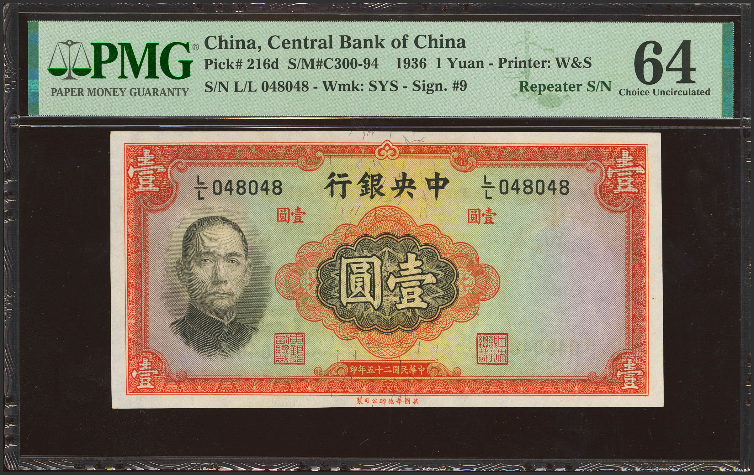 CHINA. 1 Yuan. 1936. Central Bank of China. (Pick: 216d, SM:, C300-94). PMG64.