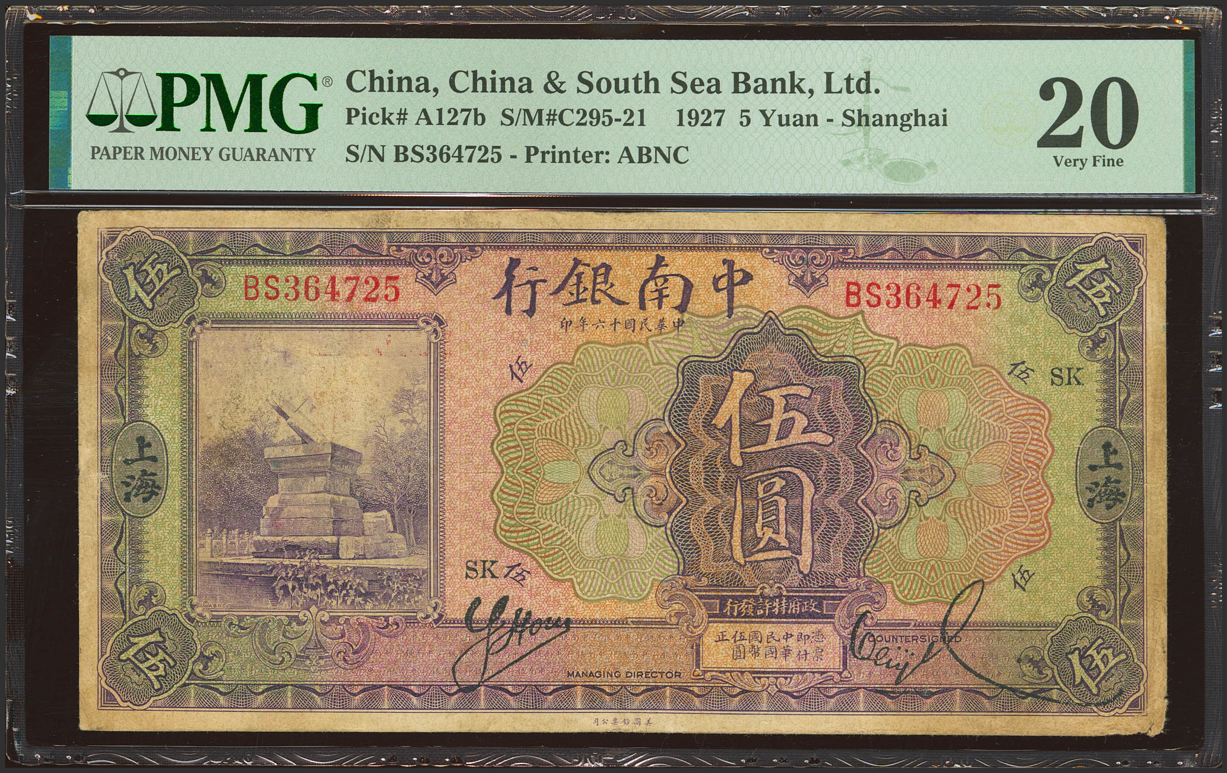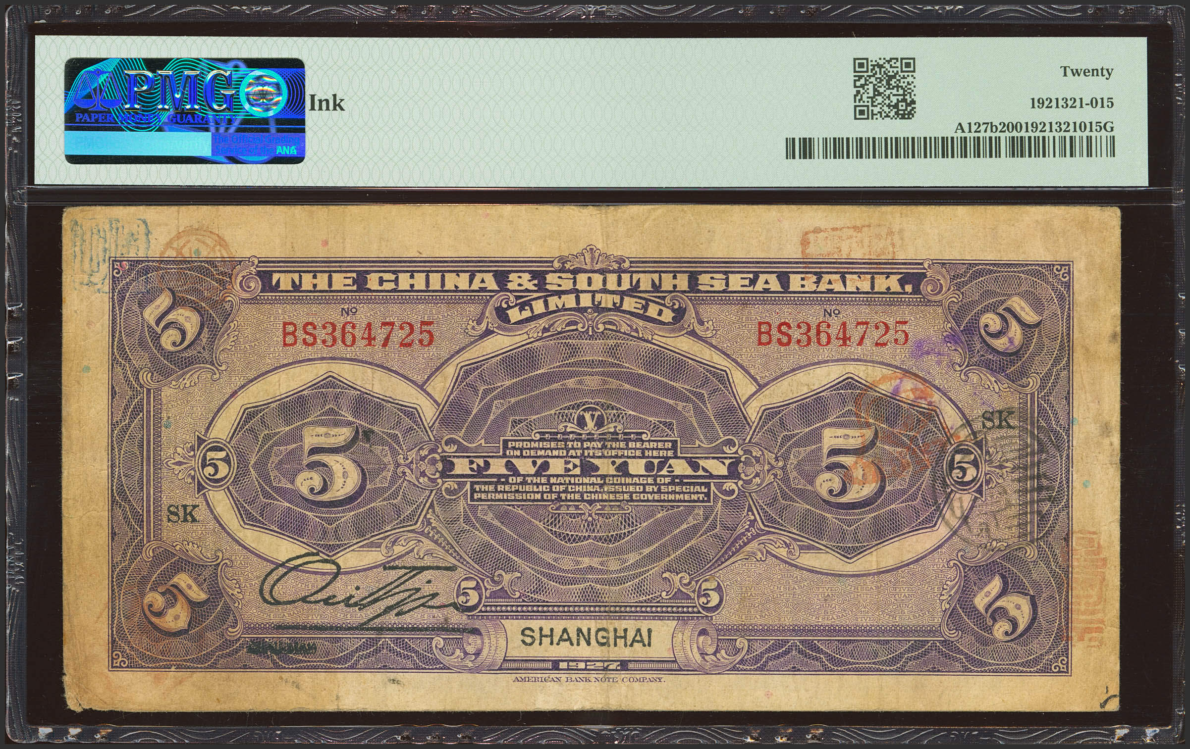 CHINA. 5 Yuan. 1927. China and South Sea Bank. Shanghai. Purple color on front and back (Variant not listed). (Pick: A127b, SM: C295-21). PMG20 (ink).