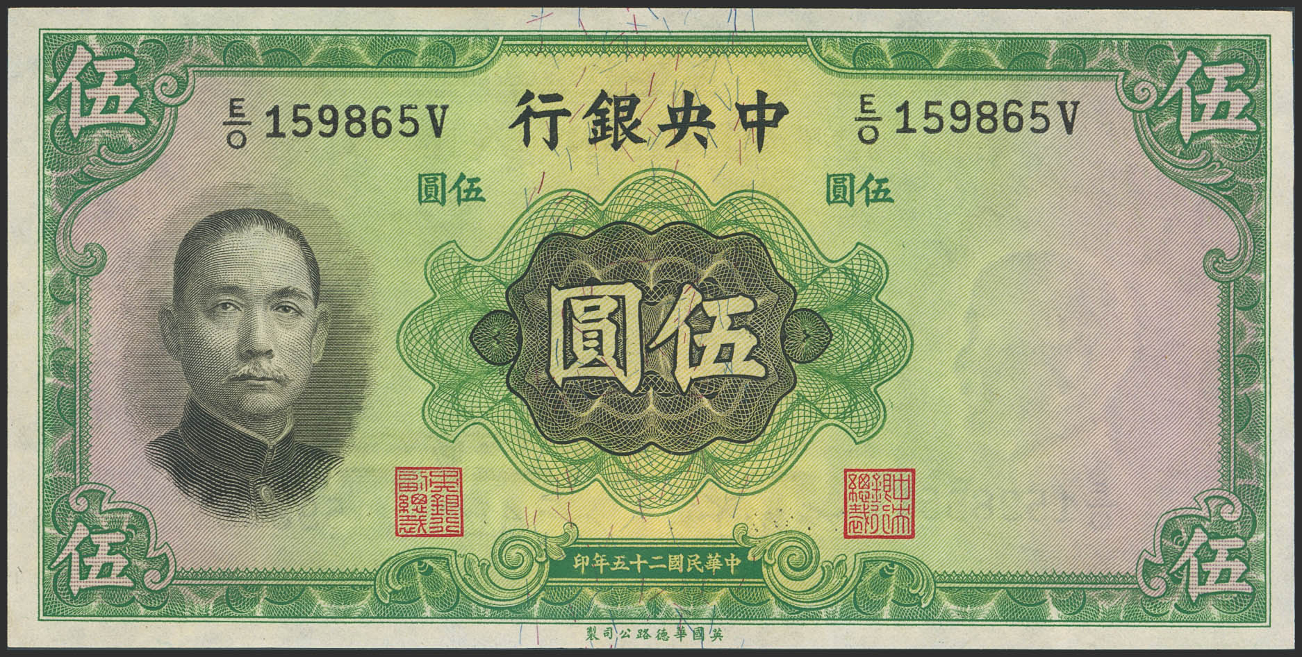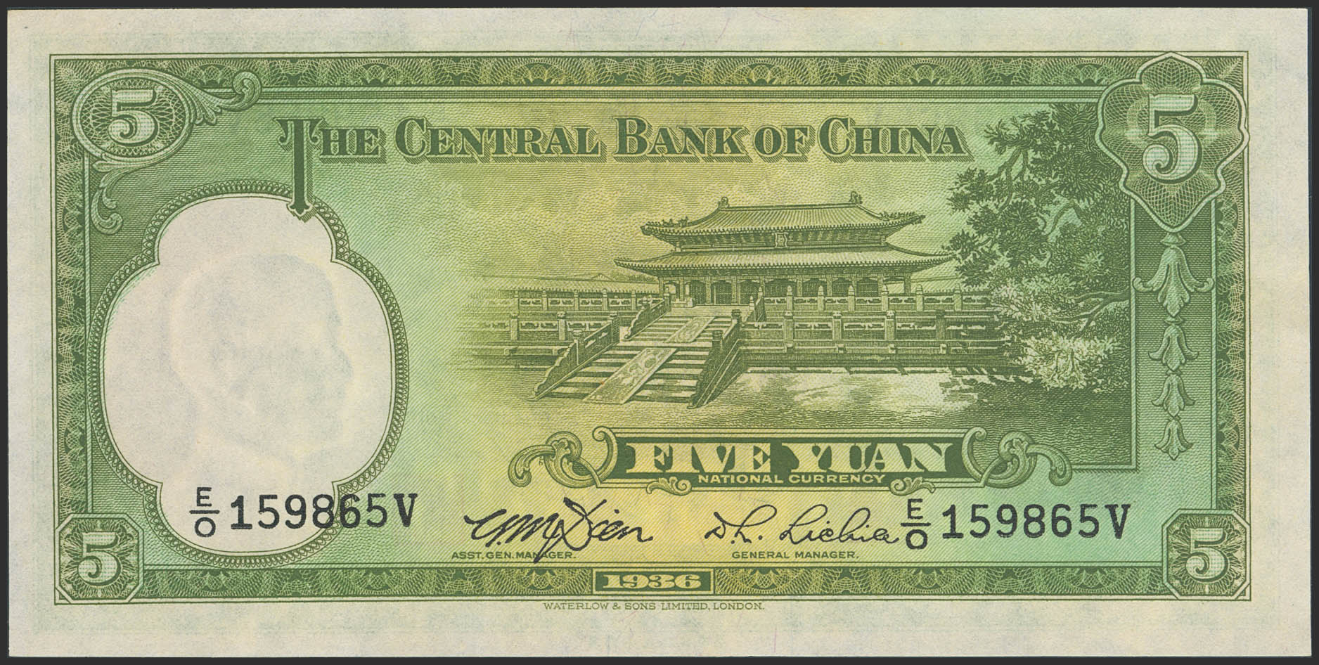 CHINA. 5 Yuan. 1936. Central Bank of China. (Pick: 217c). Uncirculated.