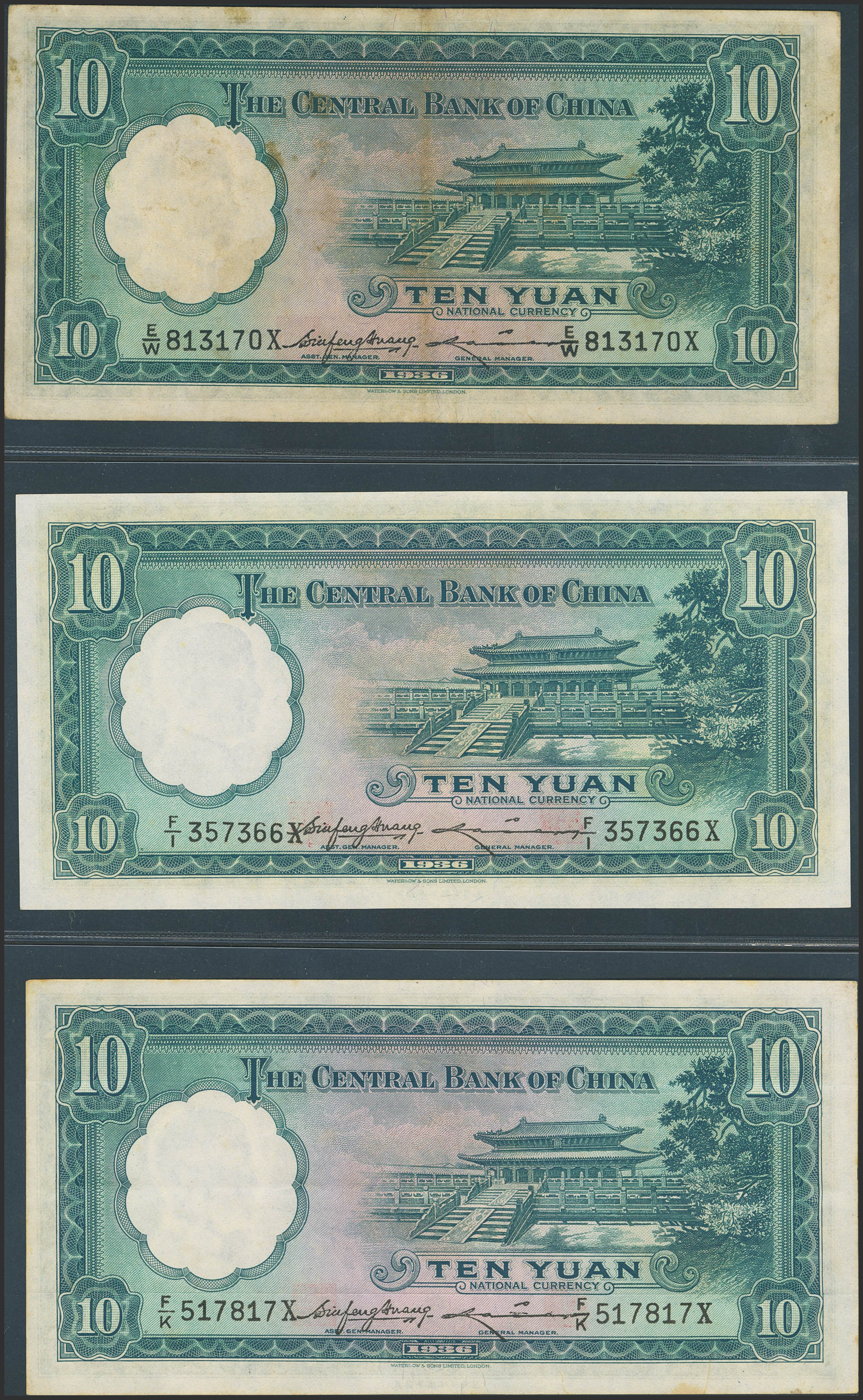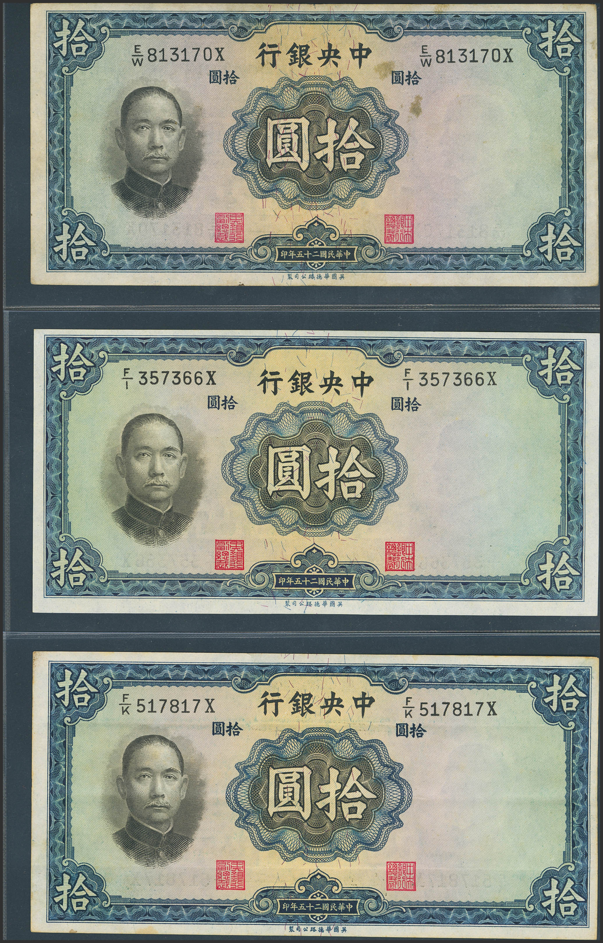 CHINA. Lot of 3 notes of 10 Yuan. 1936. Central Bank of China. (Pick: 218b). Very Fine to Less than Uncirculated.
