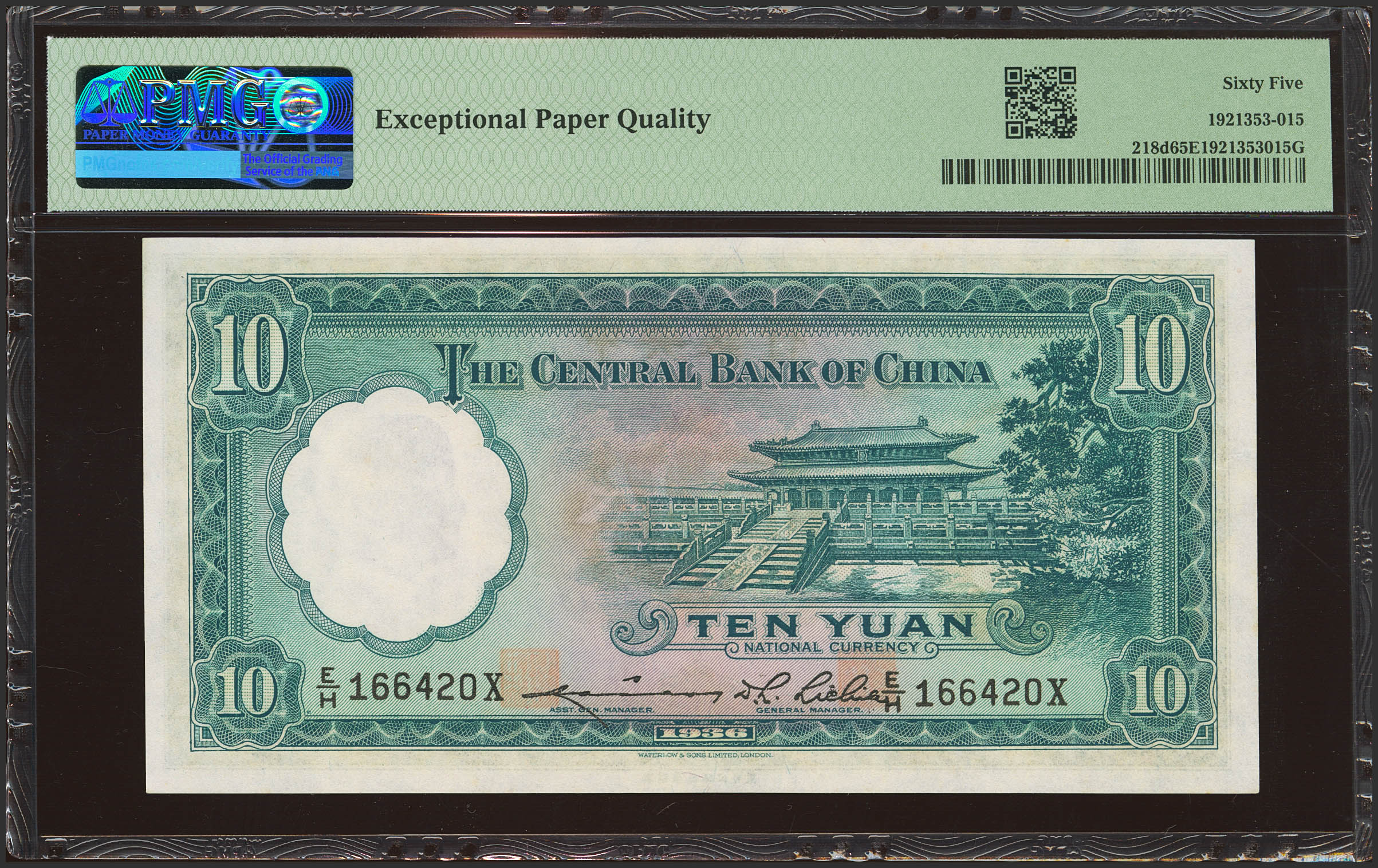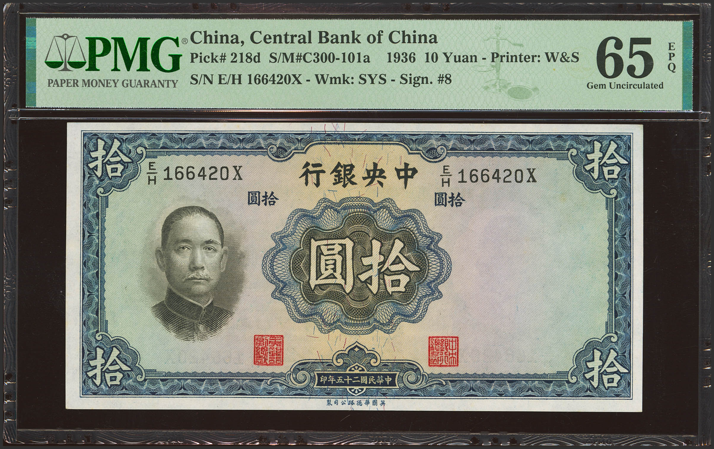 CHINA. 10 Yuan. 1936. Central Bank of China. (Pick: 218d, SM: C300-101a). PMG65EPQ.