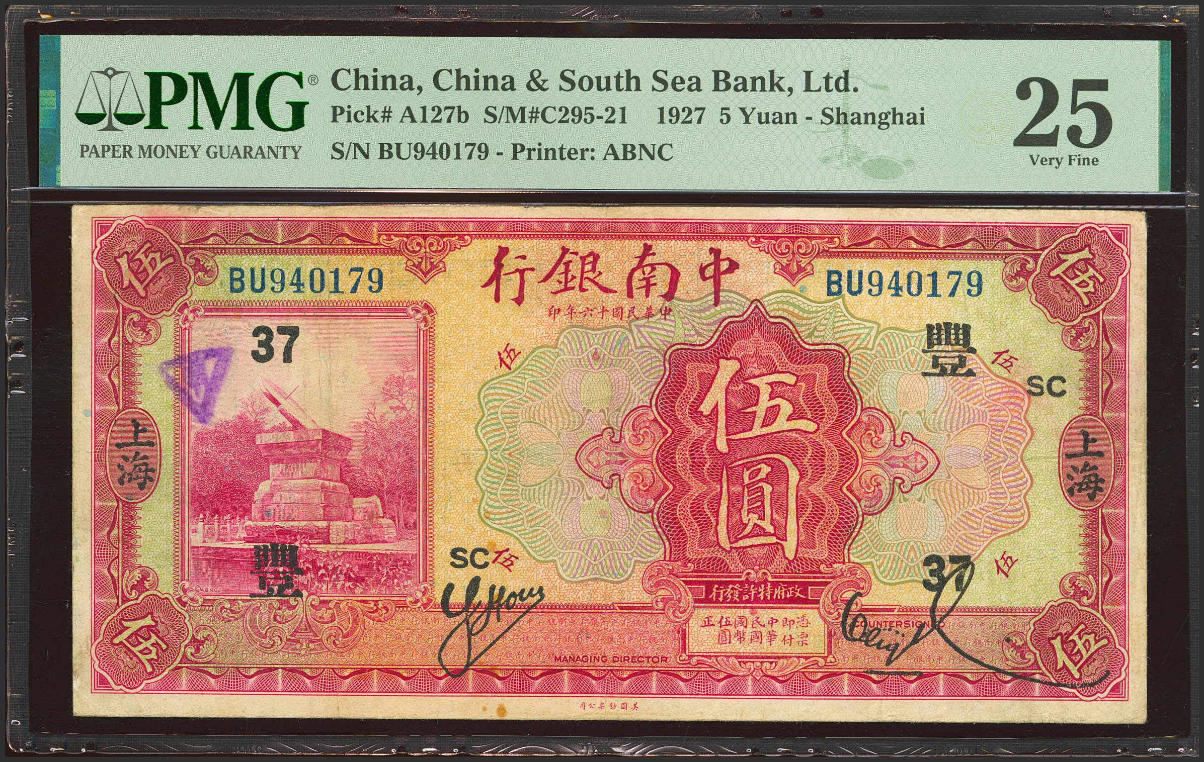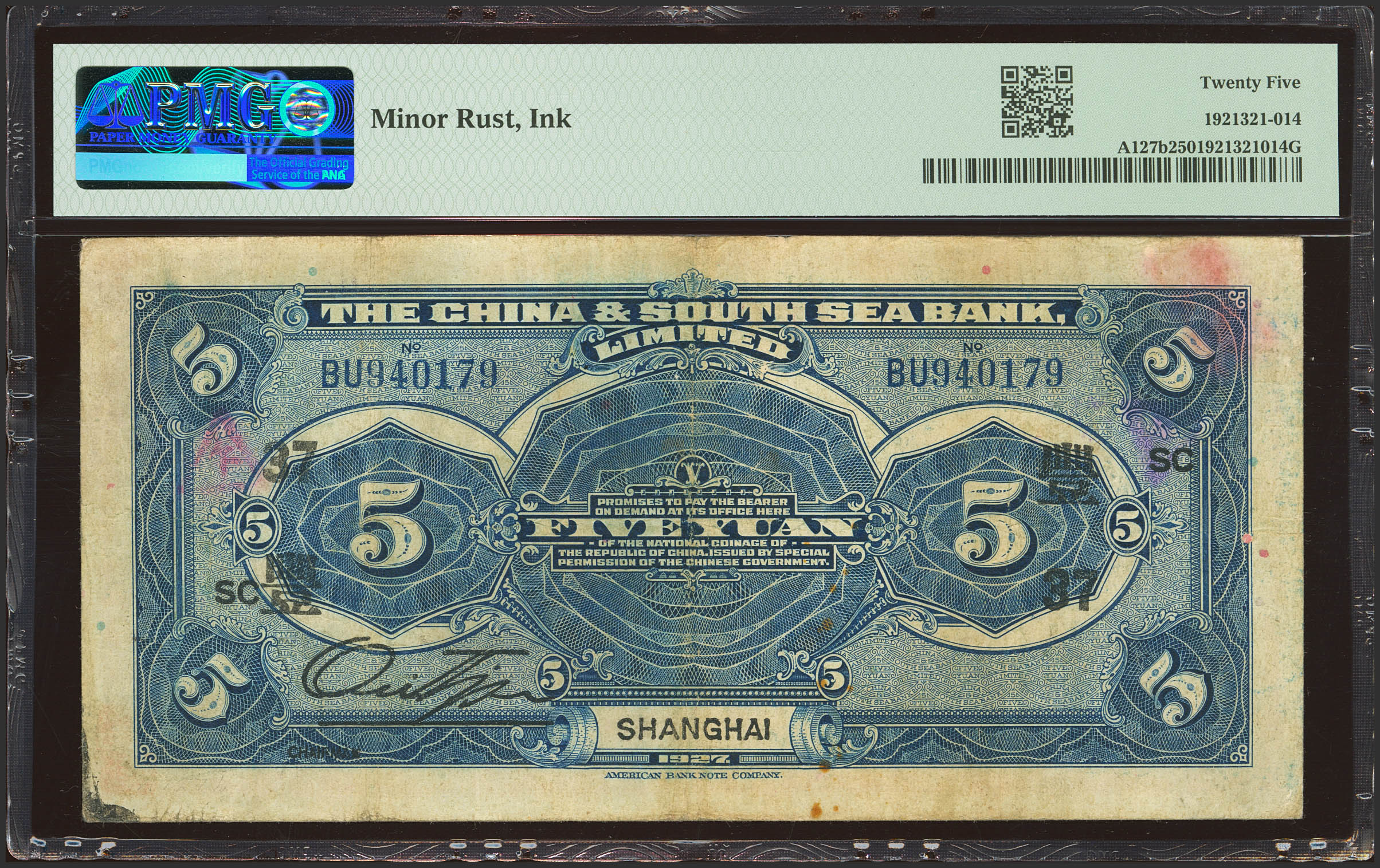CHINA. 5 Yuan. 1927. China and South Sea Bank. Shanghai. (Pick: A127b, SM: C295-21). PMG25 (minor rust, ink).
