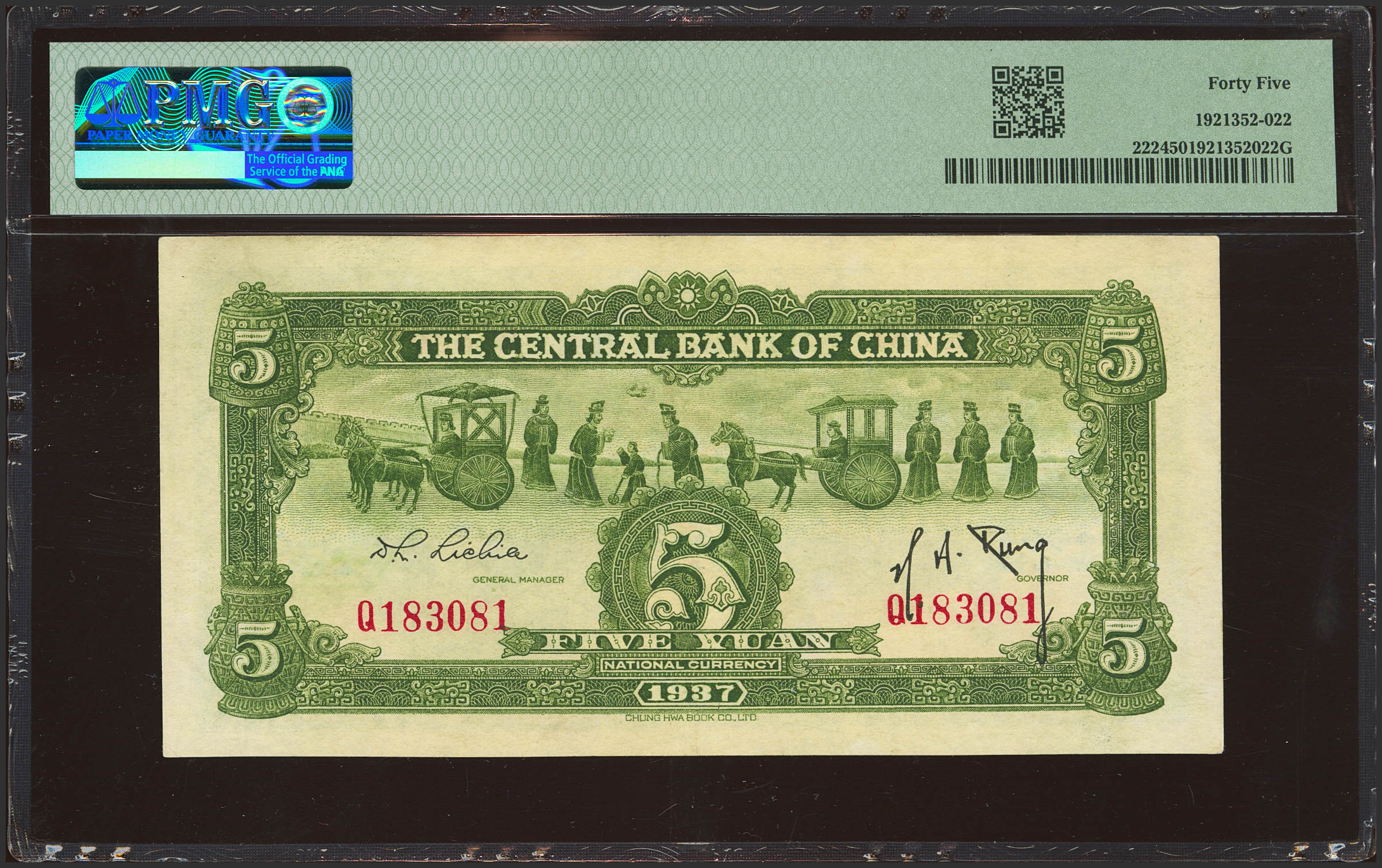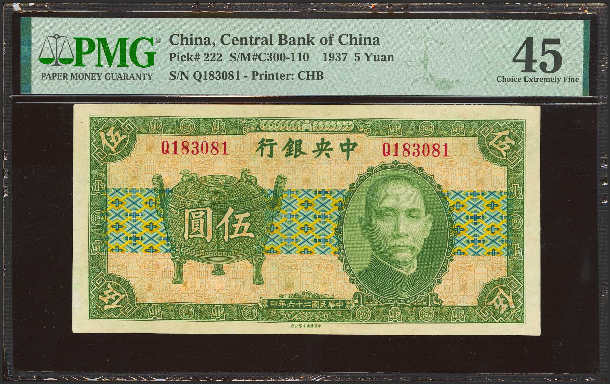 CHINA. 5 Yuan. 1937. Central Bank of China. (Pick: 222, SM: C300-110). PMG45.