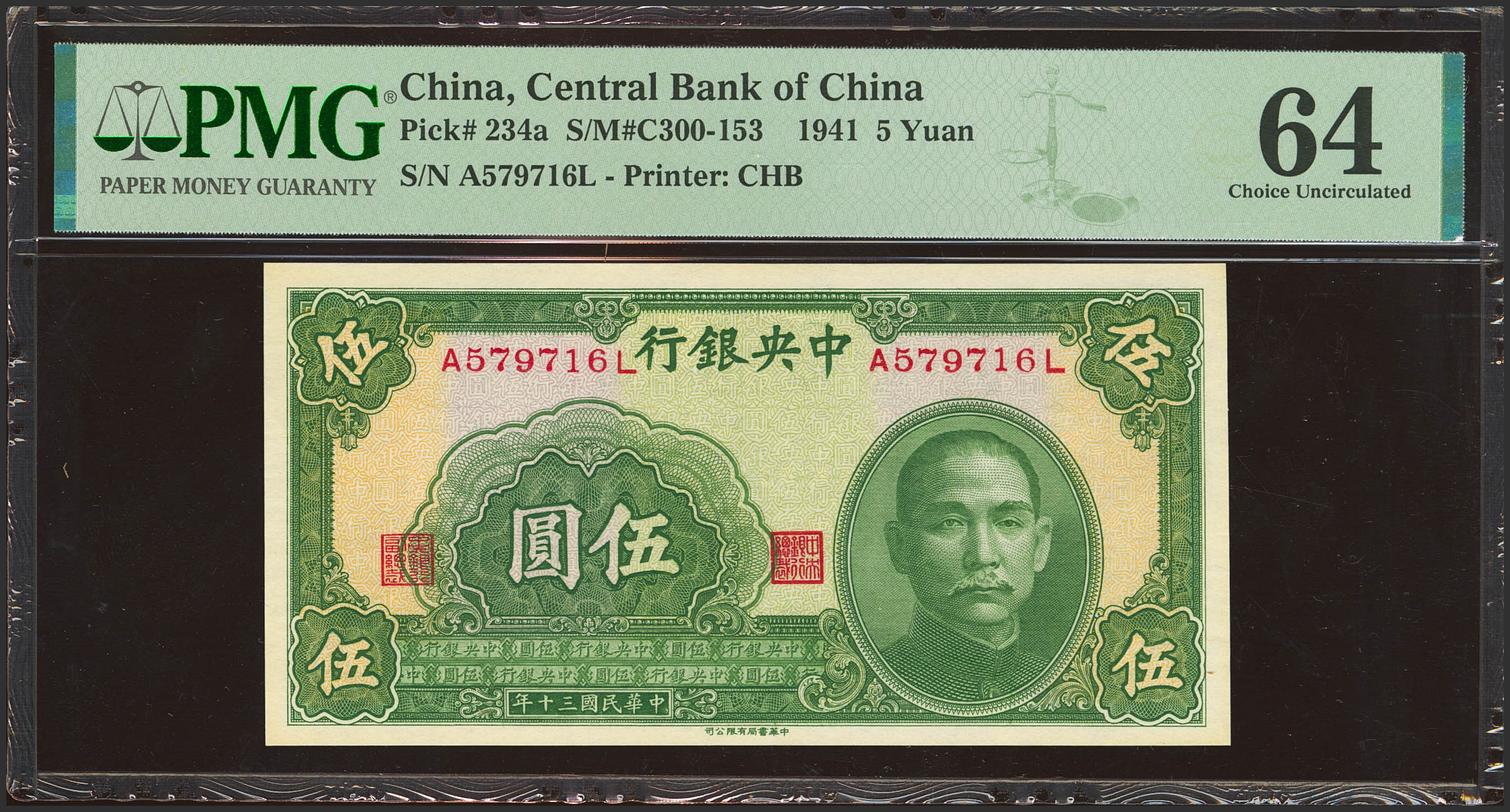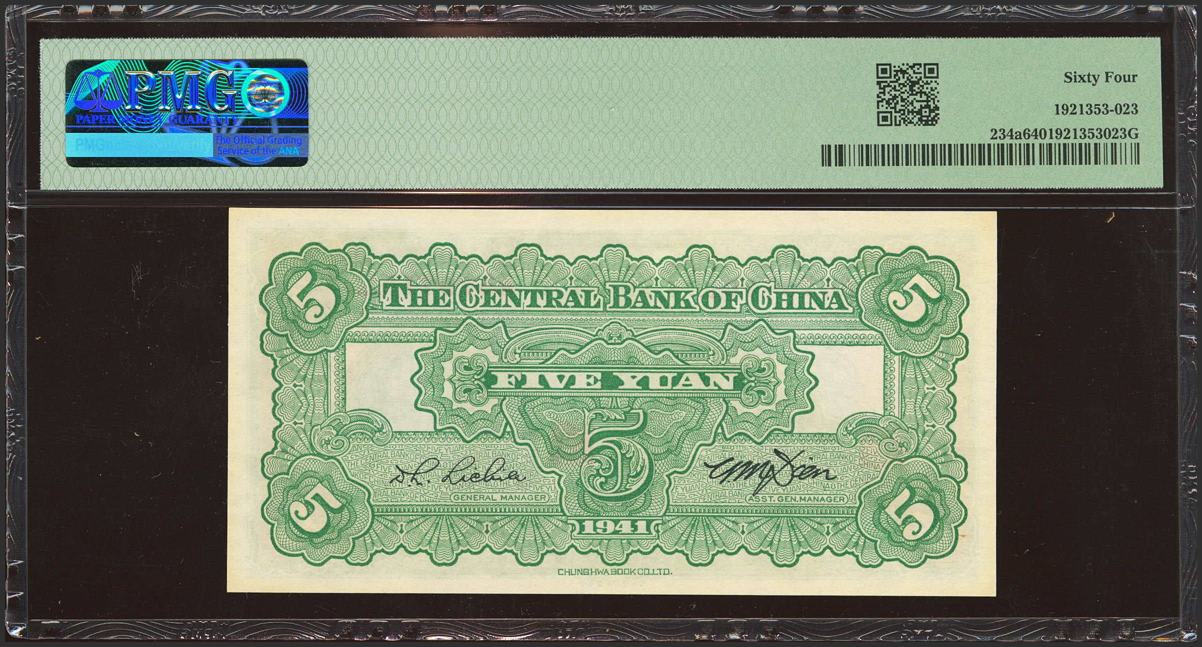 CHINA. 5 Yuan. 1941. Central Bank of China. (Pick: 234a, SM: C300-153). PMG64.