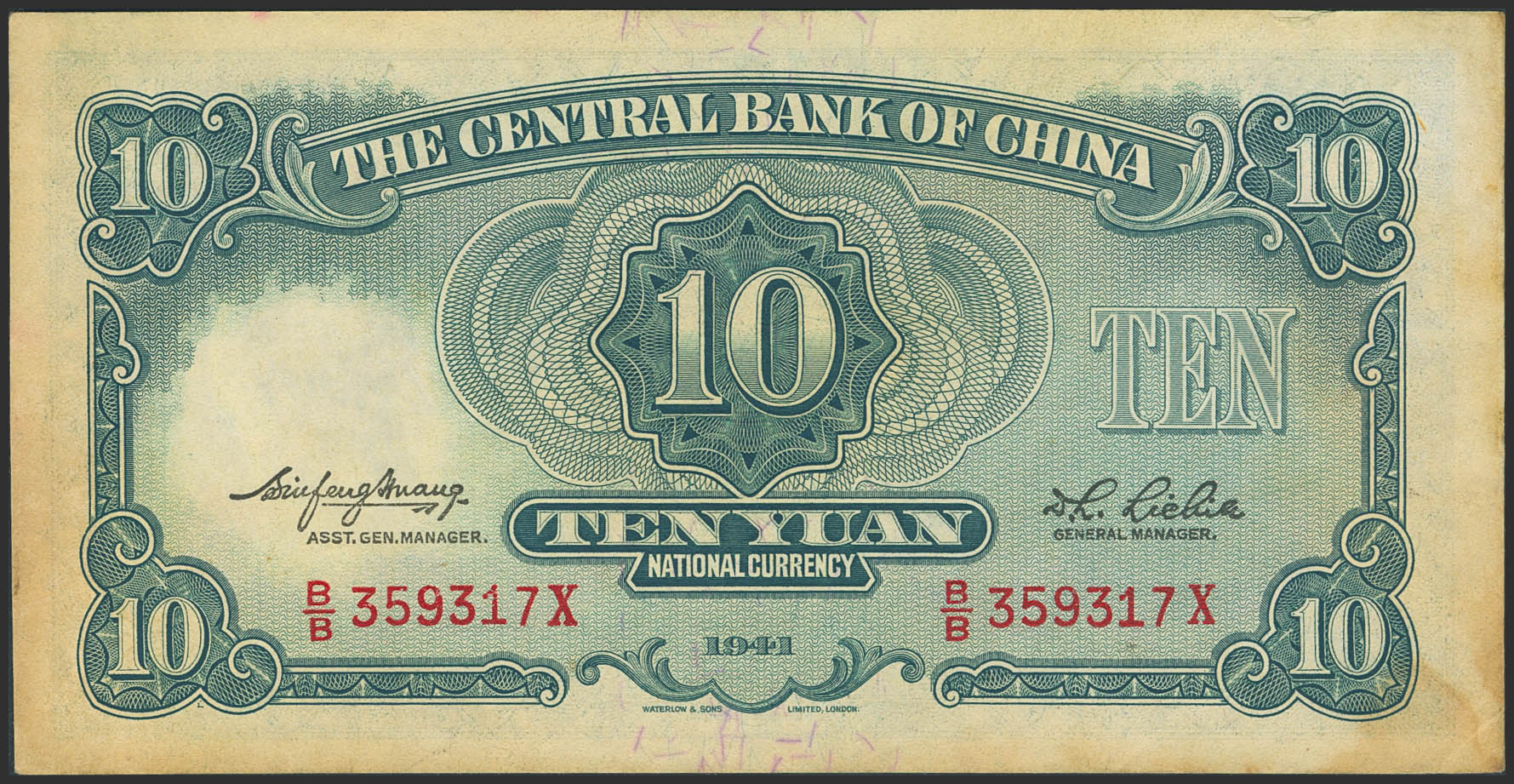 CHINA. 10 Yuan. 1941. Central Bank of China. (Pick: 237a). Less than Uncirculated.
